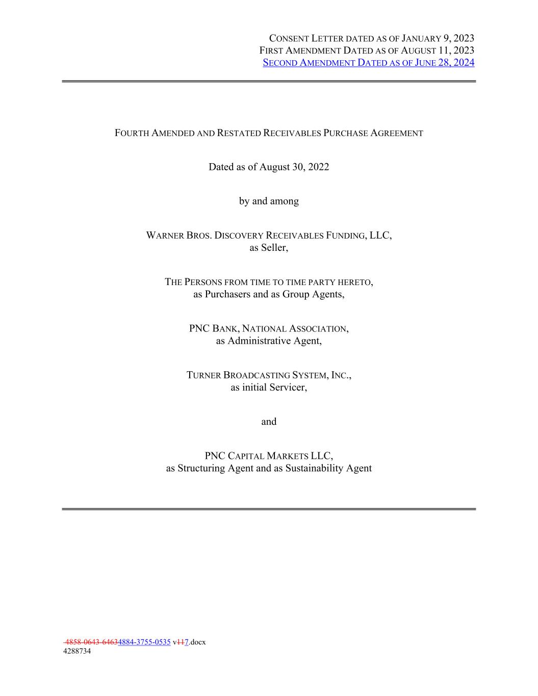 CONSENT LETTER DATED AS OF JANUARY 9, 2023 FIRST AMENDMENT DATED AS OF AUGUST 11, 2023 SECOND AMENDMENT DATED AS OF JUNE 28, 2024 4858-0643-64634884-3755-0535 v117.docx 4288734 FOURTH AMENDED AND RESTATED RECEIVABLES PURCHASE AGREEMENT Dated as of August 30, 2022 by and among WARNER BROS. DISCOVERY RECEIVABLES FUNDING, LLC, as Seller, THE PERSONS FROM TIME TO TIME PARTY HERETO, as Purchasers and as Group Agents, PNC BANK, NATIONAL ASSOCIATION, as Administrative Agent, TURNER BROADCASTING SYSTEM, INC., as initial Servicer, and PNC CAPITAL MARKETS LLC, as Structuring Agent and as Sustainability Agent
