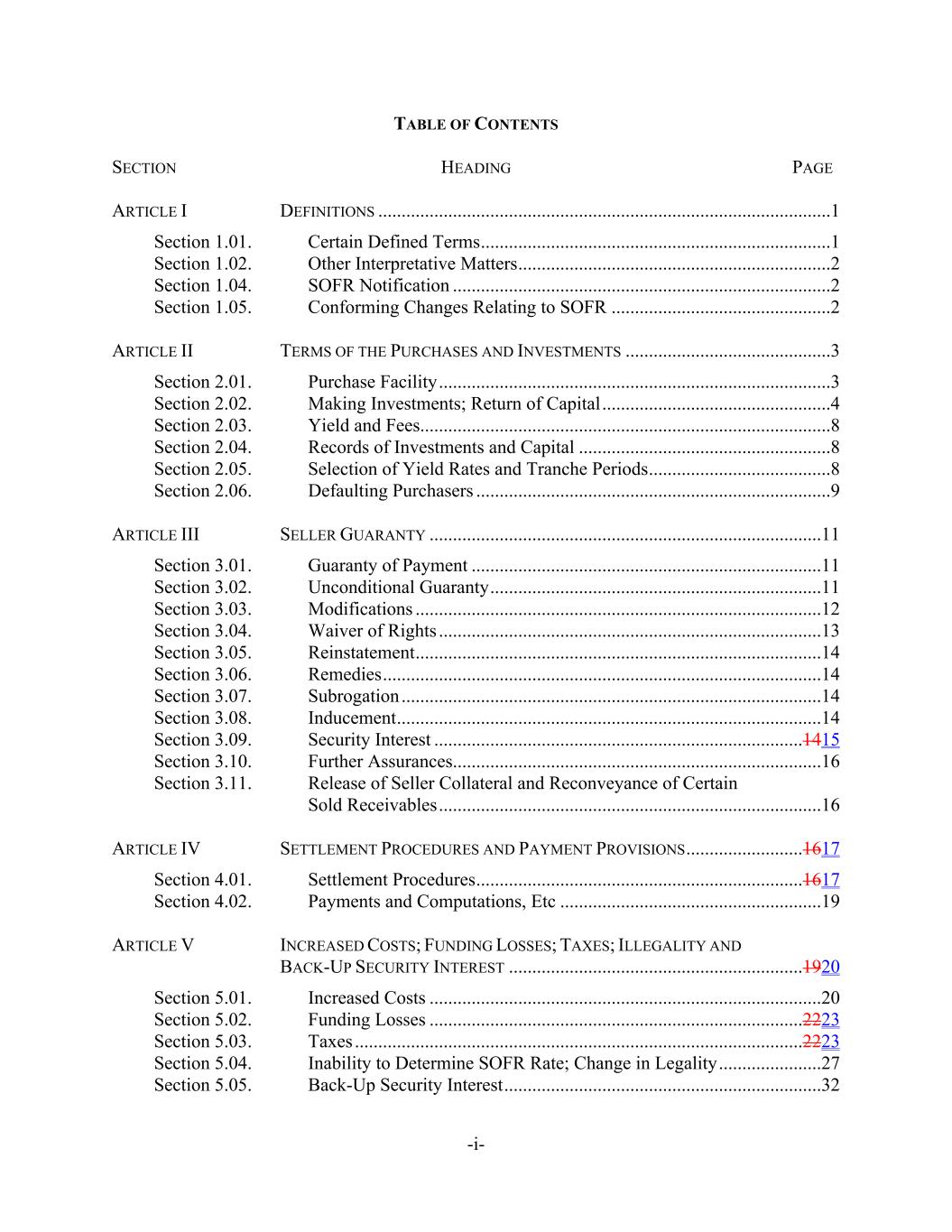 -i- TABLE OF CONTENTS SECTION HEADING PAGE ARTICLE I DEFINITIONS .................................................................................................1 Section 1.01. Certain Defined Terms...........................................................................1 Section 1.02. Other Interpretative Matters...................................................................2 Section 1.04. SOFR Notification .................................................................................2 Section 1.05. Conforming Changes Relating to SOFR ...............................................2 ARTICLE II TERMS OF THE PURCHASES AND INVESTMENTS ............................................3 Section 2.01. Purchase Facility....................................................................................3 Section 2.02. Making Investments; Return of Capital.................................................4 Section 2.03. Yield and Fees........................................................................................8 Section 2.04. Records of Investments and Capital ......................................................8 Section 2.05. Selection of Yield Rates and Tranche Periods.......................................8 Section 2.06. Defaulting Purchasers ............................................................................9 ARTICLE III SELLER GUARANTY ....................................................................................11 Section 3.01. Guaranty of Payment ...........................................................................11 Section 3.02. Unconditional Guaranty.......................................................................11 Section 3.03. Modifications .......................................................................................12 Section 3.04. Waiver of Rights ..................................................................................13 Section 3.05. Reinstatement.......................................................................................14 Section 3.06. Remedies..............................................................................................14 Section 3.07. Subrogation ..........................................................................................14 Section 3.08. Inducement...........................................................................................14 Section 3.09. Security Interest ...............................................................................1415 Section 3.10. Further Assurances...............................................................................16 Section 3.11. Release of Seller Collateral and Reconveyance of Certain Sold Receivables..................................................................................16 ARTICLE IV SETTLEMENT PROCEDURES AND PAYMENT PROVISIONS.........................1617 Section 4.01. Settlement Procedures......................................................................1617 Section 4.02. Payments and Computations, Etc ........................................................19 ARTICLE V INCREASED COSTS; FUNDING LOSSES; TAXES; ILLEGALITY AND BACK-UP SECURITY INTEREST ...............................................................1920 Section 5.01. Increased Costs ....................................................................................20 Section 5.02. Funding Losses ................................................................................2223 Section 5.03. Taxes ................................................................................................2223 Section 5.04. Inability to Determine SOFR Rate; Change in Legality......................27 Section 5.05. Back-Up Security Interest....................................................................32