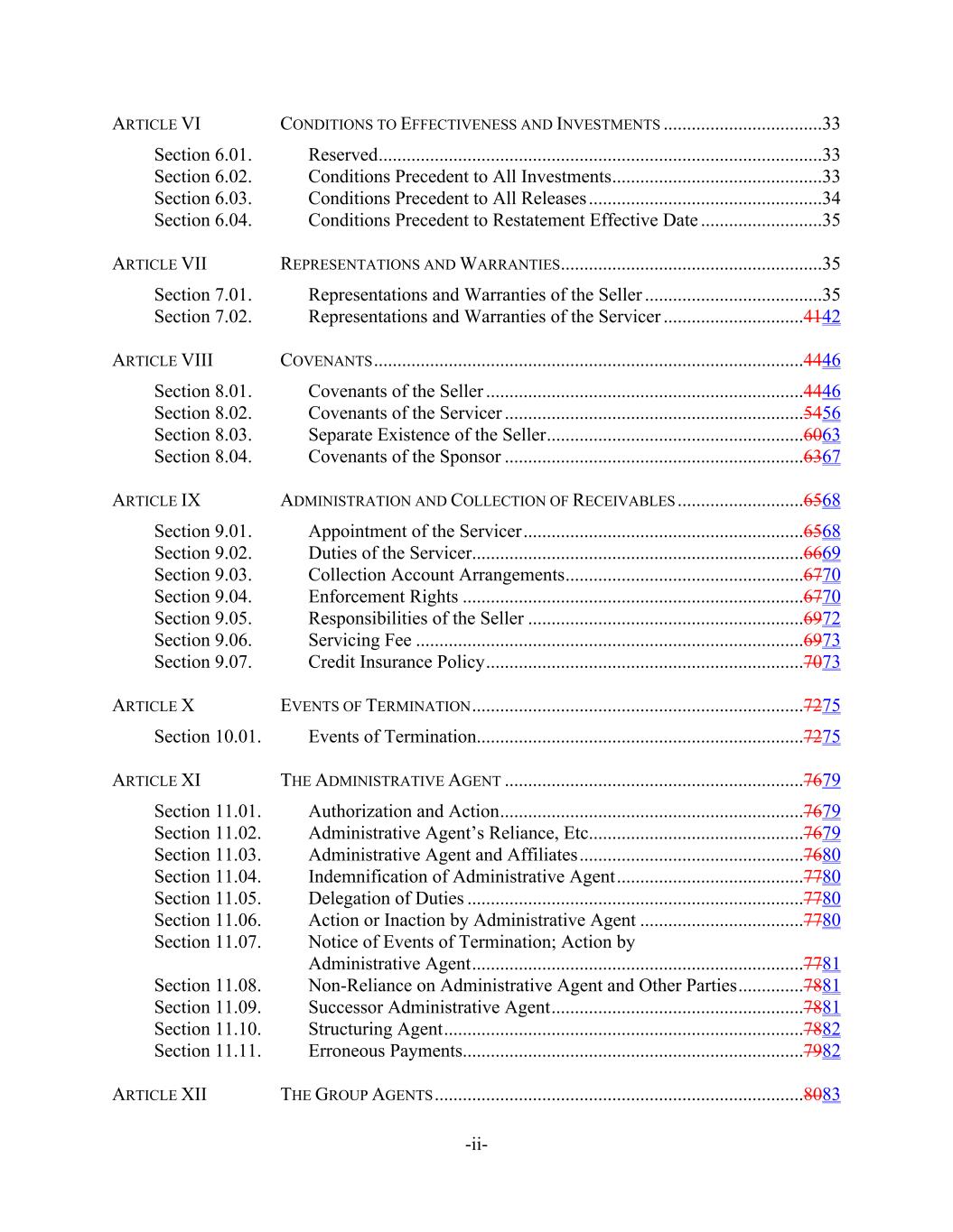 -ii- ARTICLE VI CONDITIONS TO EFFECTIVENESS AND INVESTMENTS ..................................33 Section 6.01. Reserved...............................................................................................33 Section 6.02. Conditions Precedent to All Investments.............................................33 Section 6.03. Conditions Precedent to All Releases ..................................................34 Section 6.04. Conditions Precedent to Restatement Effective Date ..........................35 ARTICLE VII REPRESENTATIONS AND WARRANTIES........................................................35 Section 7.01. Representations and Warranties of the Seller ......................................35 Section 7.02. Representations and Warranties of the Servicer ..............................4142 ARTICLE VIII COVENANTS............................................................................................4446 Section 8.01. Covenants of the Seller ....................................................................4446 Section 8.02. Covenants of the Servicer ................................................................5456 Section 8.03. Separate Existence of the Seller.......................................................6063 Section 8.04. Covenants of the Sponsor ................................................................6367 ARTICLE IX ADMINISTRATION AND COLLECTION OF RECEIVABLES ...........................6568 Section 9.01. Appointment of the Servicer............................................................6568 Section 9.02. Duties of the Servicer.......................................................................6669 Section 9.03. Collection Account Arrangements...................................................6770 Section 9.04. Enforcement Rights .........................................................................6770 Section 9.05. Responsibilities of the Seller ...........................................................6972 Section 9.06. Servicing Fee ...................................................................................6973 Section 9.07. Credit Insurance Policy....................................................................7073 ARTICLE X EVENTS OF TERMINATION.......................................................................7275 Section 10.01. Events of Termination......................................................................7275 ARTICLE XI THE ADMINISTRATIVE AGENT ................................................................7679 Section 11.01. Authorization and Action.................................................................7679 Section 11.02. Administrative Agent’s Reliance, Etc..............................................7679 Section 11.03. Administrative Agent and Affiliates................................................7680 Section 11.04. Indemnification of Administrative Agent........................................7780 Section 11.05. Delegation of Duties ........................................................................7780 Section 11.06. Action or Inaction by Administrative Agent ...................................7780 Section 11.07. Notice of Events of Termination; Action by Administrative Agent.......................................................................7781 Section 11.08. Non-Reliance on Administrative Agent and Other Parties..............7881 Section 11.09. Successor Administrative Agent......................................................7881 Section 11.10. Structuring Agent.............................................................................7882 Section 11.11. Erroneous Payments.........................................................................7982 ARTICLE XII THE GROUP AGENTS ...............................................................................8083