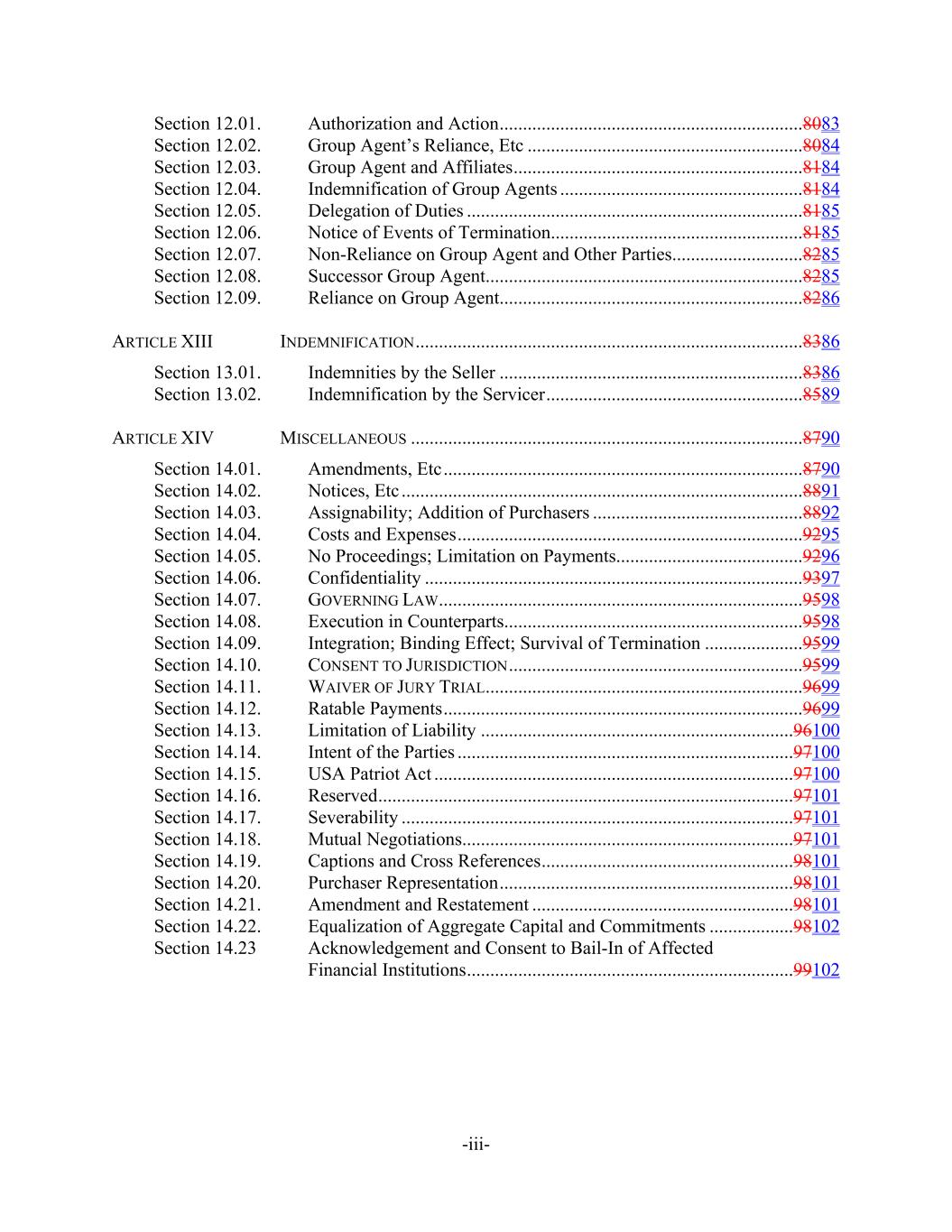 -iii- Section 12.01. Authorization and Action.................................................................8083 Section 12.02. Group Agent’s Reliance, Etc ...........................................................8084 Section 12.03. Group Agent and Affiliates..............................................................8184 Section 12.04. Indemnification of Group Agents ....................................................8184 Section 12.05. Delegation of Duties ........................................................................8185 Section 12.06. Notice of Events of Termination......................................................8185 Section 12.07. Non-Reliance on Group Agent and Other Parties............................8285 Section 12.08. Successor Group Agent....................................................................8285 Section 12.09. Reliance on Group Agent.................................................................8286 ARTICLE XIII INDEMNIFICATION...................................................................................8386 Section 13.01. Indemnities by the Seller .................................................................8386 Section 13.02. Indemnification by the Servicer.......................................................8589 ARTICLE XIV MISCELLANEOUS ....................................................................................8790 Section 14.01. Amendments, Etc.............................................................................8790 Section 14.02. Notices, Etc ......................................................................................8891 Section 14.03. Assignability; Addition of Purchasers .............................................8892 Section 14.04. Costs and Expenses..........................................................................9295 Section 14.05. No Proceedings; Limitation on Payments........................................9296 Section 14.06. Confidentiality .................................................................................9397 Section 14.07. GOVERNING LAW..............................................................................9598 Section 14.08. Execution in Counterparts................................................................9598 Section 14.09. Integration; Binding Effect; Survival of Termination .....................9599 Section 14.10. CONSENT TO JURISDICTION...............................................................9599 Section 14.11. WAIVER OF JURY TRIAL....................................................................9699 Section 14.12. Ratable Payments.............................................................................9699 Section 14.13. Limitation of Liability ...................................................................96100 Section 14.14. Intent of the Parties ........................................................................97100 Section 14.15. USA Patriot Act .............................................................................97100 Section 14.16. Reserved.........................................................................................97101 Section 14.17. Severability ....................................................................................97101 Section 14.18. Mutual Negotiations.......................................................................97101 Section 14.19. Captions and Cross References......................................................98101 Section 14.20. Purchaser Representation...............................................................98101 Section 14.21. Amendment and Restatement ........................................................98101 Section 14.22. Equalization of Aggregate Capital and Commitments ..................98102 Section 14.23 Acknowledgement and Consent to Bail-In of Affected Financial Institutions......................................................................99102