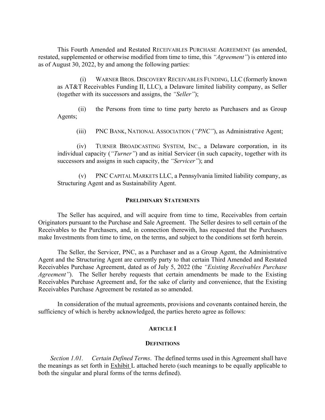 This Fourth Amended and Restated RECEIVABLES PURCHASE AGREEMENT (as amended, restated, supplemented or otherwise modified from time to time, this “Agreement”) is entered into as of August 30, 2022, by and among the following parties: (i) WARNER BROS. DISCOVERY RECEIVABLES FUNDING, LLC (formerly known as AT&T Receivables Funding II, LLC), a Delaware limited liability company, as Seller (together with its successors and assigns, the “Seller”); (ii) the Persons from time to time party hereto as Purchasers and as Group Agents; (iii) PNC BANK, NATIONAL ASSOCIATION (“PNC”), as Administrative Agent; (iv) TURNER BROADCASTING SYSTEM, INC., a Delaware corporation, in its individual capacity (“Turner”) and as initial Servicer (in such capacity, together with its successors and assigns in such capacity, the “Servicer”); and (v) PNC CAPITAL MARKETS LLC, a Pennsylvania limited liability company, as Structuring Agent and as Sustainability Agent. PRELIMINARY STATEMENTS The Seller has acquired, and will acquire from time to time, Receivables from certain Originators pursuant to the Purchase and Sale Agreement. The Seller desires to sell certain of the Receivables to the Purchasers, and, in connection therewith, has requested that the Purchasers make Investments from time to time, on the terms, and subject to the conditions set forth herein. The Seller, the Servicer, PNC, as a Purchaser and as a Group Agent, the Administrative Agent and the Structuring Agent are currently party to that certain Third Amended and Restated Receivables Purchase Agreement, dated as of July 5, 2022 (the “Existing Receivables Purchase Agreement”). The Seller hereby requests that certain amendments be made to the Existing Receivables Purchase Agreement and, for the sake of clarity and convenience, that the Existing Receivables Purchase Agreement be restated as so amended. In consideration of the mutual agreements, provisions and covenants contained herein, the sufficiency of which is hereby acknowledged, the parties hereto agree as follows: ARTICLE I DEFINITIONS Section 1.01. Certain Defined Terms. The defined terms used in this Agreement shall have the meanings as set forth in Exhibit L attached hereto (such meanings to be equally applicable to both the singular and plural forms of the terms defined).