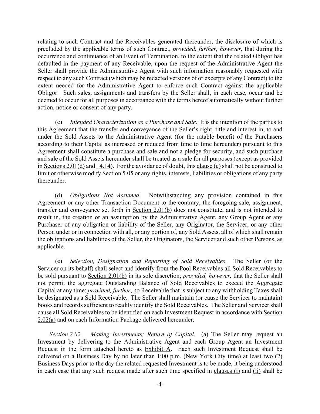 -4- relating to such Contract and the Receivables generated thereunder, the disclosure of which is precluded by the applicable terms of such Contract, provided, further, however, that during the occurrence and continuance of an Event of Termination, to the extent that the related Obligor has defaulted in the payment of any Receivable, upon the request of the Administrative Agent the Seller shall provide the Administrative Agent with such information reasonably requested with respect to any such Contract (which may be redacted versions of or excerpts of any Contract) to the extent needed for the Administrative Agent to enforce such Contract against the applicable Obligor. Such sales, assignments and transfers by the Seller shall, in each case, occur and be deemed to occur for all purposes in accordance with the terms hereof automatically without further action, notice or consent of any party. (c) Intended Characterization as a Purchase and Sale. It is the intention of the parties to this Agreement that the transfer and conveyance of the Seller’s right, title and interest in, to and under the Sold Assets to the Administrative Agent (for the ratable benefit of the Purchasers according to their Capital as increased or reduced from time to time hereunder) pursuant to this Agreement shall constitute a purchase and sale and not a pledge for security, and such purchase and sale of the Sold Assets hereunder shall be treated as a sale for all purposes (except as provided in Sections 2.01(d) and 14.14). For the avoidance of doubt, this clause (c) shall not be construed to limit or otherwise modify Section 5.05 or any rights, interests, liabilities or obligations of any party thereunder. (d) Obligations Not Assumed. Notwithstanding any provision contained in this Agreement or any other Transaction Document to the contrary, the foregoing sale, assignment, transfer and conveyance set forth in Section 2.01(b) does not constitute, and is not intended to result in, the creation or an assumption by the Administrative Agent, any Group Agent or any Purchaser of any obligation or liability of the Seller, any Originator, the Servicer, or any other Person under or in connection with all, or any portion of, any Sold Assets, all of which shall remain the obligations and liabilities of the Seller, the Originators, the Servicer and such other Persons, as applicable. (e) Selection, Designation and Reporting of Sold Receivables. The Seller (or the Servicer on its behalf) shall select and identify from the Pool Receivables all Sold Receivables to be sold pursuant to Section 2.01(b) in its sole discretion; provided, however, that the Seller shall not permit the aggregate Outstanding Balance of Sold Receivables to exceed the Aggregate Capital at any time; provided, further, no Receivable that is subject to any withholding Taxes shall be designated as a Sold Receivable. The Seller shall maintain (or cause the Servicer to maintain) books and records sufficient to readily identify the Sold Receivables. The Seller and Servicer shall cause all Sold Receivables to be identified on each Investment Request in accordance with Section 2.02(a) and on each Information Package delivered hereunder. Section 2.02. Making Investments; Return of Capital. (a) The Seller may request an Investment by delivering to the Administrative Agent and each Group Agent an Investment Request in the form attached hereto as Exhibit A. Each such Investment Request shall be delivered on a Business Day by no later than 1:00 p.m. (New York City time) at least two (2) Business Days prior to the day the related requested Investment is to be made, it being understood in each case that any such request made after such time specified in clauses (i) and (ii) shall be