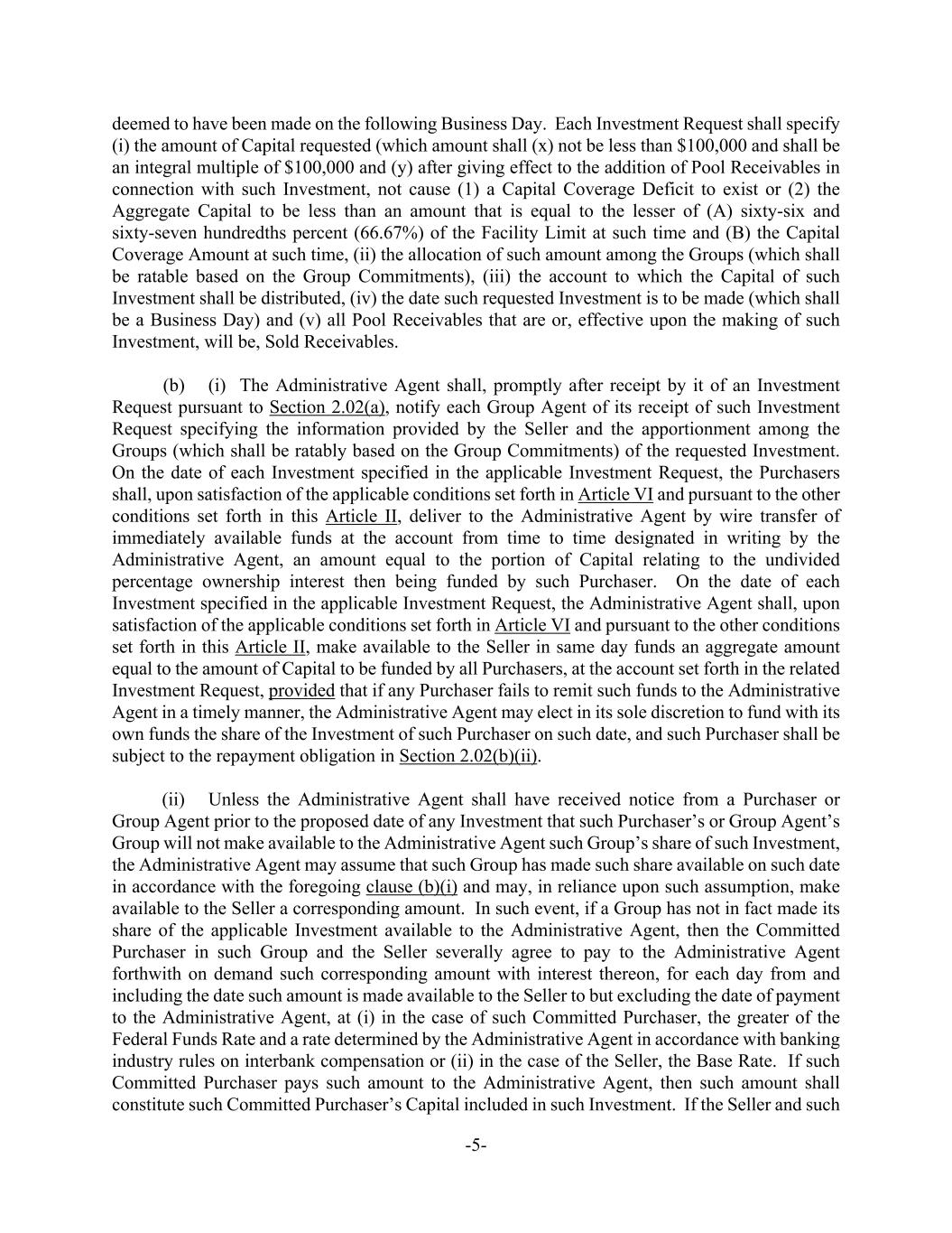 -5- deemed to have been made on the following Business Day. Each Investment Request shall specify (i) the amount of Capital requested (which amount shall (x) not be less than $100,000 and shall be an integral multiple of $100,000 and (y) after giving effect to the addition of Pool Receivables in connection with such Investment, not cause (1) a Capital Coverage Deficit to exist or (2) the Aggregate Capital to be less than an amount that is equal to the lesser of (A) sixty-six and sixty-seven hundredths percent (66.67%) of the Facility Limit at such time and (B) the Capital Coverage Amount at such time, (ii) the allocation of such amount among the Groups (which shall be ratable based on the Group Commitments), (iii) the account to which the Capital of such Investment shall be distributed, (iv) the date such requested Investment is to be made (which shall be a Business Day) and (v) all Pool Receivables that are or, effective upon the making of such Investment, will be, Sold Receivables. (b) (i) The Administrative Agent shall, promptly after receipt by it of an Investment Request pursuant to Section 2.02(a), notify each Group Agent of its receipt of such Investment Request specifying the information provided by the Seller and the apportionment among the Groups (which shall be ratably based on the Group Commitments) of the requested Investment. On the date of each Investment specified in the applicable Investment Request, the Purchasers shall, upon satisfaction of the applicable conditions set forth in Article VI and pursuant to the other conditions set forth in this Article II, deliver to the Administrative Agent by wire transfer of immediately available funds at the account from time to time designated in writing by the Administrative Agent, an amount equal to the portion of Capital relating to the undivided percentage ownership interest then being funded by such Purchaser. On the date of each Investment specified in the applicable Investment Request, the Administrative Agent shall, upon satisfaction of the applicable conditions set forth in Article VI and pursuant to the other conditions set forth in this Article II, make available to the Seller in same day funds an aggregate amount equal to the amount of Capital to be funded by all Purchasers, at the account set forth in the related Investment Request, provided that if any Purchaser fails to remit such funds to the Administrative Agent in a timely manner, the Administrative Agent may elect in its sole discretion to fund with its own funds the share of the Investment of such Purchaser on such date, and such Purchaser shall be subject to the repayment obligation in Section 2.02(b)(ii). (ii) Unless the Administrative Agent shall have received notice from a Purchaser or Group Agent prior to the proposed date of any Investment that such Purchaser’s or Group Agent’s Group will not make available to the Administrative Agent such Group’s share of such Investment, the Administrative Agent may assume that such Group has made such share available on such date in accordance with the foregoing clause (b)(i) and may, in reliance upon such assumption, make available to the Seller a corresponding amount. In such event, if a Group has not in fact made its share of the applicable Investment available to the Administrative Agent, then the Committed Purchaser in such Group and the Seller severally agree to pay to the Administrative Agent forthwith on demand such corresponding amount with interest thereon, for each day from and including the date such amount is made available to the Seller to but excluding the date of payment to the Administrative Agent, at (i) in the case of such Committed Purchaser, the greater of the Federal Funds Rate and a rate determined by the Administrative Agent in accordance with banking industry rules on interbank compensation or (ii) in the case of the Seller, the Base Rate. If such Committed Purchaser pays such amount to the Administrative Agent, then such amount shall constitute such Committed Purchaser’s Capital included in such Investment. If the Seller and such