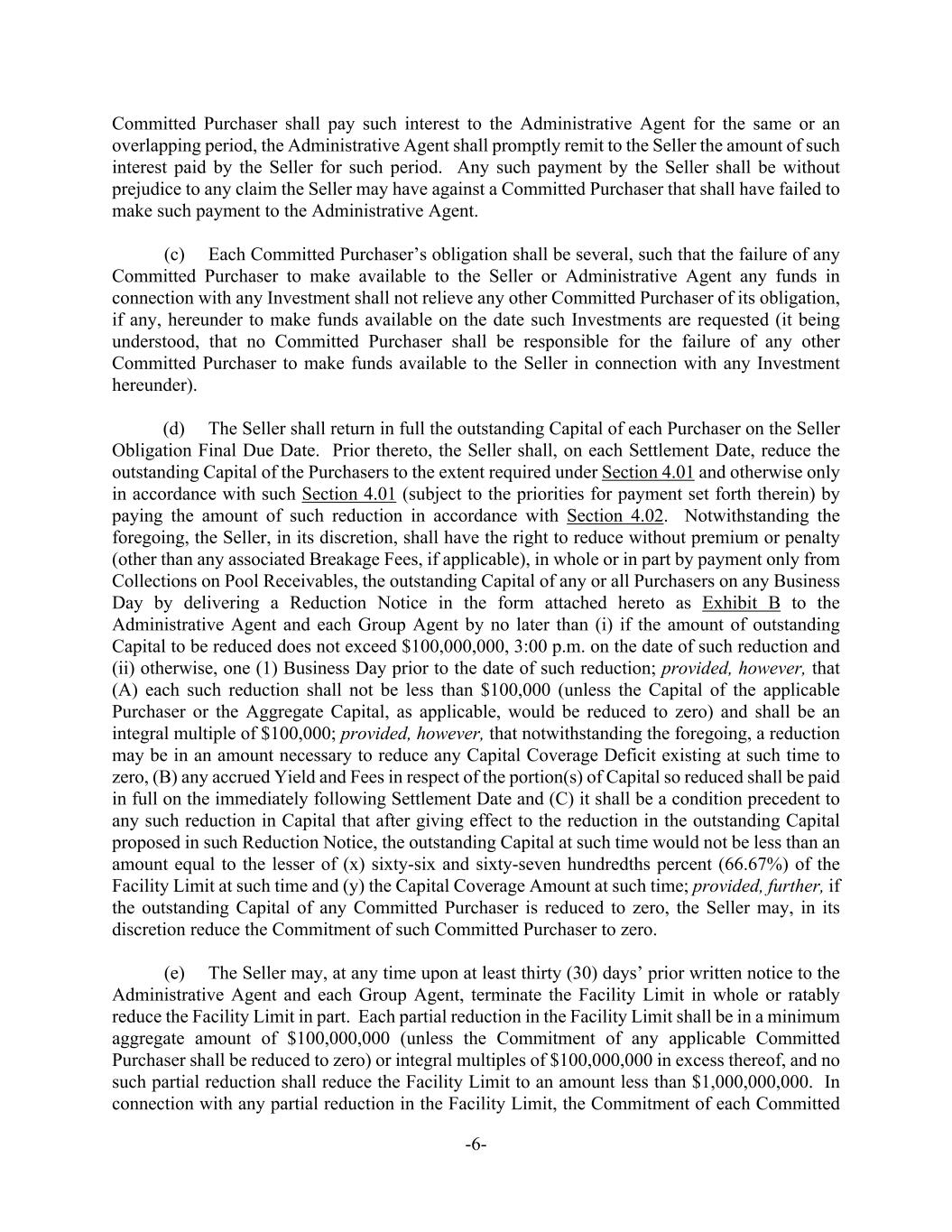 -6- Committed Purchaser shall pay such interest to the Administrative Agent for the same or an overlapping period, the Administrative Agent shall promptly remit to the Seller the amount of such interest paid by the Seller for such period. Any such payment by the Seller shall be without prejudice to any claim the Seller may have against a Committed Purchaser that shall have failed to make such payment to the Administrative Agent. (c) Each Committed Purchaser’s obligation shall be several, such that the failure of any Committed Purchaser to make available to the Seller or Administrative Agent any funds in connection with any Investment shall not relieve any other Committed Purchaser of its obligation, if any, hereunder to make funds available on the date such Investments are requested (it being understood, that no Committed Purchaser shall be responsible for the failure of any other Committed Purchaser to make funds available to the Seller in connection with any Investment hereunder). (d) The Seller shall return in full the outstanding Capital of each Purchaser on the Seller Obligation Final Due Date. Prior thereto, the Seller shall, on each Settlement Date, reduce the outstanding Capital of the Purchasers to the extent required under Section 4.01 and otherwise only in accordance with such Section 4.01 (subject to the priorities for payment set forth therein) by paying the amount of such reduction in accordance with Section 4.02. Notwithstanding the foregoing, the Seller, in its discretion, shall have the right to reduce without premium or penalty (other than any associated Breakage Fees, if applicable), in whole or in part by payment only from Collections on Pool Receivables, the outstanding Capital of any or all Purchasers on any Business Day by delivering a Reduction Notice in the form attached hereto as Exhibit B to the Administrative Agent and each Group Agent by no later than (i) if the amount of outstanding Capital to be reduced does not exceed $100,000,000, 3:00 p.m. on the date of such reduction and (ii) otherwise, one (1) Business Day prior to the date of such reduction; provided, however, that (A) each such reduction shall not be less than $100,000 (unless the Capital of the applicable Purchaser or the Aggregate Capital, as applicable, would be reduced to zero) and shall be an integral multiple of $100,000; provided, however, that notwithstanding the foregoing, a reduction may be in an amount necessary to reduce any Capital Coverage Deficit existing at such time to zero, (B) any accrued Yield and Fees in respect of the portion(s) of Capital so reduced shall be paid in full on the immediately following Settlement Date and (C) it shall be a condition precedent to any such reduction in Capital that after giving effect to the reduction in the outstanding Capital proposed in such Reduction Notice, the outstanding Capital at such time would not be less than an amount equal to the lesser of (x) sixty-six and sixty-seven hundredths percent (66.67%) of the Facility Limit at such time and (y) the Capital Coverage Amount at such time; provided, further, if the outstanding Capital of any Committed Purchaser is reduced to zero, the Seller may, in its discretion reduce the Commitment of such Committed Purchaser to zero. (e) The Seller may, at any time upon at least thirty (30) days’ prior written notice to the Administrative Agent and each Group Agent, terminate the Facility Limit in whole or ratably reduce the Facility Limit in part. Each partial reduction in the Facility Limit shall be in a minimum aggregate amount of $100,000,000 (unless the Commitment of any applicable Committed Purchaser shall be reduced to zero) or integral multiples of $100,000,000 in excess thereof, and no such partial reduction shall reduce the Facility Limit to an amount less than $1,000,000,000. In connection with any partial reduction in the Facility Limit, the Commitment of each Committed