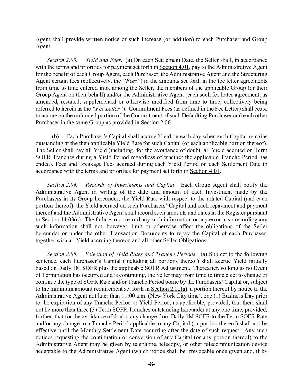 -8- Agent shall provide written notice of such increase (or addition) to each Purchaser and Group Agent. Section 2.03. Yield and Fees. (a) On each Settlement Date, the Seller shall, in accordance with the terms and priorities for payment set forth in Section 4.01, pay to the Administrative Agent for the benefit of each Group Agent, each Purchaser, the Administrative Agent and the Structuring Agent certain fees (collectively, the “Fees”) in the amounts set forth in the fee letter agreements from time to time entered into, among the Seller, the members of the applicable Group (or their Group Agent on their behalf) and/or the Administrative Agent (each such fee letter agreement, as amended, restated, supplemented or otherwise modified from time to time, collectively being referred to herein as the “Fee Letter”). Commitment Fees (as defined in the Fee Letter) shall cease to accrue on the unfunded portion of the Commitment of such Defaulting Purchaser and each other Purchaser in the same Group as provided in Section 2.06. (b) Each Purchaser’s Capital shall accrue Yield on each day when such Capital remains outstanding at the then applicable Yield Rate for such Capital (or each applicable portion thereof). The Seller shall pay all Yield (including, for the avoidance of doubt, all Yield accrued on Term SOFR Tranches during a Yield Period regardless of whether the applicable Tranche Period has ended), Fees and Breakage Fees accrued during each Yield Period on each Settlement Date in accordance with the terms and priorities for payment set forth in Section 4.01. Section 2.04. Records of Investments and Capital. Each Group Agent shall notify the Administrative Agent in writing of the date and amount of each Investment made by the Purchasers in its Group hereunder, the Yield Rate with respect to the related Capital (and each portion thereof), the Yield accrued on such Purchasers’ Capital and each repayment and payment thereof and the Administrative Agent shall record such amounts and dates in the Register pursuant to Section 14.03(c). The failure to so record any such information or any error in so recording any such information shall not, however, limit or otherwise affect the obligations of the Seller hereunder or under the other Transaction Documents to repay the Capital of each Purchaser, together with all Yield accruing thereon and all other Seller Obligations. Section 2.05. Selection of Yield Rates and Tranche Periods. (a) Subject to the following sentence, each Purchaser’s Capital (including all portions thereof) shall accrue Yield initially based on Daily 1M SOFR plus the applicable SOFR Adjustment. Thereafter, so long as no Event of Termination has occurred and is continuing, the Seller may from time to time elect to change or continue the type of SOFR Rate and/or Tranche Period borne by the Purchasers’ Capital or, subject to the minimum amount requirement set forth in Section 2.02(a), a portion thereof by notice to the Administrative Agent not later than 11:00 a.m. (New York City time), one (1) Business Day prior to the expiration of any Tranche Period or Yield Period, as applicable, provided, that there shall not be more than three (3) Term SOFR Tranches outstanding hereunder at any one time, provided, further, that for the avoidance of doubt, any change from Daily 1M SOFR to the Term SOFR Rate and/or any change to a Tranche Period applicable to any Capital (or portion thereof) shall not be effective until the Monthly Settlement Date occurring after the date of such request. Any such notices requesting the continuation or conversion of any Capital (or any portion thereof) to the Administrative Agent may be given by telephone, telecopy, or other telecommunication device acceptable to the Administrative Agent (which notice shall be irrevocable once given and, if by