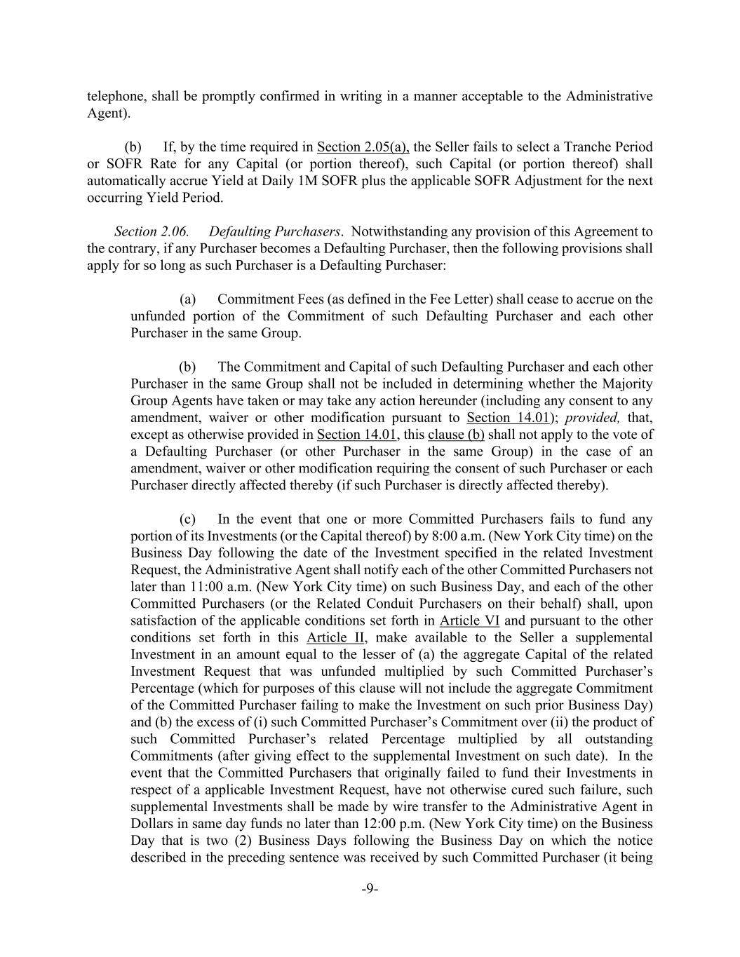-9- telephone, shall be promptly confirmed in writing in a manner acceptable to the Administrative Agent). (b) If, by the time required in Section 2.05(a), the Seller fails to select a Tranche Period or SOFR Rate for any Capital (or portion thereof), such Capital (or portion thereof) shall automatically accrue Yield at Daily 1M SOFR plus the applicable SOFR Adjustment for the next occurring Yield Period. Section 2.06. Defaulting Purchasers. Notwithstanding any provision of this Agreement to the contrary, if any Purchaser becomes a Defaulting Purchaser, then the following provisions shall apply for so long as such Purchaser is a Defaulting Purchaser: (a) Commitment Fees (as defined in the Fee Letter) shall cease to accrue on the unfunded portion of the Commitment of such Defaulting Purchaser and each other Purchaser in the same Group. (b) The Commitment and Capital of such Defaulting Purchaser and each other Purchaser in the same Group shall not be included in determining whether the Majority Group Agents have taken or may take any action hereunder (including any consent to any amendment, waiver or other modification pursuant to Section 14.01); provided, that, except as otherwise provided in Section 14.01, this clause (b) shall not apply to the vote of a Defaulting Purchaser (or other Purchaser in the same Group) in the case of an amendment, waiver or other modification requiring the consent of such Purchaser or each Purchaser directly affected thereby (if such Purchaser is directly affected thereby). (c) In the event that one or more Committed Purchasers fails to fund any portion of its Investments (or the Capital thereof) by 8:00 a.m. (New York City time) on the Business Day following the date of the Investment specified in the related Investment Request, the Administrative Agent shall notify each of the other Committed Purchasers not later than 11:00 a.m. (New York City time) on such Business Day, and each of the other Committed Purchasers (or the Related Conduit Purchasers on their behalf) shall, upon satisfaction of the applicable conditions set forth in Article VI and pursuant to the other conditions set forth in this Article II, make available to the Seller a supplemental Investment in an amount equal to the lesser of (a) the aggregate Capital of the related Investment Request that was unfunded multiplied by such Committed Purchaser’s Percentage (which for purposes of this clause will not include the aggregate Commitment of the Committed Purchaser failing to make the Investment on such prior Business Day) and (b) the excess of (i) such Committed Purchaser’s Commitment over (ii) the product of such Committed Purchaser’s related Percentage multiplied by all outstanding Commitments (after giving effect to the supplemental Investment on such date). In the event that the Committed Purchasers that originally failed to fund their Investments in respect of a applicable Investment Request, have not otherwise cured such failure, such supplemental Investments shall be made by wire transfer to the Administrative Agent in Dollars in same day funds no later than 12:00 p.m. (New York City time) on the Business Day that is two (2) Business Days following the Business Day on which the notice described in the preceding sentence was received by such Committed Purchaser (it being