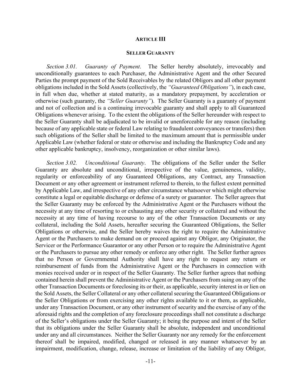 -11- ARTICLE III SELLER GUARANTY Section 3.01. Guaranty of Payment. The Seller hereby absolutely, irrevocably and unconditionally guarantees to each Purchaser, the Administrative Agent and the other Secured Parties the prompt payment of the Sold Receivables by the related Obligors and all other payment obligations included in the Sold Assets (collectively, the “Guaranteed Obligations”), in each case, in full when due, whether at stated maturity, as a mandatory prepayment, by acceleration or otherwise (such guaranty, the “Seller Guaranty”). The Seller Guaranty is a guaranty of payment and not of collection and is a continuing irrevocable guaranty and shall apply to all Guaranteed Obligations whenever arising. To the extent the obligations of the Seller hereunder with respect to the Seller Guaranty shall be adjudicated to be invalid or unenforceable for any reason (including because of any applicable state or federal Law relating to fraudulent conveyances or transfers) then such obligations of the Seller shall be limited to the maximum amount that is permissible under Applicable Law (whether federal or state or otherwise and including the Bankruptcy Code and any other applicable bankruptcy, insolvency, reorganization or other similar laws). Section 3.02. Unconditional Guaranty. The obligations of the Seller under the Seller Guaranty are absolute and unconditional, irrespective of the value, genuineness, validity, regularity or enforceability of any Guaranteed Obligations, any Contract, any Transaction Document or any other agreement or instrument referred to therein, to the fullest extent permitted by Applicable Law, and irrespective of any other circumstance whatsoever which might otherwise constitute a legal or equitable discharge or defense of a surety or guarantor. The Seller agrees that the Seller Guaranty may be enforced by the Administrative Agent or the Purchasers without the necessity at any time of resorting to or exhausting any other security or collateral and without the necessity at any time of having recourse to any of the other Transaction Documents or any collateral, including the Sold Assets, hereafter securing the Guaranteed Obligations, the Seller Obligations or otherwise, and the Seller hereby waives the right to require the Administrative Agent or the Purchasers to make demand on or proceed against any Obligor, any Originator, the Servicer or the Performance Guarantor or any other Person or to require the Administrative Agent or the Purchasers to pursue any other remedy or enforce any other right. The Seller further agrees that no Person or Governmental Authority shall have any right to request any return or reimbursement of funds from the Administrative Agent or the Purchasers in connection with monies received under or in respect of the Seller Guaranty. The Seller further agrees that nothing contained herein shall prevent the Administrative Agent or the Purchasers from suing on any of the other Transaction Documents or foreclosing its or their, as applicable, security interest in or lien on the Sold Assets, the Seller Collateral or any other collateral securing the Guaranteed Obligations or the Seller Obligations or from exercising any other rights available to it or them, as applicable, under any Transaction Document, or any other instrument of security and the exercise of any of the aforesaid rights and the completion of any foreclosure proceedings shall not constitute a discharge of the Seller’s obligations under the Seller Guaranty; it being the purpose and intent of the Seller that its obligations under the Seller Guaranty shall be absolute, independent and unconditional under any and all circumstances. Neither the Seller Guaranty nor any remedy for the enforcement thereof shall be impaired, modified, changed or released in any manner whatsoever by an impairment, modification, change, release, increase or limitation of the liability of any Obligor,