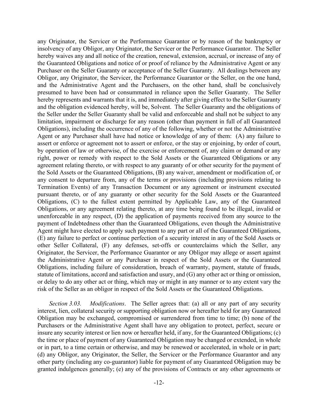 -12- any Originator, the Servicer or the Performance Guarantor or by reason of the bankruptcy or insolvency of any Obligor, any Originator, the Servicer or the Performance Guarantor. The Seller hereby waives any and all notice of the creation, renewal, extension, accrual, or increase of any of the Guaranteed Obligations and notice of or proof of reliance by the Administrative Agent or any Purchaser on the Seller Guaranty or acceptance of the Seller Guaranty. All dealings between any Obligor, any Originator, the Servicer, the Performance Guarantor or the Seller, on the one hand, and the Administrative Agent and the Purchasers, on the other hand, shall be conclusively presumed to have been had or consummated in reliance upon the Seller Guaranty. The Seller hereby represents and warrants that it is, and immediately after giving effect to the Seller Guaranty and the obligation evidenced hereby, will be, Solvent. The Seller Guaranty and the obligations of the Seller under the Seller Guaranty shall be valid and enforceable and shall not be subject to any limitation, impairment or discharge for any reason (other than payment in full of all Guaranteed Obligations), including the occurrence of any of the following, whether or not the Administrative Agent or any Purchaser shall have had notice or knowledge of any of them: (A) any failure to assert or enforce or agreement not to assert or enforce, or the stay or enjoining, by order of court, by operation of law or otherwise, of the exercise or enforcement of, any claim or demand or any right, power or remedy with respect to the Sold Assets or the Guaranteed Obligations or any agreement relating thereto, or with respect to any guaranty of or other security for the payment of the Sold Assets or the Guaranteed Obligations, (B) any waiver, amendment or modification of, or any consent to departure from, any of the terms or provisions (including provisions relating to Termination Events) of any Transaction Document or any agreement or instrument executed pursuant thereto, or of any guaranty or other security for the Sold Assets or the Guaranteed Obligations, (C) to the fullest extent permitted by Applicable Law, any of the Guaranteed Obligations, or any agreement relating thereto, at any time being found to be illegal, invalid or unenforceable in any respect, (D) the application of payments received from any source to the payment of Indebtedness other than the Guaranteed Obligations, even though the Administrative Agent might have elected to apply such payment to any part or all of the Guaranteed Obligations, (E) any failure to perfect or continue perfection of a security interest in any of the Sold Assets or other Seller Collateral, (F) any defenses, set-offs or counterclaims which the Seller, any Originator, the Servicer, the Performance Guarantor or any Obligor may allege or assert against the Administrative Agent or any Purchaser in respect of the Sold Assets or the Guaranteed Obligations, including failure of consideration, breach of warranty, payment, statute of frauds, statute of limitations, accord and satisfaction and usury, and (G) any other act or thing or omission, or delay to do any other act or thing, which may or might in any manner or to any extent vary the risk of the Seller as an obligor in respect of the Sold Assets or the Guaranteed Obligations. Section 3.03. Modifications. The Seller agrees that: (a) all or any part of any security interest, lien, collateral security or supporting obligation now or hereafter held for any Guaranteed Obligation may be exchanged, compromised or surrendered from time to time; (b) none of the Purchasers or the Administrative Agent shall have any obligation to protect, perfect, secure or insure any security interest or lien now or hereafter held, if any, for the Guaranteed Obligations; (c) the time or place of payment of any Guaranteed Obligation may be changed or extended, in whole or in part, to a time certain or otherwise, and may be renewed or accelerated, in whole or in part; (d) any Obligor, any Originator, the Seller, the Servicer or the Performance Guarantor and any other party (including any co-guarantor) liable for payment of any Guaranteed Obligation may be granted indulgences generally; (e) any of the provisions of Contracts or any other agreements or