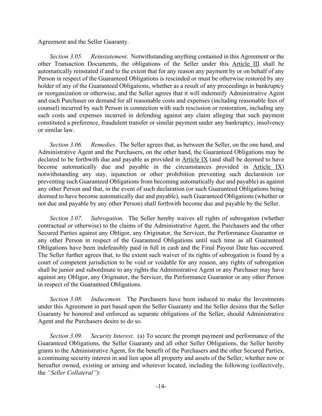 -14- Agreement and the Seller Guaranty. Section 3.05. Reinstatement. Notwithstanding anything contained in this Agreement or the other Transaction Documents, the obligations of the Seller under this Article III shall be automatically reinstated if and to the extent that for any reason any payment by or on behalf of any Person in respect of the Guaranteed Obligations is rescinded or must be otherwise restored by any holder of any of the Guaranteed Obligations, whether as a result of any proceedings in bankruptcy or reorganization or otherwise, and the Seller agrees that it will indemnify Administrative Agent and each Purchaser on demand for all reasonable costs and expenses (including reasonable fees of counsel) incurred by such Person in connection with such rescission or restoration, including any such costs and expenses incurred in defending against any claim alleging that such payment constituted a preference, fraudulent transfer or similar payment under any bankruptcy, insolvency or similar law. Section 3.06. Remedies. The Seller agrees that, as between the Seller, on the one hand, and Administrative Agent and the Purchasers, on the other hand, the Guaranteed Obligations may be declared to be forthwith due and payable as provided in Article IX (and shall be deemed to have become automatically due and payable in the circumstances provided in Article IX) notwithstanding any stay, injunction or other prohibition preventing such declaration (or preventing such Guaranteed Obligations from becoming automatically due and payable) as against any other Person and that, in the event of such declaration (or such Guaranteed Obligations being deemed to have become automatically due and payable), such Guaranteed Obligations (whether or not due and payable by any other Person) shall forthwith become due and payable by the Seller. Section 3.07. Subrogation. The Seller hereby waives all rights of subrogation (whether contractual or otherwise) to the claims of the Administrative Agent, the Purchasers and the other Secured Parties against any Obligor, any Originator, the Servicer, the Performance Guarantor or any other Person in respect of the Guaranteed Obligations until such time as all Guaranteed Obligations have been indefeasibly paid in full in cash and the Final Payout Date has occurred. The Seller further agrees that, to the extent such waiver of its rights of subrogation is found by a court of competent jurisdiction to be void or voidable for any reason, any rights of subrogation shall be junior and subordinate to any rights the Administrative Agent or any Purchaser may have against any Obligor, any Originator, the Servicer, the Performance Guarantor or any other Person in respect of the Guaranteed Obligations. Section 3.08. Inducement. The Purchasers have been induced to make the Investments under this Agreement in part based upon the Seller Guaranty and the Seller desires that the Seller Guaranty be honored and enforced as separate obligations of the Seller, should Administrative Agent and the Purchasers desire to do so. Section 3.09. Security Interest. (a) To secure the prompt payment and performance of the Guaranteed Obligations, the Seller Guaranty and all other Seller Obligations, the Seller hereby grants to the Administrative Agent, for the benefit of the Purchasers and the other Secured Parties, a continuing security interest in and lien upon all property and assets of the Seller, whether now or hereafter owned, existing or arising and wherever located, including the following (collectively, the “Seller Collateral”):