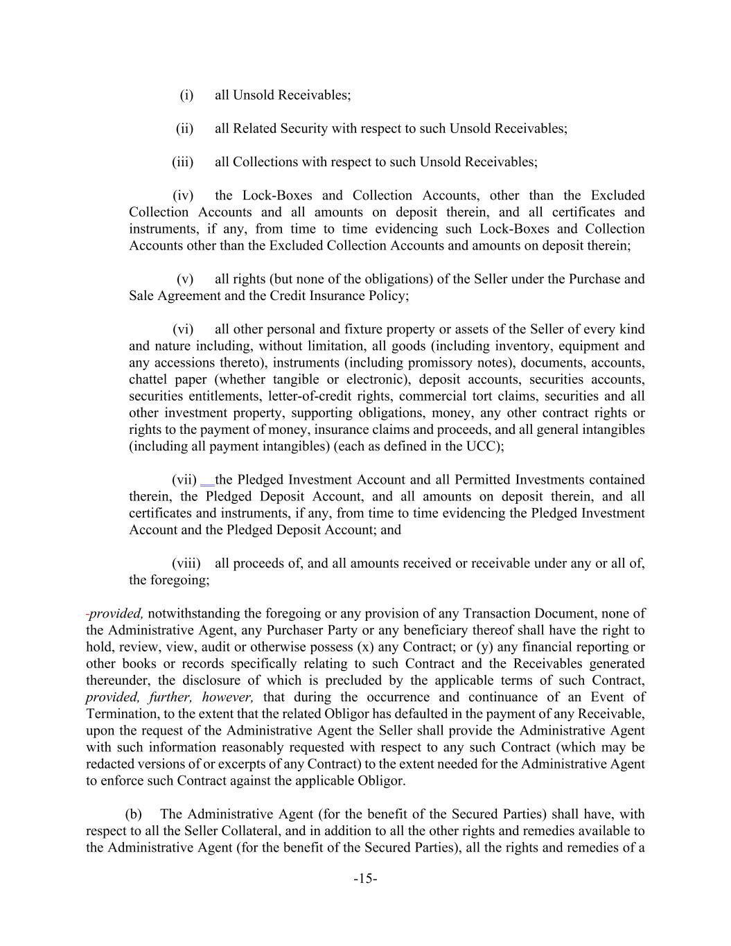-15- (i) all Unsold Receivables; (ii) all Related Security with respect to such Unsold Receivables; (iii) all Collections with respect to such Unsold Receivables; (iv) the Lock-Boxes and Collection Accounts, other than the Excluded Collection Accounts and all amounts on deposit therein, and all certificates and instruments, if any, from time to time evidencing such Lock-Boxes and Collection Accounts other than the Excluded Collection Accounts and amounts on deposit therein; (v) all rights (but none of the obligations) of the Seller under the Purchase and Sale Agreement and the Credit Insurance Policy; (vi) all other personal and fixture property or assets of the Seller of every kind and nature including, without limitation, all goods (including inventory, equipment and any accessions thereto), instruments (including promissory notes), documents, accounts, chattel paper (whether tangible or electronic), deposit accounts, securities accounts, securities entitlements, letter-of-credit rights, commercial tort claims, securities and all other investment property, supporting obligations, money, any other contract rights or rights to the payment of money, insurance claims and proceeds, and all general intangibles (including all payment intangibles) (each as defined in the UCC); (vii) the Pledged Investment Account and all Permitted Investments contained therein, the Pledged Deposit Account, and all amounts on deposit therein, and all certificates and instruments, if any, from time to time evidencing the Pledged Investment Account and the Pledged Deposit Account; and (viii) all proceeds of, and all amounts received or receivable under any or all of, the foregoing; provided, notwithstanding the foregoing or any provision of any Transaction Document, none of the Administrative Agent, any Purchaser Party or any beneficiary thereof shall have the right to hold, review, view, audit or otherwise possess (x) any Contract; or (y) any financial reporting or other books or records specifically relating to such Contract and the Receivables generated thereunder, the disclosure of which is precluded by the applicable terms of such Contract, provided, further, however, that during the occurrence and continuance of an Event of Termination, to the extent that the related Obligor has defaulted in the payment of any Receivable, upon the request of the Administrative Agent the Seller shall provide the Administrative Agent with such information reasonably requested with respect to any such Contract (which may be redacted versions of or excerpts of any Contract) to the extent needed for the Administrative Agent to enforce such Contract against the applicable Obligor. (b) The Administrative Agent (for the benefit of the Secured Parties) shall have, with respect to all the Seller Collateral, and in addition to all the other rights and remedies available to the Administrative Agent (for the benefit of the Secured Parties), all the rights and remedies of a