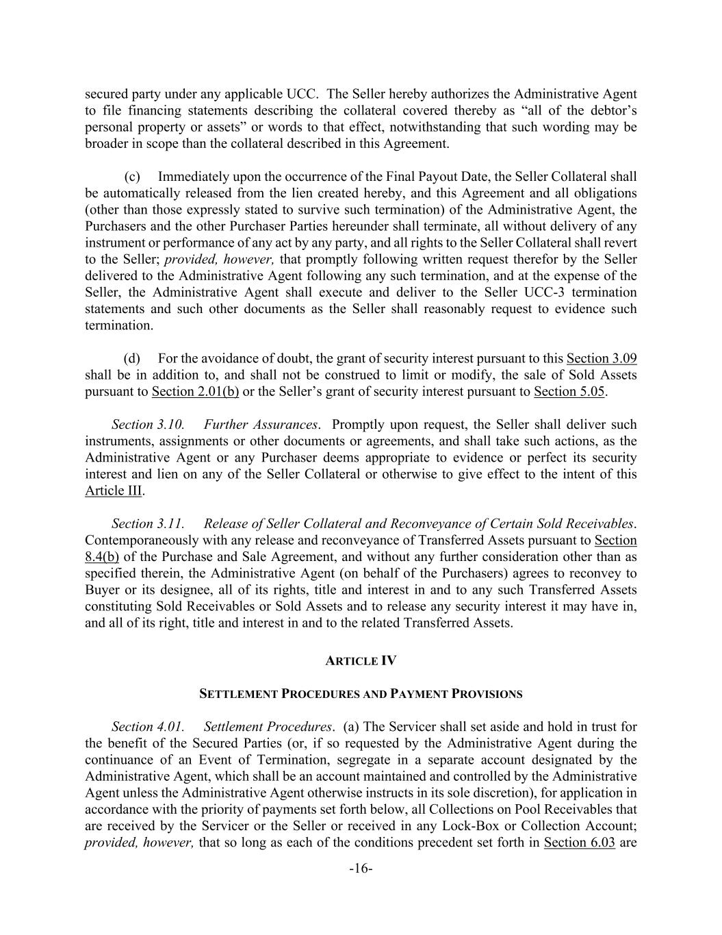 -16- secured party under any applicable UCC. The Seller hereby authorizes the Administrative Agent to file financing statements describing the collateral covered thereby as “all of the debtor’s personal property or assets” or words to that effect, notwithstanding that such wording may be broader in scope than the collateral described in this Agreement. (c) Immediately upon the occurrence of the Final Payout Date, the Seller Collateral shall be automatically released from the lien created hereby, and this Agreement and all obligations (other than those expressly stated to survive such termination) of the Administrative Agent, the Purchasers and the other Purchaser Parties hereunder shall terminate, all without delivery of any instrument or performance of any act by any party, and all rights to the Seller Collateral shall revert to the Seller; provided, however, that promptly following written request therefor by the Seller delivered to the Administrative Agent following any such termination, and at the expense of the Seller, the Administrative Agent shall execute and deliver to the Seller UCC-3 termination statements and such other documents as the Seller shall reasonably request to evidence such termination. (d) For the avoidance of doubt, the grant of security interest pursuant to this Section 3.09 shall be in addition to, and shall not be construed to limit or modify, the sale of Sold Assets pursuant to Section 2.01(b) or the Seller’s grant of security interest pursuant to Section 5.05. Section 3.10. Further Assurances. Promptly upon request, the Seller shall deliver such instruments, assignments or other documents or agreements, and shall take such actions, as the Administrative Agent or any Purchaser deems appropriate to evidence or perfect its security interest and lien on any of the Seller Collateral or otherwise to give effect to the intent of this Article III. Section 3.11. Release of Seller Collateral and Reconveyance of Certain Sold Receivables. Contemporaneously with any release and reconveyance of Transferred Assets pursuant to Section 8.4(b) of the Purchase and Sale Agreement, and without any further consideration other than as specified therein, the Administrative Agent (on behalf of the Purchasers) agrees to reconvey to Buyer or its designee, all of its rights, title and interest in and to any such Transferred Assets constituting Sold Receivables or Sold Assets and to release any security interest it may have in, and all of its right, title and interest in and to the related Transferred Assets. ARTICLE IV SETTLEMENT PROCEDURES AND PAYMENT PROVISIONS Section 4.01. Settlement Procedures. (a) The Servicer shall set aside and hold in trust for the benefit of the Secured Parties (or, if so requested by the Administrative Agent during the continuance of an Event of Termination, segregate in a separate account designated by the Administrative Agent, which shall be an account maintained and controlled by the Administrative Agent unless the Administrative Agent otherwise instructs in its sole discretion), for application in accordance with the priority of payments set forth below, all Collections on Pool Receivables that are received by the Servicer or the Seller or received in any Lock-Box or Collection Account; provided, however, that so long as each of the conditions precedent set forth in Section 6.03 are