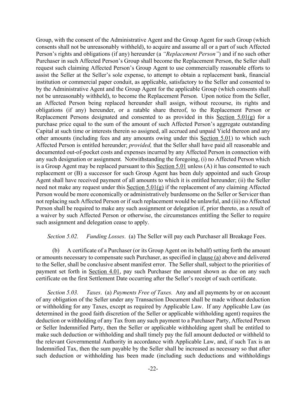 -22- Group, with the consent of the Administrative Agent and the Group Agent for such Group (which consents shall not be unreasonably withheld), to acquire and assume all or a part of such Affected Person’s rights and obligations (if any) hereunder (a “Replacement Person”) and if no such other Purchaser in such Affected Person’s Group shall become the Replacement Person, the Seller shall request such claiming Affected Person’s Group Agent to use commercially reasonable efforts to assist the Seller at the Seller’s sole expense, to attempt to obtain a replacement bank, financial institution or commercial paper conduit, as applicable, satisfactory to the Seller and consented to by the Administrative Agent and the Group Agent for the applicable Group (which consents shall not be unreasonably withheld), to become the Replacement Person. Upon notice from the Seller, an Affected Person being replaced hereunder shall assign, without recourse, its rights and obligations (if any) hereunder, or a ratable share thereof, to the Replacement Person or Replacement Persons designated and consented to as provided in this Section 5.01(g) for a purchase price equal to the sum of the amount of such Affected Person’s aggregate outstanding Capital at such time or interests therein so assigned, all accrued and unpaid Yield thereon and any other amounts (including fees and any amounts owing under this Section 5.01) to which such Affected Person is entitled hereunder; provided, that the Seller shall have paid all reasonable and documented out-of-pocket costs and expenses incurred by any Affected Person in connection with any such designation or assignment. Notwithstanding the foregoing, (i) no Affected Person which is a Group Agent may be replaced pursuant to this Section 5.01 unless (A) it has consented to such replacement or (B) a successor for such Group Agent has been duly appointed and such Group Agent shall have received payment of all amounts to which it is entitled hereunder; (ii) the Seller need not make any request under this Section 5.01(g) if the replacement of any claiming Affected Person would be more economically or administratively burdensome on the Seller or Servicer than not replacing such Affected Person or if such replacement would be unlawful, and (iii) no Affected Person shall be required to make any such assignment or delegation if, prior thereto, as a result of a waiver by such Affected Person or otherwise, the circumstances entitling the Seller to require such assignment and delegation cease to apply. Section 5.02. Funding Losses. (a) The Seller will pay each Purchaser all Breakage Fees. (b) A certificate of a Purchaser (or its Group Agent on its behalf) setting forth the amount or amounts necessary to compensate such Purchaser, as specified in clause (a) above and delivered to the Seller, shall be conclusive absent manifest error. The Seller shall, subject to the priorities of payment set forth in Section 4.01, pay such Purchaser the amount shown as due on any such certificate on the first Settlement Date occurring after the Seller’s receipt of such certificate. Section 5.03. Taxes. (a) Payments Free of Taxes. Any and all payments by or on account of any obligation of the Seller under any Transaction Document shall be made without deduction or withholding for any Taxes, except as required by Applicable Law. If any Applicable Law (as determined in the good faith discretion of the Seller or applicable withholding agent) requires the deduction or withholding of any Tax from any such payment to a Purchaser Party, Affected Person or Seller Indemnified Party, then the Seller or applicable withholding agent shall be entitled to make such deduction or withholding and shall timely pay the full amount deducted or withheld to the relevant Governmental Authority in accordance with Applicable Law, and, if such Tax is an Indemnified Tax, then the sum payable by the Seller shall be increased as necessary so that after such deduction or withholding has been made (including such deductions and withholdings