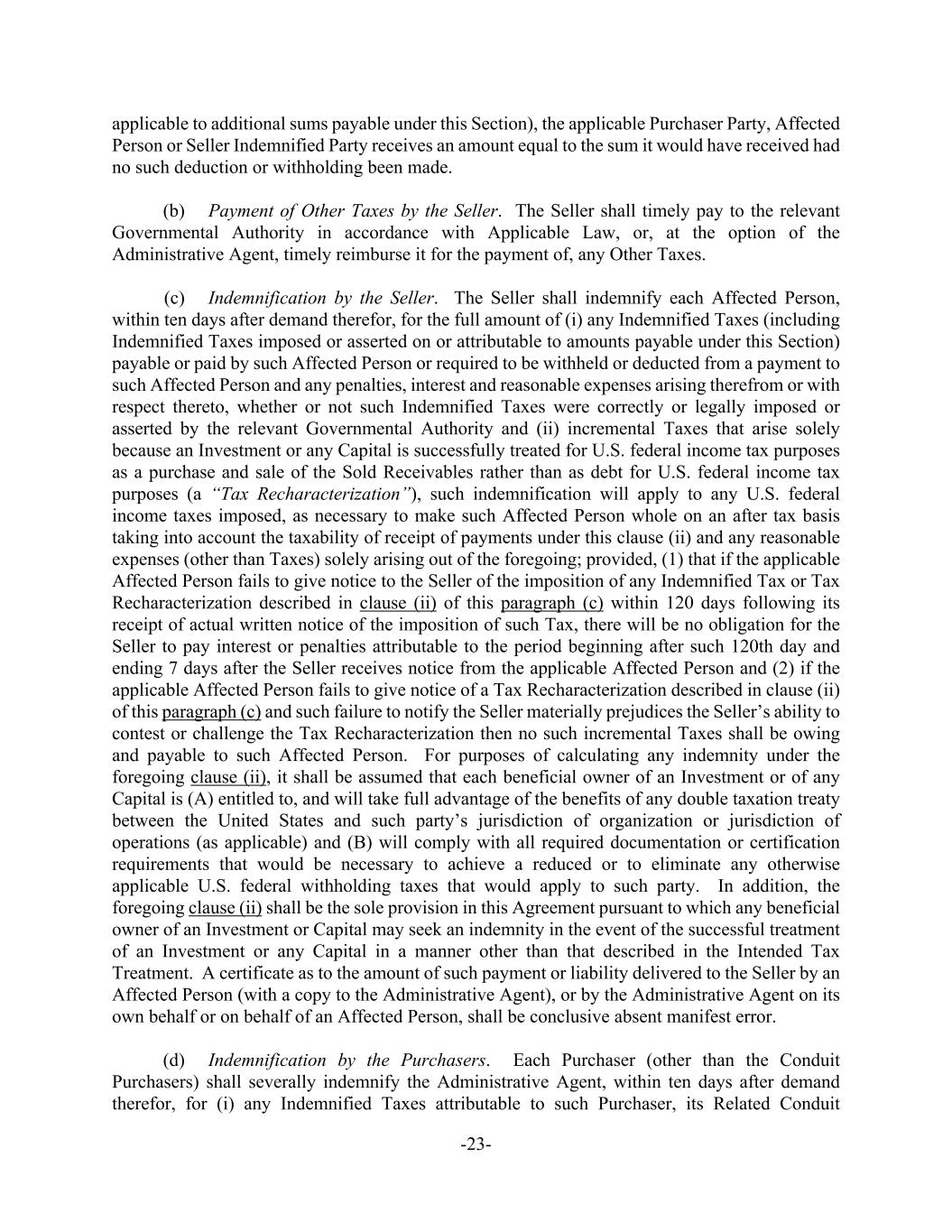 -23- applicable to additional sums payable under this Section), the applicable Purchaser Party, Affected Person or Seller Indemnified Party receives an amount equal to the sum it would have received had no such deduction or withholding been made. (b) Payment of Other Taxes by the Seller. The Seller shall timely pay to the relevant Governmental Authority in accordance with Applicable Law, or, at the option of the Administrative Agent, timely reimburse it for the payment of, any Other Taxes. (c) Indemnification by the Seller. The Seller shall indemnify each Affected Person, within ten days after demand therefor, for the full amount of (i) any Indemnified Taxes (including Indemnified Taxes imposed or asserted on or attributable to amounts payable under this Section) payable or paid by such Affected Person or required to be withheld or deducted from a payment to such Affected Person and any penalties, interest and reasonable expenses arising therefrom or with respect thereto, whether or not such Indemnified Taxes were correctly or legally imposed or asserted by the relevant Governmental Authority and (ii) incremental Taxes that arise solely because an Investment or any Capital is successfully treated for U.S. federal income tax purposes as a purchase and sale of the Sold Receivables rather than as debt for U.S. federal income tax purposes (a “Tax Recharacterization”), such indemnification will apply to any U.S. federal income taxes imposed, as necessary to make such Affected Person whole on an after tax basis taking into account the taxability of receipt of payments under this clause (ii) and any reasonable expenses (other than Taxes) solely arising out of the foregoing; provided, (1) that if the applicable Affected Person fails to give notice to the Seller of the imposition of any Indemnified Tax or Tax Recharacterization described in clause (ii) of this paragraph (c) within 120 days following its receipt of actual written notice of the imposition of such Tax, there will be no obligation for the Seller to pay interest or penalties attributable to the period beginning after such 120th day and ending 7 days after the Seller receives notice from the applicable Affected Person and (2) if the applicable Affected Person fails to give notice of a Tax Recharacterization described in clause (ii) of this paragraph (c) and such failure to notify the Seller materially prejudices the Seller’s ability to contest or challenge the Tax Recharacterization then no such incremental Taxes shall be owing and payable to such Affected Person. For purposes of calculating any indemnity under the foregoing clause (ii), it shall be assumed that each beneficial owner of an Investment or of any Capital is (A) entitled to, and will take full advantage of the benefits of any double taxation treaty between the United States and such party’s jurisdiction of organization or jurisdiction of operations (as applicable) and (B) will comply with all required documentation or certification requirements that would be necessary to achieve a reduced or to eliminate any otherwise applicable U.S. federal withholding taxes that would apply to such party. In addition, the foregoing clause (ii) shall be the sole provision in this Agreement pursuant to which any beneficial owner of an Investment or Capital may seek an indemnity in the event of the successful treatment of an Investment or any Capital in a manner other than that described in the Intended Tax Treatment. A certificate as to the amount of such payment or liability delivered to the Seller by an Affected Person (with a copy to the Administrative Agent), or by the Administrative Agent on its own behalf or on behalf of an Affected Person, shall be conclusive absent manifest error. (d) Indemnification by the Purchasers. Each Purchaser (other than the Conduit Purchasers) shall severally indemnify the Administrative Agent, within ten days after demand therefor, for (i) any Indemnified Taxes attributable to such Purchaser, its Related Conduit