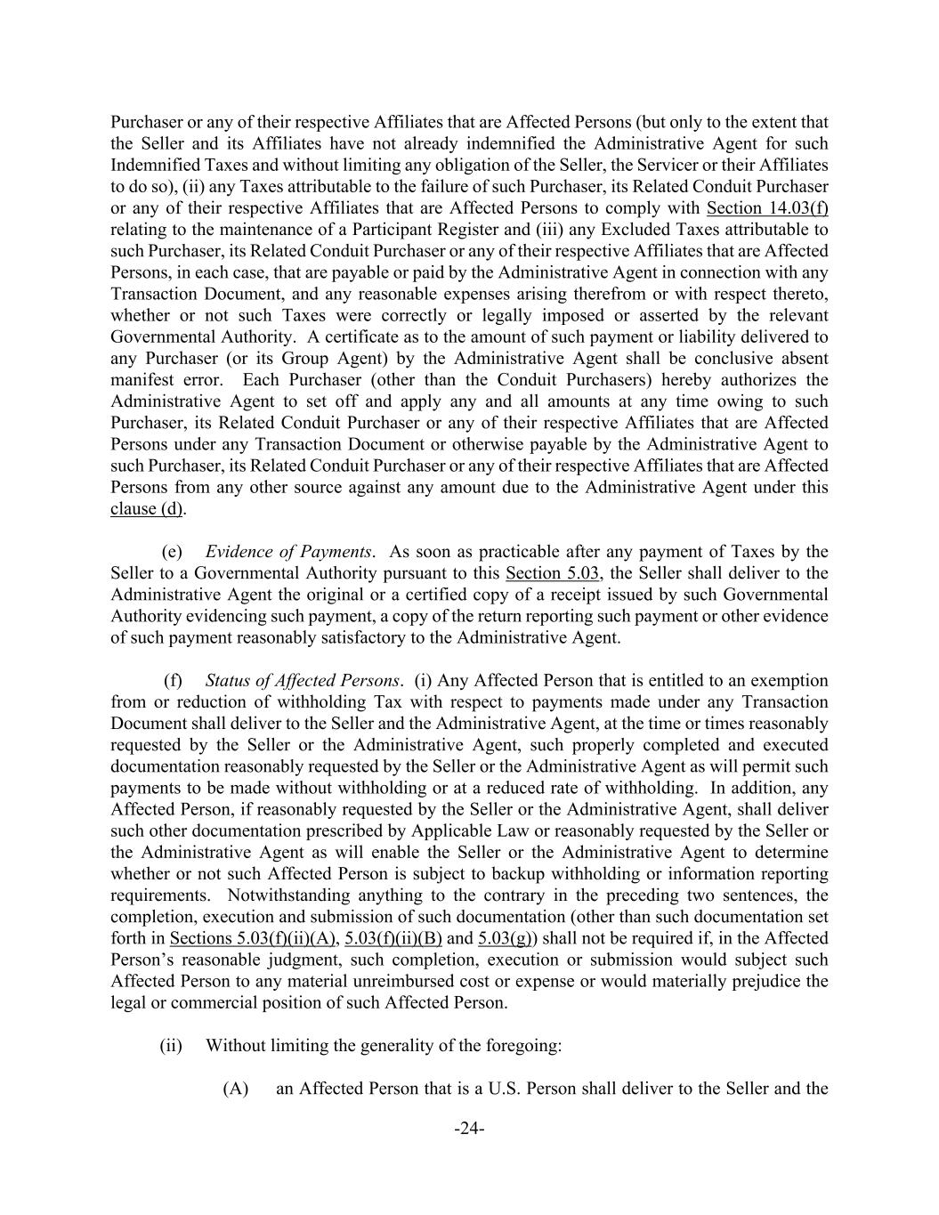 -24- Purchaser or any of their respective Affiliates that are Affected Persons (but only to the extent that the Seller and its Affiliates have not already indemnified the Administrative Agent for such Indemnified Taxes and without limiting any obligation of the Seller, the Servicer or their Affiliates to do so), (ii) any Taxes attributable to the failure of such Purchaser, its Related Conduit Purchaser or any of their respective Affiliates that are Affected Persons to comply with Section 14.03(f) relating to the maintenance of a Participant Register and (iii) any Excluded Taxes attributable to such Purchaser, its Related Conduit Purchaser or any of their respective Affiliates that are Affected Persons, in each case, that are payable or paid by the Administrative Agent in connection with any Transaction Document, and any reasonable expenses arising therefrom or with respect thereto, whether or not such Taxes were correctly or legally imposed or asserted by the relevant Governmental Authority. A certificate as to the amount of such payment or liability delivered to any Purchaser (or its Group Agent) by the Administrative Agent shall be conclusive absent manifest error. Each Purchaser (other than the Conduit Purchasers) hereby authorizes the Administrative Agent to set off and apply any and all amounts at any time owing to such Purchaser, its Related Conduit Purchaser or any of their respective Affiliates that are Affected Persons under any Transaction Document or otherwise payable by the Administrative Agent to such Purchaser, its Related Conduit Purchaser or any of their respective Affiliates that are Affected Persons from any other source against any amount due to the Administrative Agent under this clause (d). (e) Evidence of Payments. As soon as practicable after any payment of Taxes by the Seller to a Governmental Authority pursuant to this Section 5.03, the Seller shall deliver to the Administrative Agent the original or a certified copy of a receipt issued by such Governmental Authority evidencing such payment, a copy of the return reporting such payment or other evidence of such payment reasonably satisfactory to the Administrative Agent. (f) Status of Affected Persons. (i) Any Affected Person that is entitled to an exemption from or reduction of withholding Tax with respect to payments made under any Transaction Document shall deliver to the Seller and the Administrative Agent, at the time or times reasonably requested by the Seller or the Administrative Agent, such properly completed and executed documentation reasonably requested by the Seller or the Administrative Agent as will permit such payments to be made without withholding or at a reduced rate of withholding. In addition, any Affected Person, if reasonably requested by the Seller or the Administrative Agent, shall deliver such other documentation prescribed by Applicable Law or reasonably requested by the Seller or the Administrative Agent as will enable the Seller or the Administrative Agent to determine whether or not such Affected Person is subject to backup withholding or information reporting requirements. Notwithstanding anything to the contrary in the preceding two sentences, the completion, execution and submission of such documentation (other than such documentation set forth in Sections 5.03(f)(ii)(A), 5.03(f)(ii)(B) and 5.03(g)) shall not be required if, in the Affected Person’s reasonable judgment, such completion, execution or submission would subject such Affected Person to any material unreimbursed cost or expense or would materially prejudice the legal or commercial position of such Affected Person. (ii) Without limiting the generality of the foregoing: (A) an Affected Person that is a U.S. Person shall deliver to the Seller and the