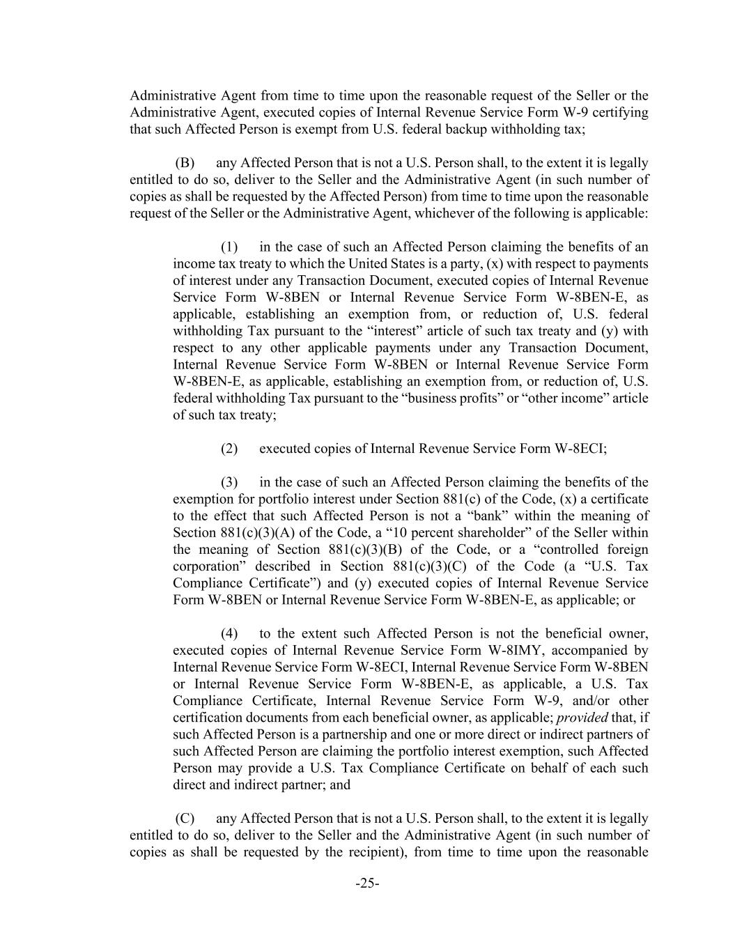 -25- Administrative Agent from time to time upon the reasonable request of the Seller or the Administrative Agent, executed copies of Internal Revenue Service Form W-9 certifying that such Affected Person is exempt from U.S. federal backup withholding tax; (B) any Affected Person that is not a U.S. Person shall, to the extent it is legally entitled to do so, deliver to the Seller and the Administrative Agent (in such number of copies as shall be requested by the Affected Person) from time to time upon the reasonable request of the Seller or the Administrative Agent, whichever of the following is applicable: (1) in the case of such an Affected Person claiming the benefits of an income tax treaty to which the United States is a party, (x) with respect to payments of interest under any Transaction Document, executed copies of Internal Revenue Service Form W-8BEN or Internal Revenue Service Form W-8BEN-E, as applicable, establishing an exemption from, or reduction of, U.S. federal withholding Tax pursuant to the “interest” article of such tax treaty and (y) with respect to any other applicable payments under any Transaction Document, Internal Revenue Service Form W-8BEN or Internal Revenue Service Form W-8BEN-E, as applicable, establishing an exemption from, or reduction of, U.S. federal withholding Tax pursuant to the “business profits” or “other income” article of such tax treaty; (2) executed copies of Internal Revenue Service Form W-8ECI; (3) in the case of such an Affected Person claiming the benefits of the exemption for portfolio interest under Section 881(c) of the Code, (x) a certificate to the effect that such Affected Person is not a “bank” within the meaning of Section 881(c)(3)(A) of the Code, a “10 percent shareholder” of the Seller within the meaning of Section 881(c)(3)(B) of the Code, or a “controlled foreign corporation” described in Section 881(c)(3)(C) of the Code (a “U.S. Tax Compliance Certificate”) and (y) executed copies of Internal Revenue Service Form W-8BEN or Internal Revenue Service Form W-8BEN-E, as applicable; or (4) to the extent such Affected Person is not the beneficial owner, executed copies of Internal Revenue Service Form W-8IMY, accompanied by Internal Revenue Service Form W-8ECI, Internal Revenue Service Form W-8BEN or Internal Revenue Service Form W-8BEN-E, as applicable, a U.S. Tax Compliance Certificate, Internal Revenue Service Form W-9, and/or other certification documents from each beneficial owner, as applicable; provided that, if such Affected Person is a partnership and one or more direct or indirect partners of such Affected Person are claiming the portfolio interest exemption, such Affected Person may provide a U.S. Tax Compliance Certificate on behalf of each such direct and indirect partner; and (C) any Affected Person that is not a U.S. Person shall, to the extent it is legally entitled to do so, deliver to the Seller and the Administrative Agent (in such number of copies as shall be requested by the recipient), from time to time upon the reasonable