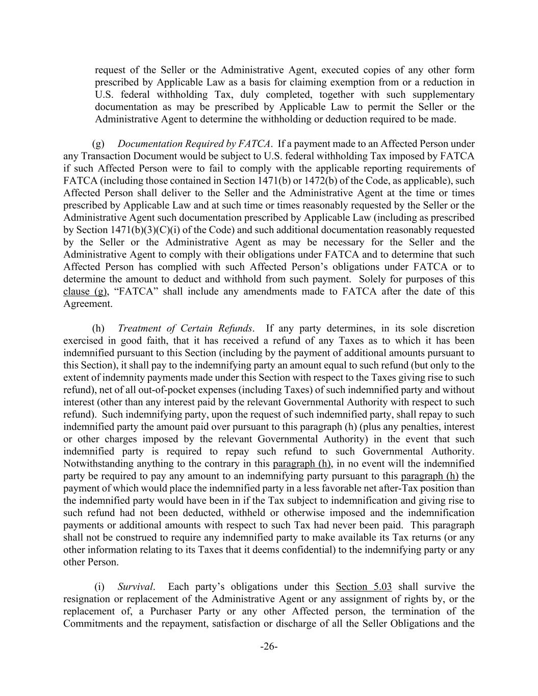 -26- request of the Seller or the Administrative Agent, executed copies of any other form prescribed by Applicable Law as a basis for claiming exemption from or a reduction in U.S. federal withholding Tax, duly completed, together with such supplementary documentation as may be prescribed by Applicable Law to permit the Seller or the Administrative Agent to determine the withholding or deduction required to be made. (g) Documentation Required by FATCA. If a payment made to an Affected Person under any Transaction Document would be subject to U.S. federal withholding Tax imposed by FATCA if such Affected Person were to fail to comply with the applicable reporting requirements of FATCA (including those contained in Section 1471(b) or 1472(b) of the Code, as applicable), such Affected Person shall deliver to the Seller and the Administrative Agent at the time or times prescribed by Applicable Law and at such time or times reasonably requested by the Seller or the Administrative Agent such documentation prescribed by Applicable Law (including as prescribed by Section 1471(b)(3)(C)(i) of the Code) and such additional documentation reasonably requested by the Seller or the Administrative Agent as may be necessary for the Seller and the Administrative Agent to comply with their obligations under FATCA and to determine that such Affected Person has complied with such Affected Person’s obligations under FATCA or to determine the amount to deduct and withhold from such payment. Solely for purposes of this clause (g), “FATCA” shall include any amendments made to FATCA after the date of this Agreement. (h) Treatment of Certain Refunds. If any party determines, in its sole discretion exercised in good faith, that it has received a refund of any Taxes as to which it has been indemnified pursuant to this Section (including by the payment of additional amounts pursuant to this Section), it shall pay to the indemnifying party an amount equal to such refund (but only to the extent of indemnity payments made under this Section with respect to the Taxes giving rise to such refund), net of all out-of-pocket expenses (including Taxes) of such indemnified party and without interest (other than any interest paid by the relevant Governmental Authority with respect to such refund). Such indemnifying party, upon the request of such indemnified party, shall repay to such indemnified party the amount paid over pursuant to this paragraph (h) (plus any penalties, interest or other charges imposed by the relevant Governmental Authority) in the event that such indemnified party is required to repay such refund to such Governmental Authority. Notwithstanding anything to the contrary in this paragraph (h), in no event will the indemnified party be required to pay any amount to an indemnifying party pursuant to this paragraph (h) the payment of which would place the indemnified party in a less favorable net after-Tax position than the indemnified party would have been in if the Tax subject to indemnification and giving rise to such refund had not been deducted, withheld or otherwise imposed and the indemnification payments or additional amounts with respect to such Tax had never been paid. This paragraph shall not be construed to require any indemnified party to make available its Tax returns (or any other information relating to its Taxes that it deems confidential) to the indemnifying party or any other Person. (i) Survival. Each party’s obligations under this Section 5.03 shall survive the resignation or replacement of the Administrative Agent or any assignment of rights by, or the replacement of, a Purchaser Party or any other Affected person, the termination of the Commitments and the repayment, satisfaction or discharge of all the Seller Obligations and the