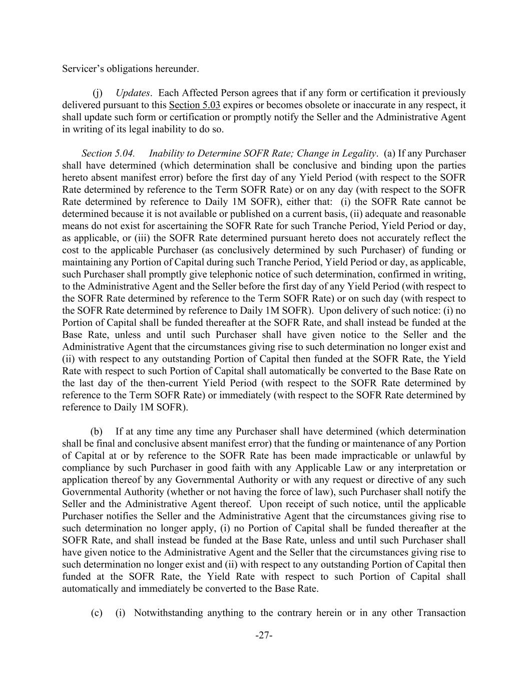 -27- Servicer’s obligations hereunder. (j) Updates. Each Affected Person agrees that if any form or certification it previously delivered pursuant to this Section 5.03 expires or becomes obsolete or inaccurate in any respect, it shall update such form or certification or promptly notify the Seller and the Administrative Agent in writing of its legal inability to do so. Section 5.04. Inability to Determine SOFR Rate; Change in Legality. (a) If any Purchaser shall have determined (which determination shall be conclusive and binding upon the parties hereto absent manifest error) before the first day of any Yield Period (with respect to the SOFR Rate determined by reference to the Term SOFR Rate) or on any day (with respect to the SOFR Rate determined by reference to Daily 1M SOFR), either that: (i) the SOFR Rate cannot be determined because it is not available or published on a current basis, (ii) adequate and reasonable means do not exist for ascertaining the SOFR Rate for such Tranche Period, Yield Period or day, as applicable, or (iii) the SOFR Rate determined pursuant hereto does not accurately reflect the cost to the applicable Purchaser (as conclusively determined by such Purchaser) of funding or maintaining any Portion of Capital during such Tranche Period, Yield Period or day, as applicable, such Purchaser shall promptly give telephonic notice of such determination, confirmed in writing, to the Administrative Agent and the Seller before the first day of any Yield Period (with respect to the SOFR Rate determined by reference to the Term SOFR Rate) or on such day (with respect to the SOFR Rate determined by reference to Daily 1M SOFR). Upon delivery of such notice: (i) no Portion of Capital shall be funded thereafter at the SOFR Rate, and shall instead be funded at the Base Rate, unless and until such Purchaser shall have given notice to the Seller and the Administrative Agent that the circumstances giving rise to such determination no longer exist and (ii) with respect to any outstanding Portion of Capital then funded at the SOFR Rate, the Yield Rate with respect to such Portion of Capital shall automatically be converted to the Base Rate on the last day of the then-current Yield Period (with respect to the SOFR Rate determined by reference to the Term SOFR Rate) or immediately (with respect to the SOFR Rate determined by reference to Daily 1M SOFR). (b) If at any time any time any Purchaser shall have determined (which determination shall be final and conclusive absent manifest error) that the funding or maintenance of any Portion of Capital at or by reference to the SOFR Rate has been made impracticable or unlawful by compliance by such Purchaser in good faith with any Applicable Law or any interpretation or application thereof by any Governmental Authority or with any request or directive of any such Governmental Authority (whether or not having the force of law), such Purchaser shall notify the Seller and the Administrative Agent thereof. Upon receipt of such notice, until the applicable Purchaser notifies the Seller and the Administrative Agent that the circumstances giving rise to such determination no longer apply, (i) no Portion of Capital shall be funded thereafter at the SOFR Rate, and shall instead be funded at the Base Rate, unless and until such Purchaser shall have given notice to the Administrative Agent and the Seller that the circumstances giving rise to such determination no longer exist and (ii) with respect to any outstanding Portion of Capital then funded at the SOFR Rate, the Yield Rate with respect to such Portion of Capital shall automatically and immediately be converted to the Base Rate. (c) (i) Notwithstanding anything to the contrary herein or in any other Transaction