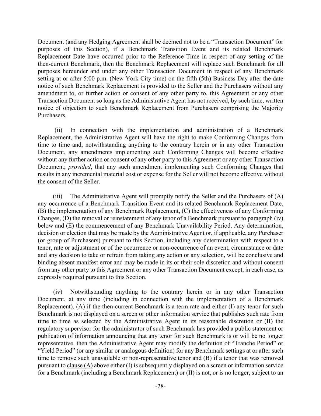 -28- Document (and any Hedging Agreement shall be deemed not to be a “Transaction Document” for purposes of this Section), if a Benchmark Transition Event and its related Benchmark Replacement Date have occurred prior to the Reference Time in respect of any setting of the then-current Benchmark, then the Benchmark Replacement will replace such Benchmark for all purposes hereunder and under any other Transaction Document in respect of any Benchmark setting at or after 5:00 p.m. (New York City time) on the fifth (5th) Business Day after the date notice of such Benchmark Replacement is provided to the Seller and the Purchasers without any amendment to, or further action or consent of any other party to, this Agreement or any other Transaction Document so long as the Administrative Agent has not received, by such time, written notice of objection to such Benchmark Replacement from Purchasers comprising the Majority Purchasers. (ii) In connection with the implementation and administration of a Benchmark Replacement, the Administrative Agent will have the right to make Conforming Changes from time to time and, notwithstanding anything to the contrary herein or in any other Transaction Document, any amendments implementing such Conforming Changes will become effective without any further action or consent of any other party to this Agreement or any other Transaction Document; provided, that any such amendment implementing such Conforming Changes that results in any incremental material cost or expense for the Seller will not become effective without the consent of the Seller. (iii) The Administrative Agent will promptly notify the Seller and the Purchasers of (A) any occurrence of a Benchmark Transition Event and its related Benchmark Replacement Date, (B) the implementation of any Benchmark Replacement, (C) the effectiveness of any Conforming Changes, (D) the removal or reinstatement of any tenor of a Benchmark pursuant to paragraph (iv) below and (E) the commencement of any Benchmark Unavailability Period. Any determination, decision or election that may be made by the Administrative Agent or, if applicable, any Purchaser (or group of Purchasers) pursuant to this Section, including any determination with respect to a tenor, rate or adjustment or of the occurrence or non-occurrence of an event, circumstance or date and any decision to take or refrain from taking any action or any selection, will be conclusive and binding absent manifest error and may be made in its or their sole discretion and without consent from any other party to this Agreement or any other Transaction Document except, in each case, as expressly required pursuant to this Section. (iv) Notwithstanding anything to the contrary herein or in any other Transaction Document, at any time (including in connection with the implementation of a Benchmark Replacement), (A) if the then-current Benchmark is a term rate and either (I) any tenor for such Benchmark is not displayed on a screen or other information service that publishes such rate from time to time as selected by the Administrative Agent in its reasonable discretion or (II) the regulatory supervisor for the administrator of such Benchmark has provided a public statement or publication of information announcing that any tenor for such Benchmark is or will be no longer representative, then the Administrative Agent may modify the definition of “Tranche Period” or “Yield Period” (or any similar or analogous definition) for any Benchmark settings at or after such time to remove such unavailable or non-representative tenor and (B) if a tenor that was removed pursuant to clause (A) above either (I) is subsequently displayed on a screen or information service for a Benchmark (including a Benchmark Replacement) or (II) is not, or is no longer, subject to an