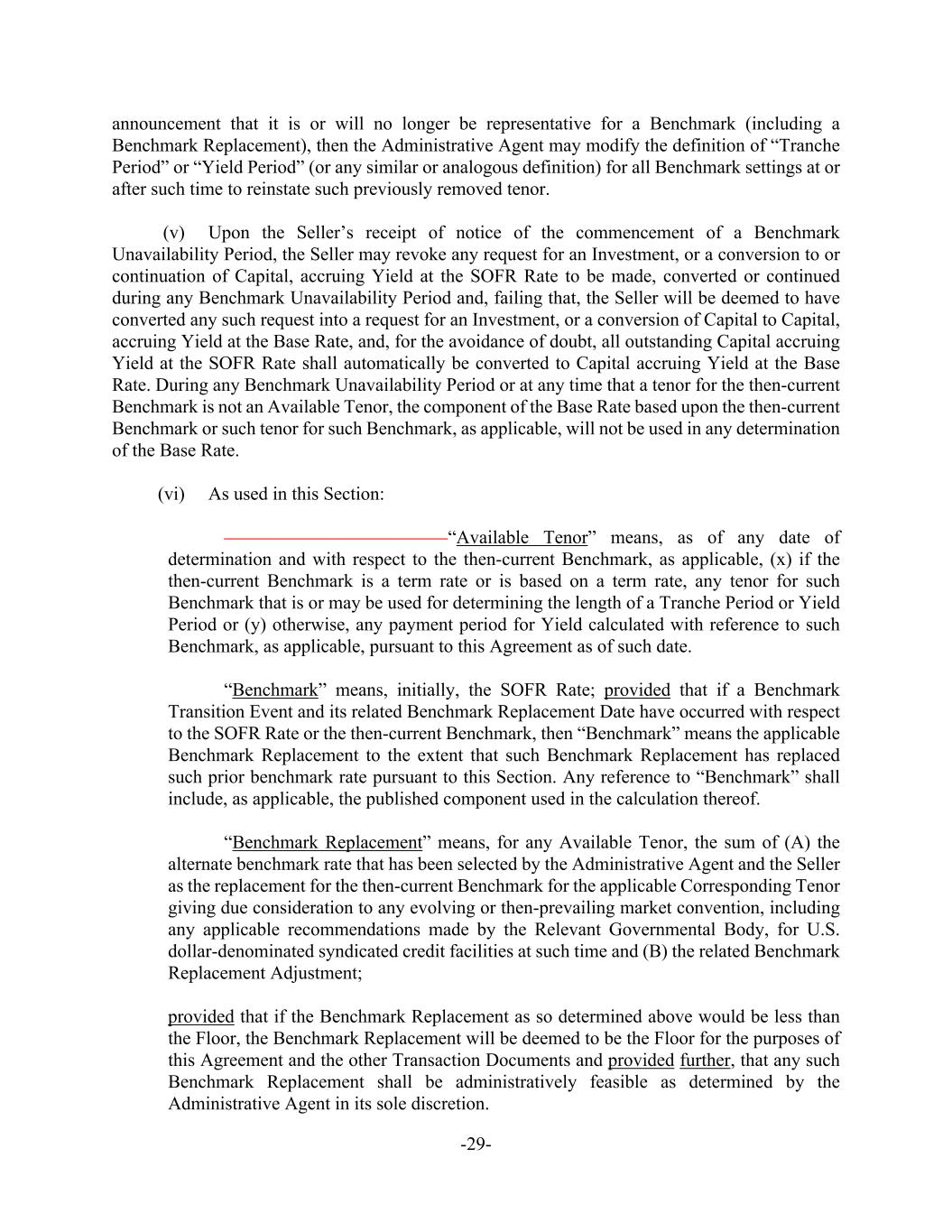 -29- announcement that it is or will no longer be representative for a Benchmark (including a Benchmark Replacement), then the Administrative Agent may modify the definition of “Tranche Period” or “Yield Period” (or any similar or analogous definition) for all Benchmark settings at or after such time to reinstate such previously removed tenor. (v) Upon the Seller’s receipt of notice of the commencement of a Benchmark Unavailability Period, the Seller may revoke any request for an Investment, or a conversion to or continuation of Capital, accruing Yield at the SOFR Rate to be made, converted or continued during any Benchmark Unavailability Period and, failing that, the Seller will be deemed to have converted any such request into a request for an Investment, or a conversion of Capital to Capital, accruing Yield at the Base Rate, and, for the avoidance of doubt, all outstanding Capital accruing Yield at the SOFR Rate shall automatically be converted to Capital accruing Yield at the Base Rate. During any Benchmark Unavailability Period or at any time that a tenor for the then-current Benchmark is not an Available Tenor, the component of the Base Rate based upon the then-current Benchmark or such tenor for such Benchmark, as applicable, will not be used in any determination of the Base Rate. (vi) As used in this Section: “Available Tenor” means, as of any date of determination and with respect to the then-current Benchmark, as applicable, (x) if the then-current Benchmark is a term rate or is based on a term rate, any tenor for such Benchmark that is or may be used for determining the length of a Tranche Period or Yield Period or (y) otherwise, any payment period for Yield calculated with reference to such Benchmark, as applicable, pursuant to this Agreement as of such date. “Benchmark” means, initially, the SOFR Rate; provided that if a Benchmark Transition Event and its related Benchmark Replacement Date have occurred with respect to the SOFR Rate or the then-current Benchmark, then “Benchmark” means the applicable Benchmark Replacement to the extent that such Benchmark Replacement has replaced such prior benchmark rate pursuant to this Section. Any reference to “Benchmark” shall include, as applicable, the published component used in the calculation thereof. “Benchmark Replacement” means, for any Available Tenor, the sum of (A) the alternate benchmark rate that has been selected by the Administrative Agent and the Seller as the replacement for the then-current Benchmark for the applicable Corresponding Tenor giving due consideration to any evolving or then-prevailing market convention, including any applicable recommendations made by the Relevant Governmental Body, for U.S. dollar-denominated syndicated credit facilities at such time and (B) the related Benchmark Replacement Adjustment; provided that if the Benchmark Replacement as so determined above would be less than the Floor, the Benchmark Replacement will be deemed to be the Floor for the purposes of this Agreement and the other Transaction Documents and provided further, that any such Benchmark Replacement shall be administratively feasible as determined by the Administrative Agent in its sole discretion.