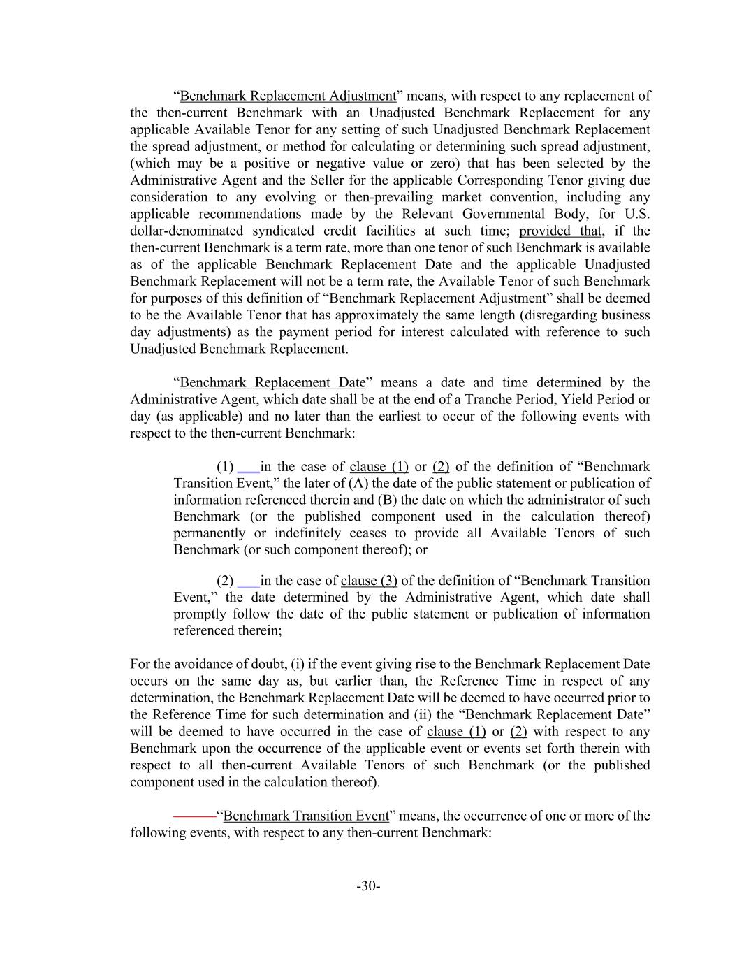 -30- “Benchmark Replacement Adjustment” means, with respect to any replacement of the then-current Benchmark with an Unadjusted Benchmark Replacement for any applicable Available Tenor for any setting of such Unadjusted Benchmark Replacement the spread adjustment, or method for calculating or determining such spread adjustment, (which may be a positive or negative value or zero) that has been selected by the Administrative Agent and the Seller for the applicable Corresponding Tenor giving due consideration to any evolving or then-prevailing market convention, including any applicable recommendations made by the Relevant Governmental Body, for U.S. dollar-denominated syndicated credit facilities at such time; provided that, if the then-current Benchmark is a term rate, more than one tenor of such Benchmark is available as of the applicable Benchmark Replacement Date and the applicable Unadjusted Benchmark Replacement will not be a term rate, the Available Tenor of such Benchmark for purposes of this definition of “Benchmark Replacement Adjustment” shall be deemed to be the Available Tenor that has approximately the same length (disregarding business day adjustments) as the payment period for interest calculated with reference to such Unadjusted Benchmark Replacement. “Benchmark Replacement Date” means a date and time determined by the Administrative Agent, which date shall be at the end of a Tranche Period, Yield Period or day (as applicable) and no later than the earliest to occur of the following events with respect to the then-current Benchmark: (1) in the case of clause (1) or (2) of the definition of “Benchmark Transition Event,” the later of (A) the date of the public statement or publication of information referenced therein and (B) the date on which the administrator of such Benchmark (or the published component used in the calculation thereof) permanently or indefinitely ceases to provide all Available Tenors of such Benchmark (or such component thereof); or (2) in the case of clause (3) of the definition of “Benchmark Transition Event,” the date determined by the Administrative Agent, which date shall promptly follow the date of the public statement or publication of information referenced therein; For the avoidance of doubt, (i) if the event giving rise to the Benchmark Replacement Date occurs on the same day as, but earlier than, the Reference Time in respect of any determination, the Benchmark Replacement Date will be deemed to have occurred prior to the Reference Time for such determination and (ii) the “Benchmark Replacement Date” will be deemed to have occurred in the case of clause (1) or (2) with respect to any Benchmark upon the occurrence of the applicable event or events set forth therein with respect to all then-current Available Tenors of such Benchmark (or the published component used in the calculation thereof). “Benchmark Transition Event” means, the occurrence of one or more of the following events, with respect to any then-current Benchmark: