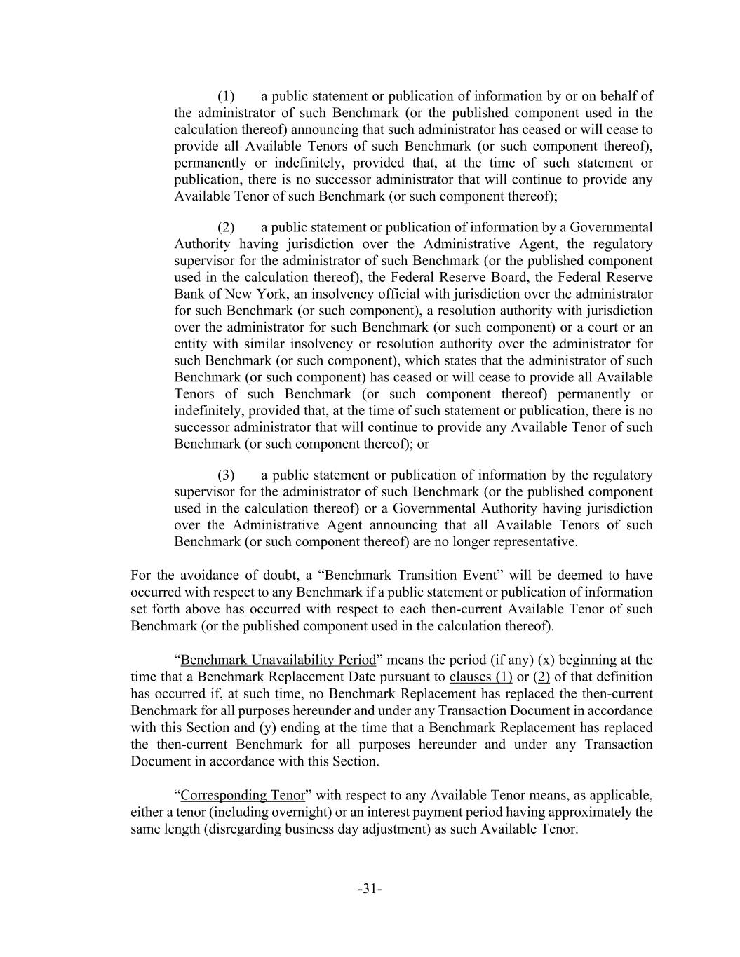 -31- (1) a public statement or publication of information by or on behalf of the administrator of such Benchmark (or the published component used in the calculation thereof) announcing that such administrator has ceased or will cease to provide all Available Tenors of such Benchmark (or such component thereof), permanently or indefinitely, provided that, at the time of such statement or publication, there is no successor administrator that will continue to provide any Available Tenor of such Benchmark (or such component thereof); (2) a public statement or publication of information by a Governmental Authority having jurisdiction over the Administrative Agent, the regulatory supervisor for the administrator of such Benchmark (or the published component used in the calculation thereof), the Federal Reserve Board, the Federal Reserve Bank of New York, an insolvency official with jurisdiction over the administrator for such Benchmark (or such component), a resolution authority with jurisdiction over the administrator for such Benchmark (or such component) or a court or an entity with similar insolvency or resolution authority over the administrator for such Benchmark (or such component), which states that the administrator of such Benchmark (or such component) has ceased or will cease to provide all Available Tenors of such Benchmark (or such component thereof) permanently or indefinitely, provided that, at the time of such statement or publication, there is no successor administrator that will continue to provide any Available Tenor of such Benchmark (or such component thereof); or (3) a public statement or publication of information by the regulatory supervisor for the administrator of such Benchmark (or the published component used in the calculation thereof) or a Governmental Authority having jurisdiction over the Administrative Agent announcing that all Available Tenors of such Benchmark (or such component thereof) are no longer representative. For the avoidance of doubt, a “Benchmark Transition Event” will be deemed to have occurred with respect to any Benchmark if a public statement or publication of information set forth above has occurred with respect to each then-current Available Tenor of such Benchmark (or the published component used in the calculation thereof). “Benchmark Unavailability Period” means the period (if any) (x) beginning at the time that a Benchmark Replacement Date pursuant to clauses (1) or (2) of that definition has occurred if, at such time, no Benchmark Replacement has replaced the then-current Benchmark for all purposes hereunder and under any Transaction Document in accordance with this Section and (y) ending at the time that a Benchmark Replacement has replaced the then-current Benchmark for all purposes hereunder and under any Transaction Document in accordance with this Section. “Corresponding Tenor” with respect to any Available Tenor means, as applicable, either a tenor (including overnight) or an interest payment period having approximately the same length (disregarding business day adjustment) as such Available Tenor.