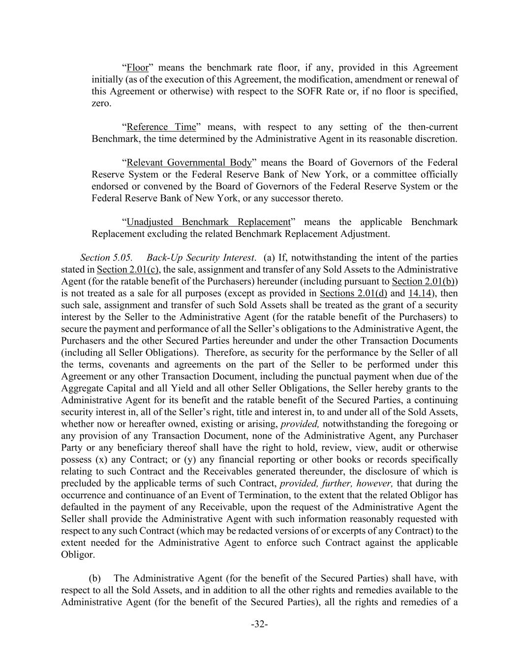 -32- “Floor” means the benchmark rate floor, if any, provided in this Agreement initially (as of the execution of this Agreement, the modification, amendment or renewal of this Agreement or otherwise) with respect to the SOFR Rate or, if no floor is specified, zero. “Reference Time” means, with respect to any setting of the then-current Benchmark, the time determined by the Administrative Agent in its reasonable discretion. “Relevant Governmental Body” means the Board of Governors of the Federal Reserve System or the Federal Reserve Bank of New York, or a committee officially endorsed or convened by the Board of Governors of the Federal Reserve System or the Federal Reserve Bank of New York, or any successor thereto. “Unadjusted Benchmark Replacement” means the applicable Benchmark Replacement excluding the related Benchmark Replacement Adjustment. Section 5.05. Back-Up Security Interest. (a) If, notwithstanding the intent of the parties stated in Section 2.01(c), the sale, assignment and transfer of any Sold Assets to the Administrative Agent (for the ratable benefit of the Purchasers) hereunder (including pursuant to Section 2.01(b)) is not treated as a sale for all purposes (except as provided in Sections 2.01(d) and 14.14), then such sale, assignment and transfer of such Sold Assets shall be treated as the grant of a security interest by the Seller to the Administrative Agent (for the ratable benefit of the Purchasers) to secure the payment and performance of all the Seller’s obligations to the Administrative Agent, the Purchasers and the other Secured Parties hereunder and under the other Transaction Documents (including all Seller Obligations). Therefore, as security for the performance by the Seller of all the terms, covenants and agreements on the part of the Seller to be performed under this Agreement or any other Transaction Document, including the punctual payment when due of the Aggregate Capital and all Yield and all other Seller Obligations, the Seller hereby grants to the Administrative Agent for its benefit and the ratable benefit of the Secured Parties, a continuing security interest in, all of the Seller’s right, title and interest in, to and under all of the Sold Assets, whether now or hereafter owned, existing or arising, provided, notwithstanding the foregoing or any provision of any Transaction Document, none of the Administrative Agent, any Purchaser Party or any beneficiary thereof shall have the right to hold, review, view, audit or otherwise possess (x) any Contract; or (y) any financial reporting or other books or records specifically relating to such Contract and the Receivables generated thereunder, the disclosure of which is precluded by the applicable terms of such Contract, provided, further, however, that during the occurrence and continuance of an Event of Termination, to the extent that the related Obligor has defaulted in the payment of any Receivable, upon the request of the Administrative Agent the Seller shall provide the Administrative Agent with such information reasonably requested with respect to any such Contract (which may be redacted versions of or excerpts of any Contract) to the extent needed for the Administrative Agent to enforce such Contract against the applicable Obligor. (b) The Administrative Agent (for the benefit of the Secured Parties) shall have, with respect to all the Sold Assets, and in addition to all the other rights and remedies available to the Administrative Agent (for the benefit of the Secured Parties), all the rights and remedies of a
