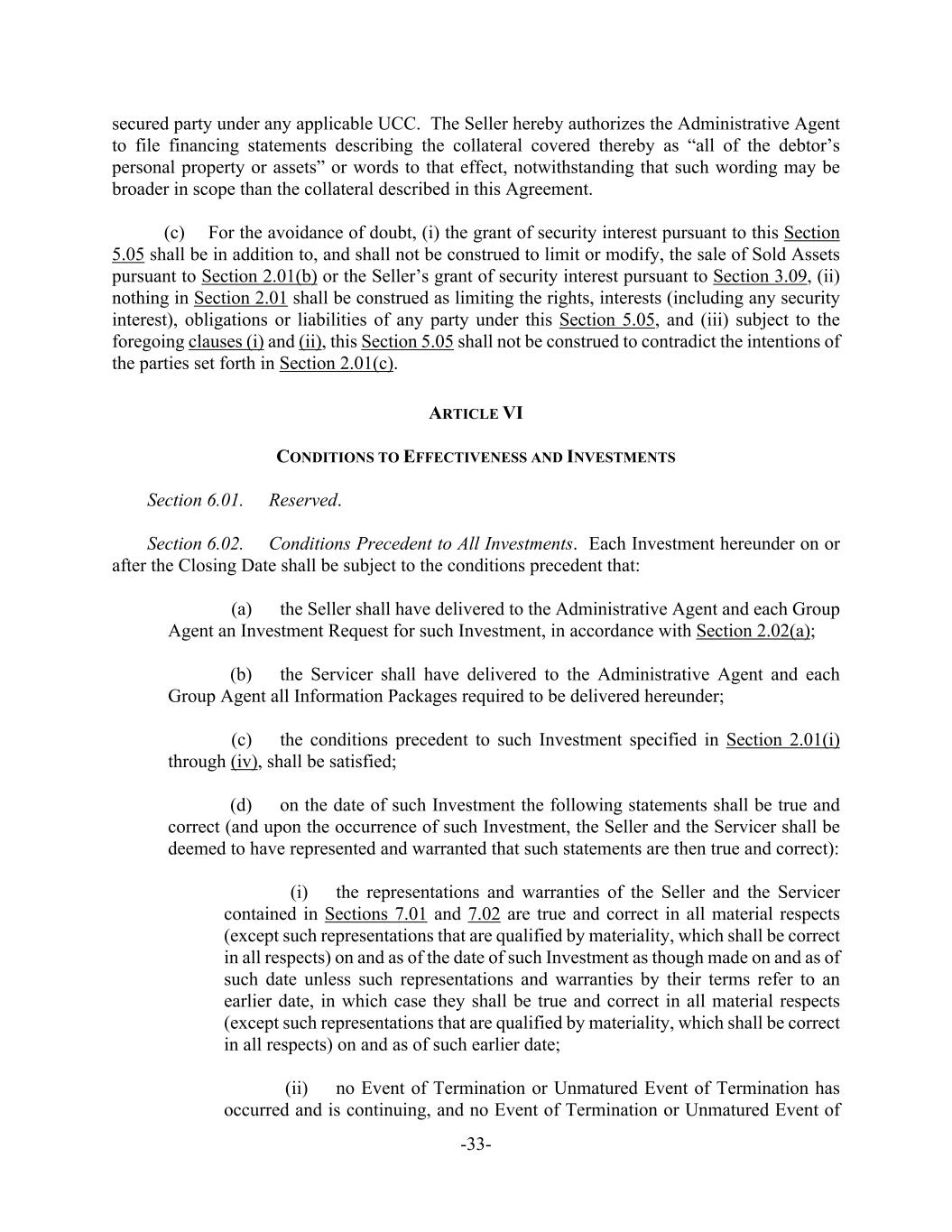 -33- secured party under any applicable UCC. The Seller hereby authorizes the Administrative Agent to file financing statements describing the collateral covered thereby as “all of the debtor’s personal property or assets” or words to that effect, notwithstanding that such wording may be broader in scope than the collateral described in this Agreement. (c) For the avoidance of doubt, (i) the grant of security interest pursuant to this Section 5.05 shall be in addition to, and shall not be construed to limit or modify, the sale of Sold Assets pursuant to Section 2.01(b) or the Seller’s grant of security interest pursuant to Section 3.09, (ii) nothing in Section 2.01 shall be construed as limiting the rights, interests (including any security interest), obligations or liabilities of any party under this Section 5.05, and (iii) subject to the foregoing clauses (i) and (ii), this Section 5.05 shall not be construed to contradict the intentions of the parties set forth in Section 2.01(c). ARTICLE VI CONDITIONS TO EFFECTIVENESS AND INVESTMENTS Section 6.01. Reserved. Section 6.02. Conditions Precedent to All Investments. Each Investment hereunder on or after the Closing Date shall be subject to the conditions precedent that: (a) the Seller shall have delivered to the Administrative Agent and each Group Agent an Investment Request for such Investment, in accordance with Section 2.02(a); (b) the Servicer shall have delivered to the Administrative Agent and each Group Agent all Information Packages required to be delivered hereunder; (c) the conditions precedent to such Investment specified in Section 2.01(i) through (iv), shall be satisfied; (d) on the date of such Investment the following statements shall be true and correct (and upon the occurrence of such Investment, the Seller and the Servicer shall be deemed to have represented and warranted that such statements are then true and correct): (i) the representations and warranties of the Seller and the Servicer contained in Sections 7.01 and 7.02 are true and correct in all material respects (except such representations that are qualified by materiality, which shall be correct in all respects) on and as of the date of such Investment as though made on and as of such date unless such representations and warranties by their terms refer to an earlier date, in which case they shall be true and correct in all material respects (except such representations that are qualified by materiality, which shall be correct in all respects) on and as of such earlier date; (ii) no Event of Termination or Unmatured Event of Termination has occurred and is continuing, and no Event of Termination or Unmatured Event of