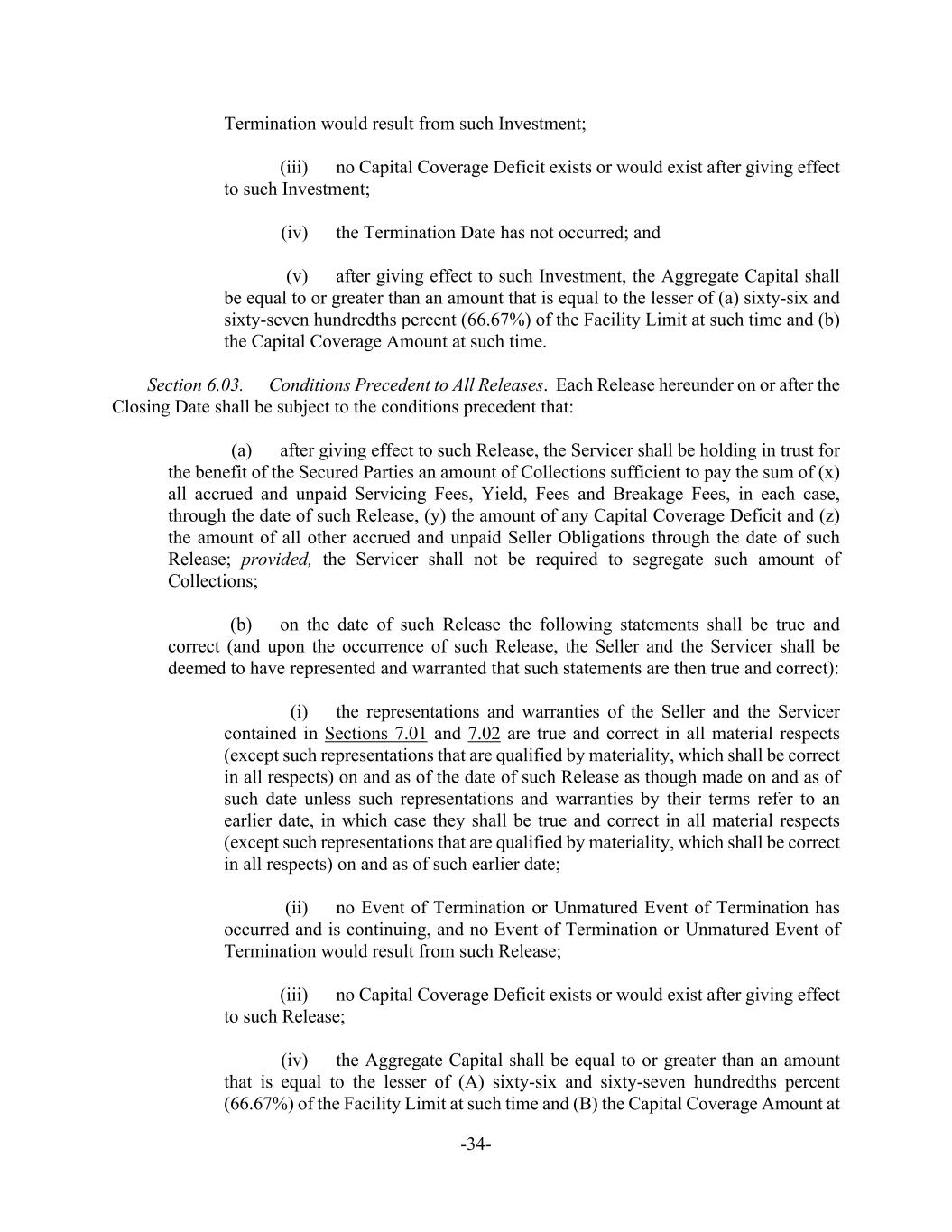 -34- Termination would result from such Investment; (iii) no Capital Coverage Deficit exists or would exist after giving effect to such Investment; (iv) the Termination Date has not occurred; and (v) after giving effect to such Investment, the Aggregate Capital shall be equal to or greater than an amount that is equal to the lesser of (a) sixty-six and sixty-seven hundredths percent (66.67%) of the Facility Limit at such time and (b) the Capital Coverage Amount at such time. Section 6.03. Conditions Precedent to All Releases. Each Release hereunder on or after the Closing Date shall be subject to the conditions precedent that: (a) after giving effect to such Release, the Servicer shall be holding in trust for the benefit of the Secured Parties an amount of Collections sufficient to pay the sum of (x) all accrued and unpaid Servicing Fees, Yield, Fees and Breakage Fees, in each case, through the date of such Release, (y) the amount of any Capital Coverage Deficit and (z) the amount of all other accrued and unpaid Seller Obligations through the date of such Release; provided, the Servicer shall not be required to segregate such amount of Collections; (b) on the date of such Release the following statements shall be true and correct (and upon the occurrence of such Release, the Seller and the Servicer shall be deemed to have represented and warranted that such statements are then true and correct): (i) the representations and warranties of the Seller and the Servicer contained in Sections 7.01 and 7.02 are true and correct in all material respects (except such representations that are qualified by materiality, which shall be correct in all respects) on and as of the date of such Release as though made on and as of such date unless such representations and warranties by their terms refer to an earlier date, in which case they shall be true and correct in all material respects (except such representations that are qualified by materiality, which shall be correct in all respects) on and as of such earlier date; (ii) no Event of Termination or Unmatured Event of Termination has occurred and is continuing, and no Event of Termination or Unmatured Event of Termination would result from such Release; (iii) no Capital Coverage Deficit exists or would exist after giving effect to such Release; (iv) the Aggregate Capital shall be equal to or greater than an amount that is equal to the lesser of (A) sixty-six and sixty-seven hundredths percent (66.67%) of the Facility Limit at such time and (B) the Capital Coverage Amount at