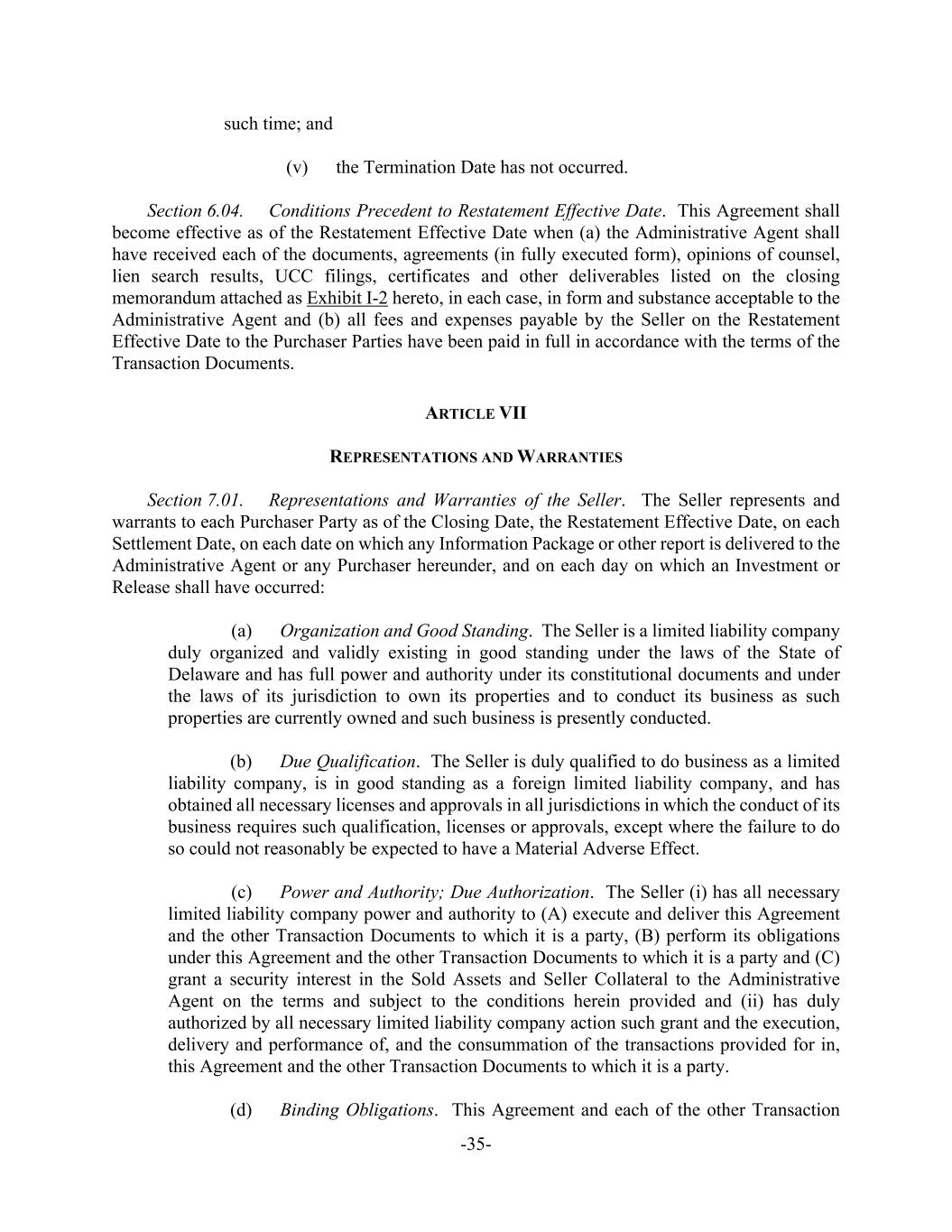 -35- such time; and (v) the Termination Date has not occurred. Section 6.04. Conditions Precedent to Restatement Effective Date. This Agreement shall become effective as of the Restatement Effective Date when (a) the Administrative Agent shall have received each of the documents, agreements (in fully executed form), opinions of counsel, lien search results, UCC filings, certificates and other deliverables listed on the closing memorandum attached as Exhibit I-2 hereto, in each case, in form and substance acceptable to the Administrative Agent and (b) all fees and expenses payable by the Seller on the Restatement Effective Date to the Purchaser Parties have been paid in full in accordance with the terms of the Transaction Documents. ARTICLE VII REPRESENTATIONS AND WARRANTIES Section 7.01. Representations and Warranties of the Seller. The Seller represents and warrants to each Purchaser Party as of the Closing Date, the Restatement Effective Date, on each Settlement Date, on each date on which any Information Package or other report is delivered to the Administrative Agent or any Purchaser hereunder, and on each day on which an Investment or Release shall have occurred: (a) Organization and Good Standing. The Seller is a limited liability company duly organized and validly existing in good standing under the laws of the State of Delaware and has full power and authority under its constitutional documents and under the laws of its jurisdiction to own its properties and to conduct its business as such properties are currently owned and such business is presently conducted. (b) Due Qualification. The Seller is duly qualified to do business as a limited liability company, is in good standing as a foreign limited liability company, and has obtained all necessary licenses and approvals in all jurisdictions in which the conduct of its business requires such qualification, licenses or approvals, except where the failure to do so could not reasonably be expected to have a Material Adverse Effect. (c) Power and Authority; Due Authorization. The Seller (i) has all necessary limited liability company power and authority to (A) execute and deliver this Agreement and the other Transaction Documents to which it is a party, (B) perform its obligations under this Agreement and the other Transaction Documents to which it is a party and (C) grant a security interest in the Sold Assets and Seller Collateral to the Administrative Agent on the terms and subject to the conditions herein provided and (ii) has duly authorized by all necessary limited liability company action such grant and the execution, delivery and performance of, and the consummation of the transactions provided for in, this Agreement and the other Transaction Documents to which it is a party. (d) Binding Obligations. This Agreement and each of the other Transaction