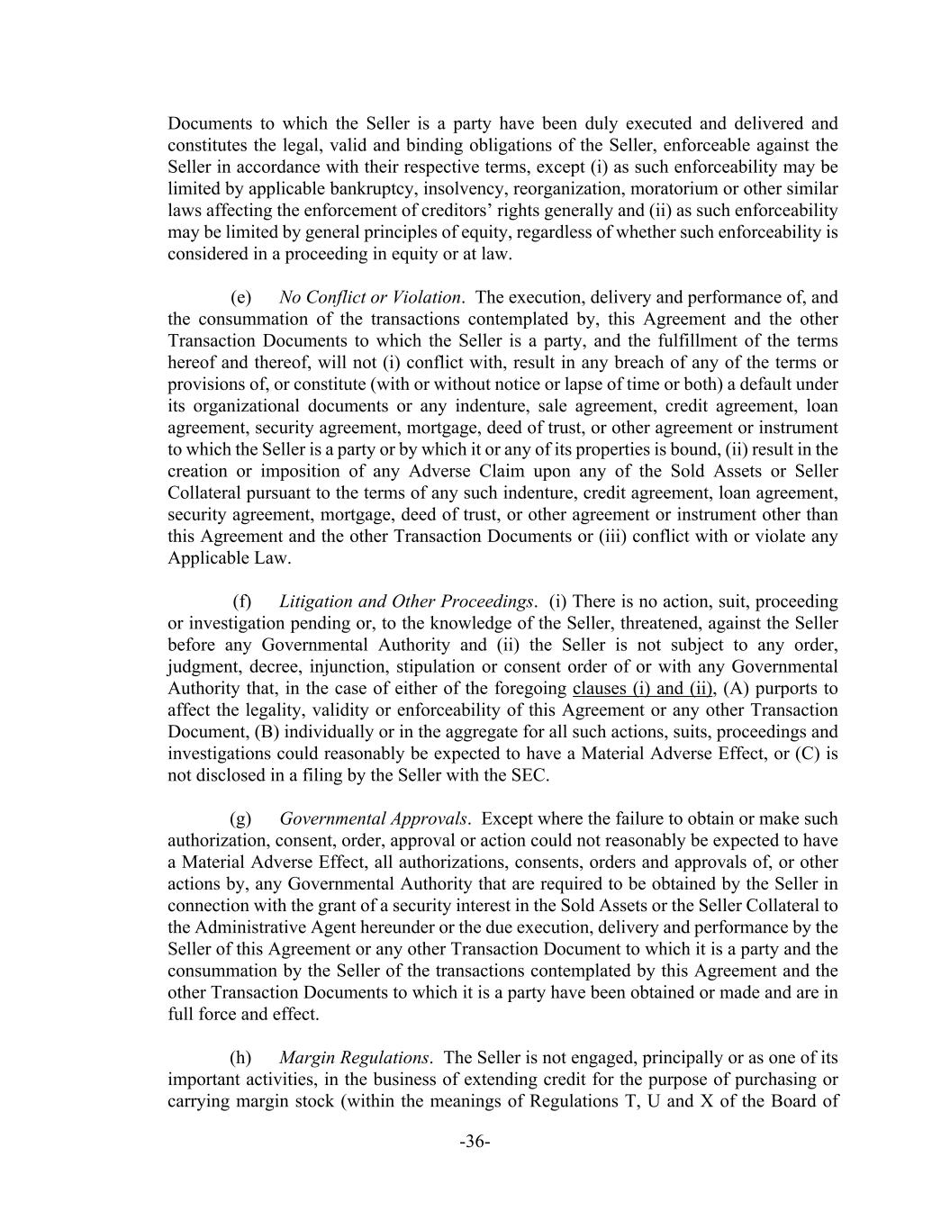 -36- Documents to which the Seller is a party have been duly executed and delivered and constitutes the legal, valid and binding obligations of the Seller, enforceable against the Seller in accordance with their respective terms, except (i) as such enforceability may be limited by applicable bankruptcy, insolvency, reorganization, moratorium or other similar laws affecting the enforcement of creditors’ rights generally and (ii) as such enforceability may be limited by general principles of equity, regardless of whether such enforceability is considered in a proceeding in equity or at law. (e) No Conflict or Violation. The execution, delivery and performance of, and the consummation of the transactions contemplated by, this Agreement and the other Transaction Documents to which the Seller is a party, and the fulfillment of the terms hereof and thereof, will not (i) conflict with, result in any breach of any of the terms or provisions of, or constitute (with or without notice or lapse of time or both) a default under its organizational documents or any indenture, sale agreement, credit agreement, loan agreement, security agreement, mortgage, deed of trust, or other agreement or instrument to which the Seller is a party or by which it or any of its properties is bound, (ii) result in the creation or imposition of any Adverse Claim upon any of the Sold Assets or Seller Collateral pursuant to the terms of any such indenture, credit agreement, loan agreement, security agreement, mortgage, deed of trust, or other agreement or instrument other than this Agreement and the other Transaction Documents or (iii) conflict with or violate any Applicable Law. (f) Litigation and Other Proceedings. (i) There is no action, suit, proceeding or investigation pending or, to the knowledge of the Seller, threatened, against the Seller before any Governmental Authority and (ii) the Seller is not subject to any order, judgment, decree, injunction, stipulation or consent order of or with any Governmental Authority that, in the case of either of the foregoing clauses (i) and (ii), (A) purports to affect the legality, validity or enforceability of this Agreement or any other Transaction Document, (B) individually or in the aggregate for all such actions, suits, proceedings and investigations could reasonably be expected to have a Material Adverse Effect, or (C) is not disclosed in a filing by the Seller with the SEC. (g) Governmental Approvals. Except where the failure to obtain or make such authorization, consent, order, approval or action could not reasonably be expected to have a Material Adverse Effect, all authorizations, consents, orders and approvals of, or other actions by, any Governmental Authority that are required to be obtained by the Seller in connection with the grant of a security interest in the Sold Assets or the Seller Collateral to the Administrative Agent hereunder or the due execution, delivery and performance by the Seller of this Agreement or any other Transaction Document to which it is a party and the consummation by the Seller of the transactions contemplated by this Agreement and the other Transaction Documents to which it is a party have been obtained or made and are in full force and effect. (h) Margin Regulations. The Seller is not engaged, principally or as one of its important activities, in the business of extending credit for the purpose of purchasing or carrying margin stock (within the meanings of Regulations T, U and X of the Board of