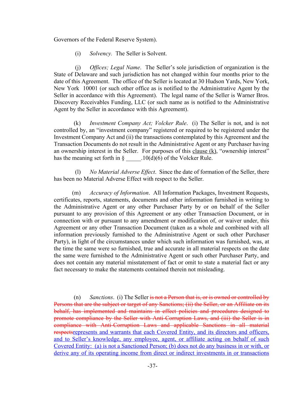 -37- Governors of the Federal Reserve System). (i) Solvency. The Seller is Solvent. (j) Offices; Legal Name. The Seller’s sole jurisdiction of organization is the State of Delaware and such jurisdiction has not changed within four months prior to the date of this Agreement. The office of the Seller is located at 30 Hudson Yards, New York, New York 10001 (or such other office as is notified to the Administrative Agent by the Seller in accordance with this Agreement). The legal name of the Seller is Warner Bros. Discovery Receivables Funding, LLC (or such name as is notified to the Administrative Agent by the Seller in accordance with this Agreement). (k) Investment Company Act; Volcker Rule. (i) The Seller is not, and is not controlled by, an “investment company” registered or required to be registered under the Investment Company Act and (ii) the transactions contemplated by this Agreement and the Transaction Documents do not result in the Administrative Agent or any Purchaser having an ownership interest in the Seller. For purposes of this clause (k), “ownership interest” has the meaning set forth in § _____.10(d)(6) of the Volcker Rule. (l) No Material Adverse Effect. Since the date of formation of the Seller, there has been no Material Adverse Effect with respect to the Seller. (m) Accuracy of Information. All Information Packages, Investment Requests, certificates, reports, statements, documents and other information furnished in writing to the Administrative Agent or any other Purchaser Party by or on behalf of the Seller pursuant to any provision of this Agreement or any other Transaction Document, or in connection with or pursuant to any amendment or modification of, or waiver under, this Agreement or any other Transaction Document (taken as a whole and combined with all information previously furnished to the Administrative Agent or such other Purchaser Party), in light of the circumstances under which such information was furnished, was, at the time the same were so furnished, true and accurate in all material respects on the date the same were furnished to the Administrative Agent or such other Purchaser Party, and does not contain any material misstatement of fact or omit to state a material fact or any fact necessary to make the statements contained therein not misleading. (n) Sanctions. (i) The Seller is not a Person that is, or is owned or controlled by Persons that are the subject or target of any Sanctions; (ii) the Seller, or an Affiliate on its behalf, has implemented and maintains in effect policies and procedures designed to promote compliance by the Seller with Anti-Corruption Laws, and (iii) the Seller is in compliance with Anti-Corruption Laws and applicable Sanctions in all material respectsrepresents and warrants that each Covered Entity, and its directors and officers, and to Seller’s knowledge, any employee, agent, or affiliate acting on behalf of such Covered Entity: (a) is not a Sanctioned Person; (b) does not do any business in or with, or derive any of its operating income from direct or indirect investments in or transactions