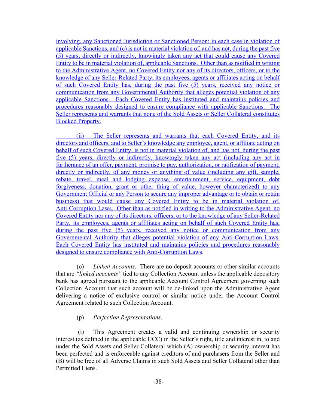 -38- involving, any Sanctioned Jurisdiction or Sanctioned Person; in each case in violation of applicable Sanctions, and (c) is not in material violation of, and has not, during the past five (5) years, directly or indirectly, knowingly taken any act that could cause any Covered Entity to be in material violation of, applicable Sanctions. Other than as notified in writing to the Administrative Agent, no Covered Entity nor any of its directors, officers, or to the knowledge of any Seller-Related Party, its employees, agents or affiliates acting on behalf of such Covered Entity has, during the past five (5) years, received any notice or communication from any Governmental Authority that alleges potential violation of any applicable Sanctions. Each Covered Entity has instituted and maintains policies and procedures reasonably designed to ensure compliance with applicable Sanctions. The Seller represents and warrants that none of the Sold Assets or Seller Collateral constitutes Blocked Property. (ii) The Seller represents and warrants that each Covered Entity, and its directors and officers, and to Seller’s knowledge any employee, agent, or affiliate acting on behalf of such Covered Entity, is not in material violation of, and has not, during the past five (5) years, directly or indirectly, knowingly taken any act (including any act in furtherance of an offer, payment, promise to pay, authorization, or ratification of payment, directly or indirectly, of any money or anything of value (including any gift, sample, rebate, travel, meal and lodging expense, entertainment, service, equipment, debt forgiveness, donation, grant or other thing of value, however characterized) to any Government Official or any Person to secure any improper advantage or to obtain or retain business) that would cause any Covered Entity to be in material violation of, Anti-Corruption Laws. Other than as notified in writing to the Administrative Agent, no Covered Entity nor any of its directors, officers, or to the knowledge of any Seller-Related Party, its employees, agents or affiliates acting on behalf of such Covered Entity has, during the past five (5) years, received any notice or communication from any Governmental Authority that alleges potential violation of any Anti-Corruption Laws. Each Covered Entity has instituted and maintains policies and procedures reasonably designed to ensure compliance with Anti-Corruption Laws. (o) Linked Accounts. There are no deposit accounts or other similar accounts that are “linked accounts” tied to any Collection Account unless the applicable depository bank has agreed pursuant to the applicable Account Control Agreement governing such Collection Account that such account will be de-linked upon the Administrative Agent delivering a notice of exclusive control or similar notice under the Account Control Agreement related to such Collection Account. (p) Perfection Representations. (i) This Agreement creates a valid and continuing ownership or security interest (as defined in the applicable UCC) in the Seller’s right, title and interest in, to and under the Sold Assets and Seller Collateral which (A) ownership or security interest has been perfected and is enforceable against creditors of and purchasers from the Seller and (B) will be free of all Adverse Claims in such Sold Assets and Seller Collateral other than Permitted Liens.