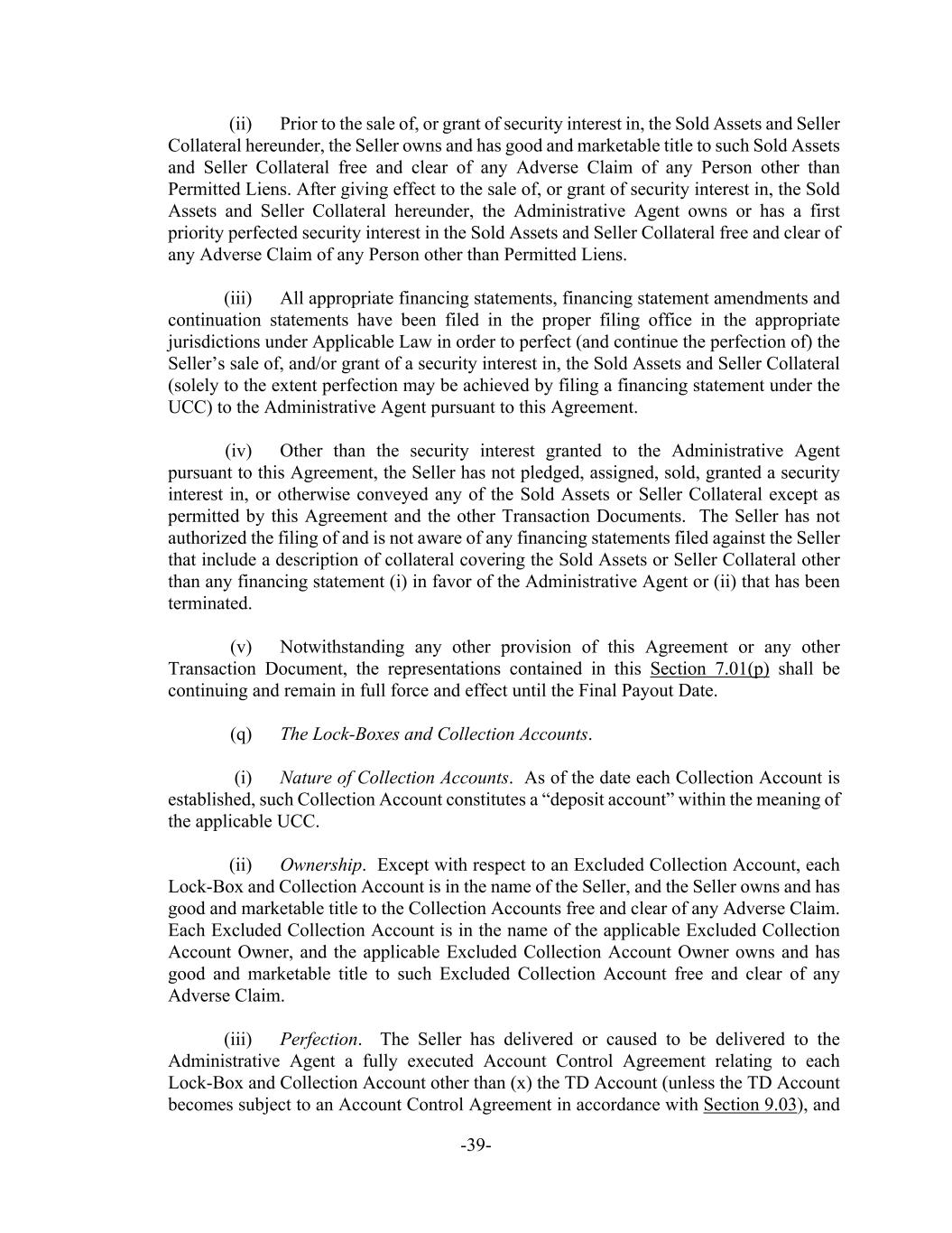 -39- (ii) Prior to the sale of, or grant of security interest in, the Sold Assets and Seller Collateral hereunder, the Seller owns and has good and marketable title to such Sold Assets and Seller Collateral free and clear of any Adverse Claim of any Person other than Permitted Liens. After giving effect to the sale of, or grant of security interest in, the Sold Assets and Seller Collateral hereunder, the Administrative Agent owns or has a first priority perfected security interest in the Sold Assets and Seller Collateral free and clear of any Adverse Claim of any Person other than Permitted Liens. (iii) All appropriate financing statements, financing statement amendments and continuation statements have been filed in the proper filing office in the appropriate jurisdictions under Applicable Law in order to perfect (and continue the perfection of) the Seller’s sale of, and/or grant of a security interest in, the Sold Assets and Seller Collateral (solely to the extent perfection may be achieved by filing a financing statement under the UCC) to the Administrative Agent pursuant to this Agreement. (iv) Other than the security interest granted to the Administrative Agent pursuant to this Agreement, the Seller has not pledged, assigned, sold, granted a security interest in, or otherwise conveyed any of the Sold Assets or Seller Collateral except as permitted by this Agreement and the other Transaction Documents. The Seller has not authorized the filing of and is not aware of any financing statements filed against the Seller that include a description of collateral covering the Sold Assets or Seller Collateral other than any financing statement (i) in favor of the Administrative Agent or (ii) that has been terminated. (v) Notwithstanding any other provision of this Agreement or any other Transaction Document, the representations contained in this Section 7.01(p) shall be continuing and remain in full force and effect until the Final Payout Date. (q) The Lock-Boxes and Collection Accounts. (i) Nature of Collection Accounts. As of the date each Collection Account is established, such Collection Account constitutes a “deposit account” within the meaning of the applicable UCC. (ii) Ownership. Except with respect to an Excluded Collection Account, each Lock-Box and Collection Account is in the name of the Seller, and the Seller owns and has good and marketable title to the Collection Accounts free and clear of any Adverse Claim. Each Excluded Collection Account is in the name of the applicable Excluded Collection Account Owner, and the applicable Excluded Collection Account Owner owns and has good and marketable title to such Excluded Collection Account free and clear of any Adverse Claim. (iii) Perfection. The Seller has delivered or caused to be delivered to the Administrative Agent a fully executed Account Control Agreement relating to each Lock-Box and Collection Account other than (x) the TD Account (unless the TD Account becomes subject to an Account Control Agreement in accordance with Section 9.03), and