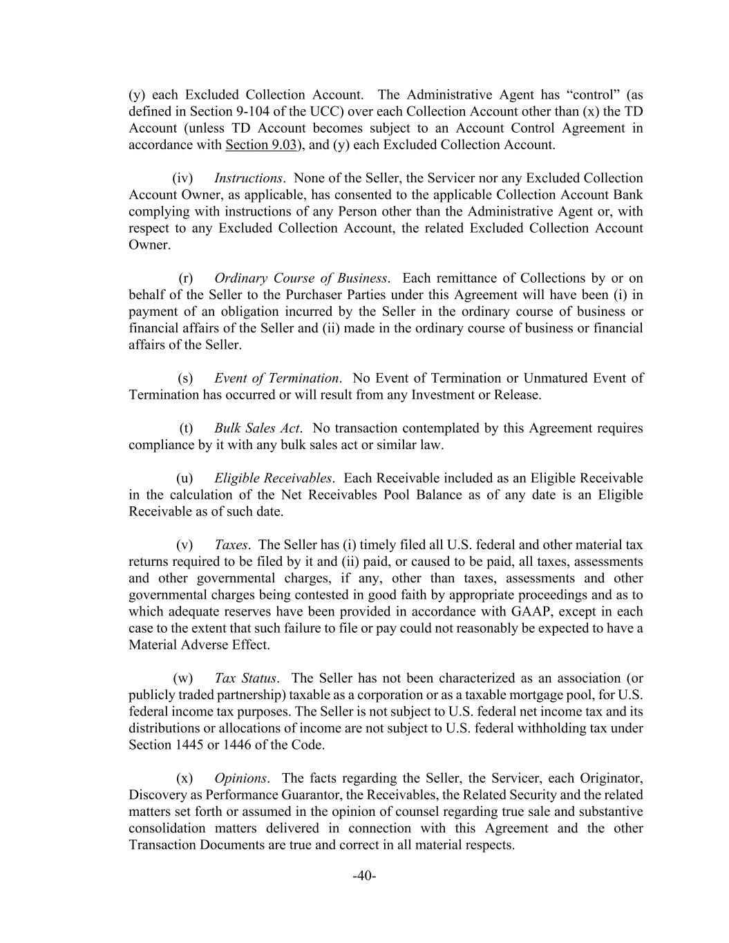 -40- (y) each Excluded Collection Account. The Administrative Agent has “control” (as defined in Section 9-104 of the UCC) over each Collection Account other than (x) the TD Account (unless TD Account becomes subject to an Account Control Agreement in accordance with Section 9.03), and (y) each Excluded Collection Account. (iv) Instructions. None of the Seller, the Servicer nor any Excluded Collection Account Owner, as applicable, has consented to the applicable Collection Account Bank complying with instructions of any Person other than the Administrative Agent or, with respect to any Excluded Collection Account, the related Excluded Collection Account Owner. (r) Ordinary Course of Business. Each remittance of Collections by or on behalf of the Seller to the Purchaser Parties under this Agreement will have been (i) in payment of an obligation incurred by the Seller in the ordinary course of business or financial affairs of the Seller and (ii) made in the ordinary course of business or financial affairs of the Seller. (s) Event of Termination. No Event of Termination or Unmatured Event of Termination has occurred or will result from any Investment or Release. (t) Bulk Sales Act. No transaction contemplated by this Agreement requires compliance by it with any bulk sales act or similar law. (u) Eligible Receivables. Each Receivable included as an Eligible Receivable in the calculation of the Net Receivables Pool Balance as of any date is an Eligible Receivable as of such date. (v) Taxes. The Seller has (i) timely filed all U.S. federal and other material tax returns required to be filed by it and (ii) paid, or caused to be paid, all taxes, assessments and other governmental charges, if any, other than taxes, assessments and other governmental charges being contested in good faith by appropriate proceedings and as to which adequate reserves have been provided in accordance with GAAP, except in each case to the extent that such failure to file or pay could not reasonably be expected to have a Material Adverse Effect. (w) Tax Status. The Seller has not been characterized as an association (or publicly traded partnership) taxable as a corporation or as a taxable mortgage pool, for U.S. federal income tax purposes. The Seller is not subject to U.S. federal net income tax and its distributions or allocations of income are not subject to U.S. federal withholding tax under Section 1445 or 1446 of the Code. (x) Opinions. The facts regarding the Seller, the Servicer, each Originator, Discovery as Performance Guarantor, the Receivables, the Related Security and the related matters set forth or assumed in the opinion of counsel regarding true sale and substantive consolidation matters delivered in connection with this Agreement and the other Transaction Documents are true and correct in all material respects.