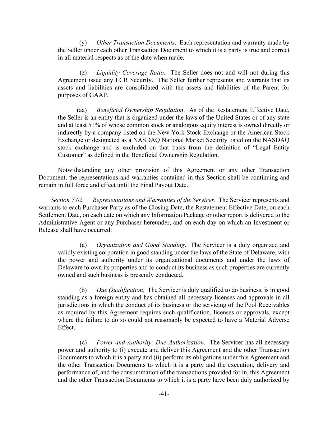 -41- (y) Other Transaction Documents. Each representation and warranty made by the Seller under each other Transaction Document to which it is a party is true and correct in all material respects as of the date when made. (z) Liquidity Coverage Ratio. The Seller does not and will not during this Agreement issue any LCR Security. The Seller further represents and warrants that its assets and liabilities are consolidated with the assets and liabilities of the Parent for purposes of GAAP. (aa) Beneficial Ownership Regulation. As of the Restatement Effective Date, the Seller is an entity that is organized under the laws of the United States or of any state and at least 51% of whose common stock or analogous equity interest is owned directly or indirectly by a company listed on the New York Stock Exchange or the American Stock Exchange or designated as a NASDAQ National Market Security listed on the NASDAQ stock exchange and is excluded on that basis from the definition of “Legal Entity Customer” as defined in the Beneficial Ownership Regulation. Notwithstanding any other provision of this Agreement or any other Transaction Document, the representations and warranties contained in this Section shall be continuing and remain in full force and effect until the Final Payout Date. Section 7.02. Representations and Warranties of the Servicer. The Servicer represents and warrants to each Purchaser Party as of the Closing Date, the Restatement Effective Date, on each Settlement Date, on each date on which any Information Package or other report is delivered to the Administrative Agent or any Purchaser hereunder, and on each day on which an Investment or Release shall have occurred: (a) Organization and Good Standing. The Servicer is a duly organized and validly existing corporation in good standing under the laws of the State of Delaware, with the power and authority under its organizational documents and under the laws of Delaware to own its properties and to conduct its business as such properties are currently owned and such business is presently conducted. (b) Due Qualification. The Servicer is duly qualified to do business, is in good standing as a foreign entity and has obtained all necessary licenses and approvals in all jurisdictions in which the conduct of its business or the servicing of the Pool Receivables as required by this Agreement requires such qualification, licenses or approvals, except where the failure to do so could not reasonably be expected to have a Material Adverse Effect. (c) Power and Authority; Due Authorization. The Servicer has all necessary power and authority to (i) execute and deliver this Agreement and the other Transaction Documents to which it is a party and (ii) perform its obligations under this Agreement and the other Transaction Documents to which it is a party and the execution, delivery and performance of, and the consummation of the transactions provided for in, this Agreement and the other Transaction Documents to which it is a party have been duly authorized by
