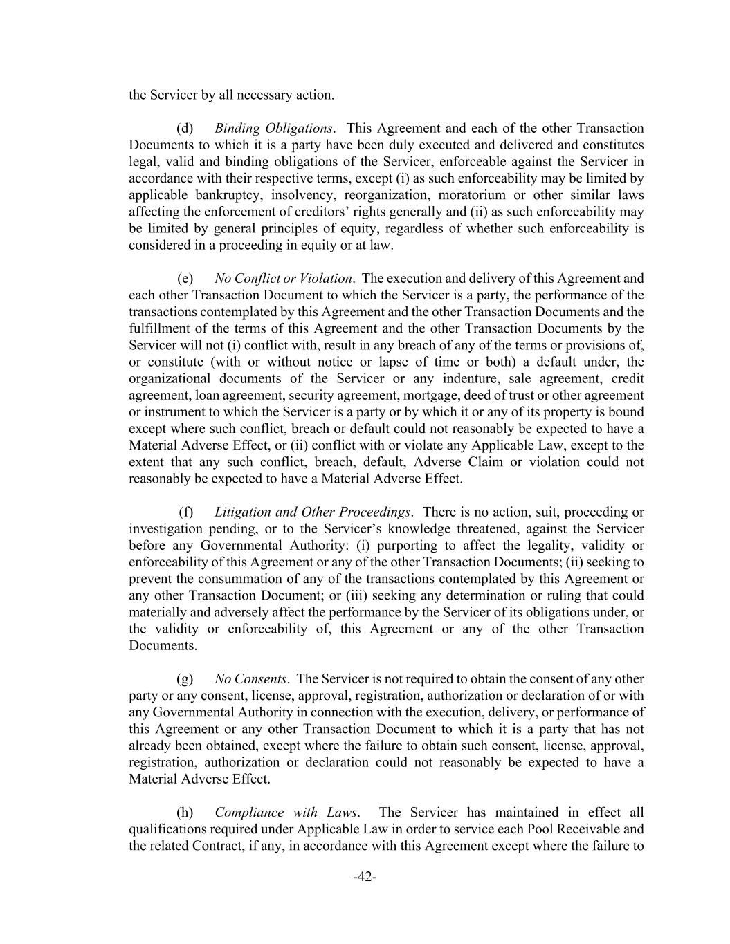-42- the Servicer by all necessary action. (d) Binding Obligations. This Agreement and each of the other Transaction Documents to which it is a party have been duly executed and delivered and constitutes legal, valid and binding obligations of the Servicer, enforceable against the Servicer in accordance with their respective terms, except (i) as such enforceability may be limited by applicable bankruptcy, insolvency, reorganization, moratorium or other similar laws affecting the enforcement of creditors’ rights generally and (ii) as such enforceability may be limited by general principles of equity, regardless of whether such enforceability is considered in a proceeding in equity or at law. (e) No Conflict or Violation. The execution and delivery of this Agreement and each other Transaction Document to which the Servicer is a party, the performance of the transactions contemplated by this Agreement and the other Transaction Documents and the fulfillment of the terms of this Agreement and the other Transaction Documents by the Servicer will not (i) conflict with, result in any breach of any of the terms or provisions of, or constitute (with or without notice or lapse of time or both) a default under, the organizational documents of the Servicer or any indenture, sale agreement, credit agreement, loan agreement, security agreement, mortgage, deed of trust or other agreement or instrument to which the Servicer is a party or by which it or any of its property is bound except where such conflict, breach or default could not reasonably be expected to have a Material Adverse Effect, or (ii) conflict with or violate any Applicable Law, except to the extent that any such conflict, breach, default, Adverse Claim or violation could not reasonably be expected to have a Material Adverse Effect. (f) Litigation and Other Proceedings. There is no action, suit, proceeding or investigation pending, or to the Servicer’s knowledge threatened, against the Servicer before any Governmental Authority: (i) purporting to affect the legality, validity or enforceability of this Agreement or any of the other Transaction Documents; (ii) seeking to prevent the consummation of any of the transactions contemplated by this Agreement or any other Transaction Document; or (iii) seeking any determination or ruling that could materially and adversely affect the performance by the Servicer of its obligations under, or the validity or enforceability of, this Agreement or any of the other Transaction Documents. (g) No Consents. The Servicer is not required to obtain the consent of any other party or any consent, license, approval, registration, authorization or declaration of or with any Governmental Authority in connection with the execution, delivery, or performance of this Agreement or any other Transaction Document to which it is a party that has not already been obtained, except where the failure to obtain such consent, license, approval, registration, authorization or declaration could not reasonably be expected to have a Material Adverse Effect. (h) Compliance with Laws. The Servicer has maintained in effect all qualifications required under Applicable Law in order to service each Pool Receivable and the related Contract, if any, in accordance with this Agreement except where the failure to