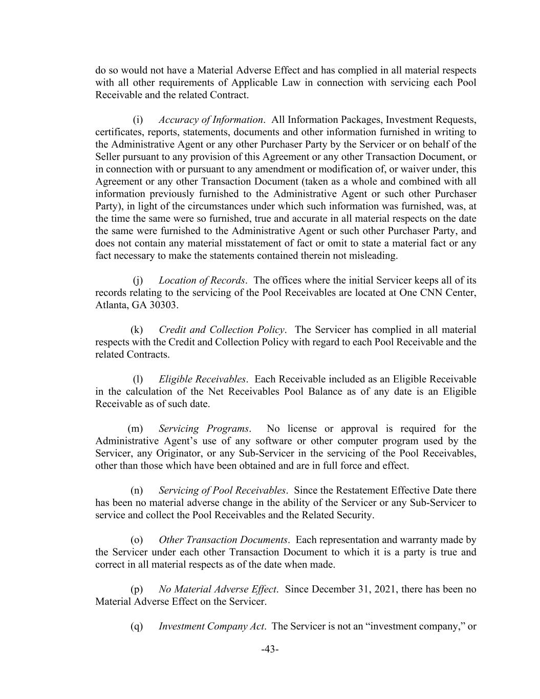 -43- do so would not have a Material Adverse Effect and has complied in all material respects with all other requirements of Applicable Law in connection with servicing each Pool Receivable and the related Contract. (i) Accuracy of Information. All Information Packages, Investment Requests, certificates, reports, statements, documents and other information furnished in writing to the Administrative Agent or any other Purchaser Party by the Servicer or on behalf of the Seller pursuant to any provision of this Agreement or any other Transaction Document, or in connection with or pursuant to any amendment or modification of, or waiver under, this Agreement or any other Transaction Document (taken as a whole and combined with all information previously furnished to the Administrative Agent or such other Purchaser Party), in light of the circumstances under which such information was furnished, was, at the time the same were so furnished, true and accurate in all material respects on the date the same were furnished to the Administrative Agent or such other Purchaser Party, and does not contain any material misstatement of fact or omit to state a material fact or any fact necessary to make the statements contained therein not misleading. (j) Location of Records. The offices where the initial Servicer keeps all of its records relating to the servicing of the Pool Receivables are located at One CNN Center, Atlanta, GA 30303. (k) Credit and Collection Policy. The Servicer has complied in all material respects with the Credit and Collection Policy with regard to each Pool Receivable and the related Contracts. (l) Eligible Receivables. Each Receivable included as an Eligible Receivable in the calculation of the Net Receivables Pool Balance as of any date is an Eligible Receivable as of such date. (m) Servicing Programs. No license or approval is required for the Administrative Agent’s use of any software or other computer program used by the Servicer, any Originator, or any Sub-Servicer in the servicing of the Pool Receivables, other than those which have been obtained and are in full force and effect. (n) Servicing of Pool Receivables. Since the Restatement Effective Date there has been no material adverse change in the ability of the Servicer or any Sub-Servicer to service and collect the Pool Receivables and the Related Security. (o) Other Transaction Documents. Each representation and warranty made by the Servicer under each other Transaction Document to which it is a party is true and correct in all material respects as of the date when made. (p) No Material Adverse Effect. Since December 31, 2021, there has been no Material Adverse Effect on the Servicer. (q) Investment Company Act. The Servicer is not an “investment company,” or