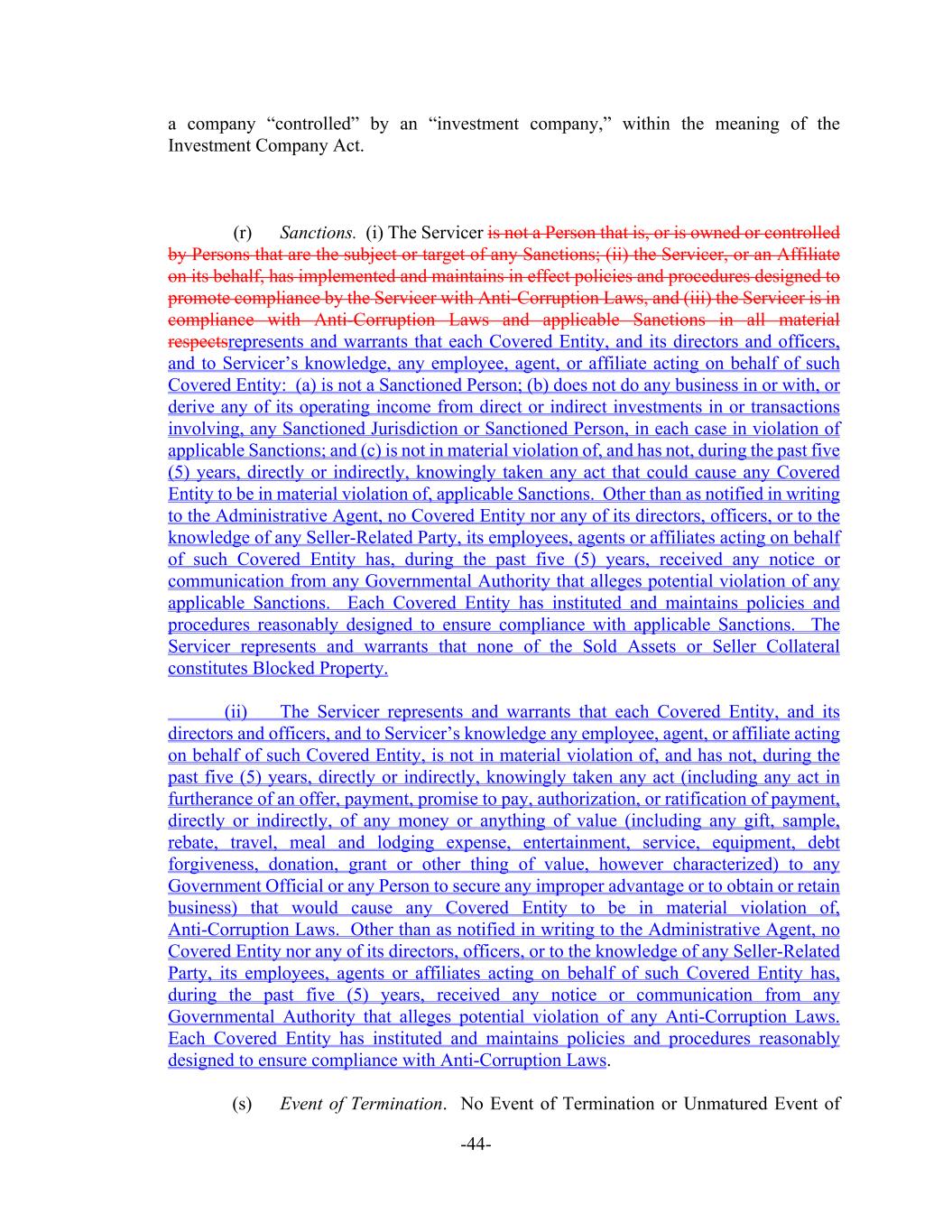 -44- a company “controlled” by an “investment company,” within the meaning of the Investment Company Act. (r) Sanctions. (i) The Servicer is not a Person that is, or is owned or controlled by Persons that are the subject or target of any Sanctions; (ii) the Servicer, or an Affiliate on its behalf, has implemented and maintains in effect policies and procedures designed to promote compliance by the Servicer with Anti-Corruption Laws, and (iii) the Servicer is in compliance with Anti-Corruption Laws and applicable Sanctions in all material respectsrepresents and warrants that each Covered Entity, and its directors and officers, and to Servicer’s knowledge, any employee, agent, or affiliate acting on behalf of such Covered Entity: (a) is not a Sanctioned Person; (b) does not do any business in or with, or derive any of its operating income from direct or indirect investments in or transactions involving, any Sanctioned Jurisdiction or Sanctioned Person, in each case in violation of applicable Sanctions; and (c) is not in material violation of, and has not, during the past five (5) years, directly or indirectly, knowingly taken any act that could cause any Covered Entity to be in material violation of, applicable Sanctions. Other than as notified in writing to the Administrative Agent, no Covered Entity nor any of its directors, officers, or to the knowledge of any Seller-Related Party, its employees, agents or affiliates acting on behalf of such Covered Entity has, during the past five (5) years, received any notice or communication from any Governmental Authority that alleges potential violation of any applicable Sanctions. Each Covered Entity has instituted and maintains policies and procedures reasonably designed to ensure compliance with applicable Sanctions. The Servicer represents and warrants that none of the Sold Assets or Seller Collateral constitutes Blocked Property. (ii) The Servicer represents and warrants that each Covered Entity, and its directors and officers, and to Servicer’s knowledge any employee, agent, or affiliate acting on behalf of such Covered Entity, is not in material violation of, and has not, during the past five (5) years, directly or indirectly, knowingly taken any act (including any act in furtherance of an offer, payment, promise to pay, authorization, or ratification of payment, directly or indirectly, of any money or anything of value (including any gift, sample, rebate, travel, meal and lodging expense, entertainment, service, equipment, debt forgiveness, donation, grant or other thing of value, however characterized) to any Government Official or any Person to secure any improper advantage or to obtain or retain business) that would cause any Covered Entity to be in material violation of, Anti-Corruption Laws. Other than as notified in writing to the Administrative Agent, no Covered Entity nor any of its directors, officers, or to the knowledge of any Seller-Related Party, its employees, agents or affiliates acting on behalf of such Covered Entity has, during the past five (5) years, received any notice or communication from any Governmental Authority that alleges potential violation of any Anti-Corruption Laws. Each Covered Entity has instituted and maintains policies and procedures reasonably designed to ensure compliance with Anti-Corruption Laws. (s) Event of Termination. No Event of Termination or Unmatured Event of