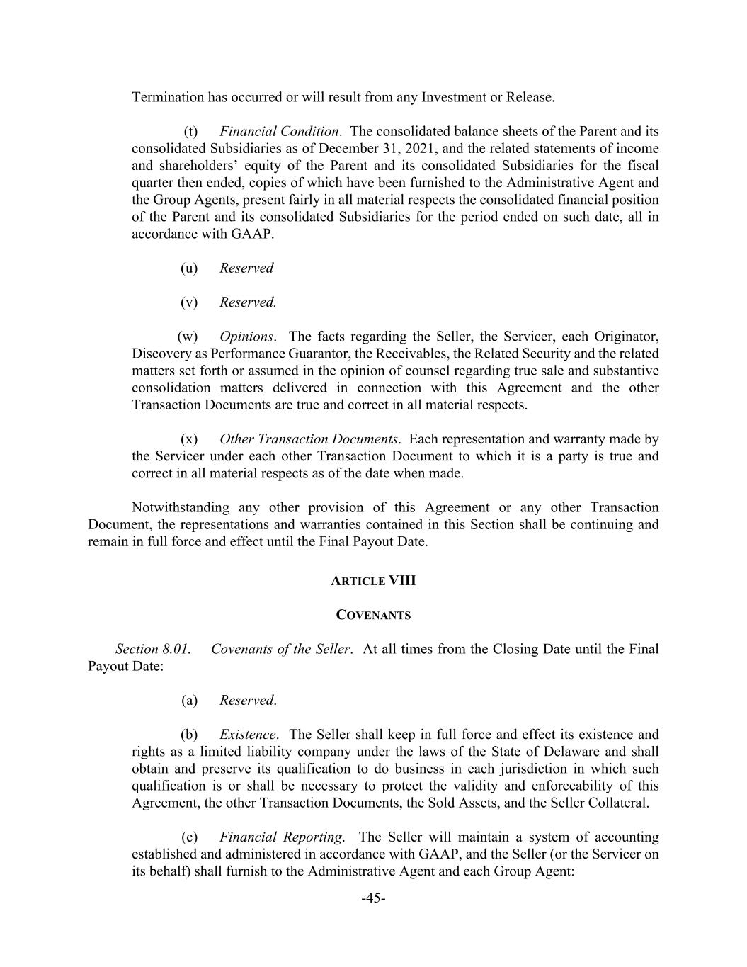 -45- Termination has occurred or will result from any Investment or Release. (t) Financial Condition. The consolidated balance sheets of the Parent and its consolidated Subsidiaries as of December 31, 2021, and the related statements of income and shareholders’ equity of the Parent and its consolidated Subsidiaries for the fiscal quarter then ended, copies of which have been furnished to the Administrative Agent and the Group Agents, present fairly in all material respects the consolidated financial position of the Parent and its consolidated Subsidiaries for the period ended on such date, all in accordance with GAAP. (u) Reserved (v) Reserved. (w) Opinions. The facts regarding the Seller, the Servicer, each Originator, Discovery as Performance Guarantor, the Receivables, the Related Security and the related matters set forth or assumed in the opinion of counsel regarding true sale and substantive consolidation matters delivered in connection with this Agreement and the other Transaction Documents are true and correct in all material respects. (x) Other Transaction Documents. Each representation and warranty made by the Servicer under each other Transaction Document to which it is a party is true and correct in all material respects as of the date when made. Notwithstanding any other provision of this Agreement or any other Transaction Document, the representations and warranties contained in this Section shall be continuing and remain in full force and effect until the Final Payout Date. ARTICLE VIII COVENANTS Section 8.01. Covenants of the Seller. At all times from the Closing Date until the Final Payout Date: (a) Reserved. (b) Existence. The Seller shall keep in full force and effect its existence and rights as a limited liability company under the laws of the State of Delaware and shall obtain and preserve its qualification to do business in each jurisdiction in which such qualification is or shall be necessary to protect the validity and enforceability of this Agreement, the other Transaction Documents, the Sold Assets, and the Seller Collateral. (c) Financial Reporting. The Seller will maintain a system of accounting established and administered in accordance with GAAP, and the Seller (or the Servicer on its behalf) shall furnish to the Administrative Agent and each Group Agent: