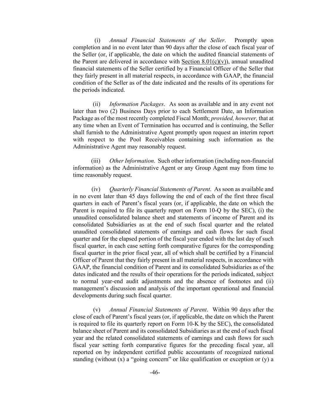 -46- (i) Annual Financial Statements of the Seller. Promptly upon completion and in no event later than 90 days after the close of each fiscal year of the Seller (or, if applicable, the date on which the audited financial statements of the Parent are delivered in accordance with Section 8.01(c)(v)), annual unaudited financial statements of the Seller certified by a Financial Officer of the Seller that they fairly present in all material respects, in accordance with GAAP, the financial condition of the Seller as of the date indicated and the results of its operations for the periods indicated. (ii) Information Packages. As soon as available and in any event not later than two (2) Business Days prior to each Settlement Date, an Information Package as of the most recently completed Fiscal Month; provided, however, that at any time when an Event of Termination has occurred and is continuing, the Seller shall furnish to the Administrative Agent promptly upon request an interim report with respect to the Pool Receivables containing such information as the Administrative Agent may reasonably request. (iii) Other Information. Such other information (including non-financial information) as the Administrative Agent or any Group Agent may from time to time reasonably request. (iv) Quarterly Financial Statements of Parent. As soon as available and in no event later than 45 days following the end of each of the first three fiscal quarters in each of Parent’s fiscal years (or, if applicable, the date on which the Parent is required to file its quarterly report on Form 10-Q by the SEC), (i) the unaudited consolidated balance sheet and statements of income of Parent and its consolidated Subsidiaries as at the end of such fiscal quarter and the related unaudited consolidated statements of earnings and cash flows for such fiscal quarter and for the elapsed portion of the fiscal year ended with the last day of such fiscal quarter, in each case setting forth comparative figures for the corresponding fiscal quarter in the prior fiscal year, all of which shall be certified by a Financial Officer of Parent that they fairly present in all material respects, in accordance with GAAP, the financial condition of Parent and its consolidated Subsidiaries as of the dates indicated and the results of their operations for the periods indicated, subject to normal year-end audit adjustments and the absence of footnotes and (ii) management’s discussion and analysis of the important operational and financial developments during such fiscal quarter. (v) Annual Financial Statements of Parent. Within 90 days after the close of each of Parent’s fiscal years (or, if applicable, the date on which the Parent is required to file its quarterly report on Form 10-K by the SEC), the consolidated balance sheet of Parent and its consolidated Subsidiaries as at the end of such fiscal year and the related consolidated statements of earnings and cash flows for such fiscal year setting forth comparative figures for the preceding fiscal year, all reported on by independent certified public accountants of recognized national standing (without (x) a “going concern” or like qualification or exception or (y) a