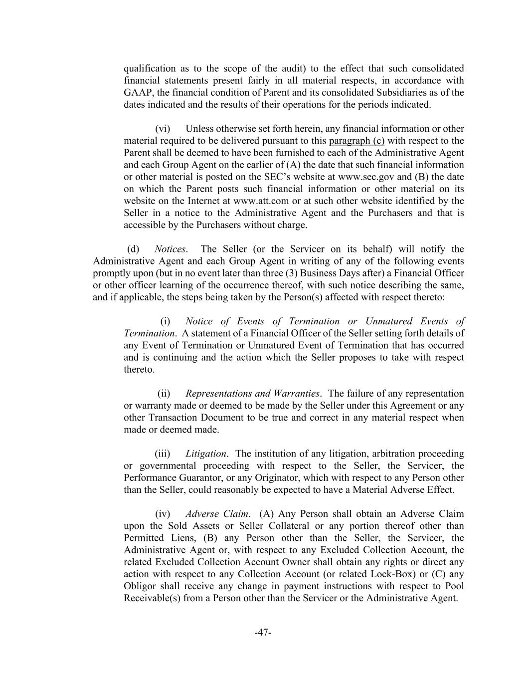 -47- qualification as to the scope of the audit) to the effect that such consolidated financial statements present fairly in all material respects, in accordance with GAAP, the financial condition of Parent and its consolidated Subsidiaries as of the dates indicated and the results of their operations for the periods indicated. (vi) Unless otherwise set forth herein, any financial information or other material required to be delivered pursuant to this paragraph (c) with respect to the Parent shall be deemed to have been furnished to each of the Administrative Agent and each Group Agent on the earlier of (A) the date that such financial information or other material is posted on the SEC’s website at www.sec.gov and (B) the date on which the Parent posts such financial information or other material on its website on the Internet at www.att.com or at such other website identified by the Seller in a notice to the Administrative Agent and the Purchasers and that is accessible by the Purchasers without charge. (d) Notices. The Seller (or the Servicer on its behalf) will notify the Administrative Agent and each Group Agent in writing of any of the following events promptly upon (but in no event later than three (3) Business Days after) a Financial Officer or other officer learning of the occurrence thereof, with such notice describing the same, and if applicable, the steps being taken by the Person(s) affected with respect thereto: (i) Notice of Events of Termination or Unmatured Events of Termination. A statement of a Financial Officer of the Seller setting forth details of any Event of Termination or Unmatured Event of Termination that has occurred and is continuing and the action which the Seller proposes to take with respect thereto. (ii) Representations and Warranties. The failure of any representation or warranty made or deemed to be made by the Seller under this Agreement or any other Transaction Document to be true and correct in any material respect when made or deemed made. (iii) Litigation. The institution of any litigation, arbitration proceeding or governmental proceeding with respect to the Seller, the Servicer, the Performance Guarantor, or any Originator, which with respect to any Person other than the Seller, could reasonably be expected to have a Material Adverse Effect. (iv) Adverse Claim. (A) Any Person shall obtain an Adverse Claim upon the Sold Assets or Seller Collateral or any portion thereof other than Permitted Liens, (B) any Person other than the Seller, the Servicer, the Administrative Agent or, with respect to any Excluded Collection Account, the related Excluded Collection Account Owner shall obtain any rights or direct any action with respect to any Collection Account (or related Lock-Box) or (C) any Obligor shall receive any change in payment instructions with respect to Pool Receivable(s) from a Person other than the Servicer or the Administrative Agent.
