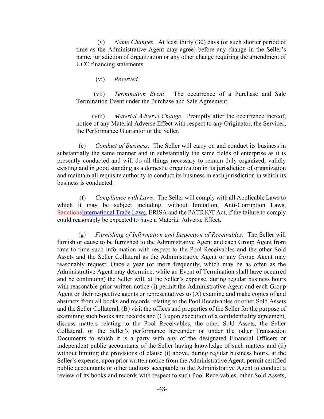 -48- (v) Name Changes. At least thirty (30) days (or such shorter period of time as the Administrative Agent may agree) before any change in the Seller’s name, jurisdiction of organization or any other change requiring the amendment of UCC financing statements. (vi) Reserved. (vii) Termination Event. The occurrence of a Purchase and Sale Termination Event under the Purchase and Sale Agreement. (viii) Material Adverse Change. Promptly after the occurrence thereof, notice of any Material Adverse Effect with respect to any Originator, the Servicer, the Performance Guarantor or the Seller. (e) Conduct of Business. The Seller will carry on and conduct its business in substantially the same manner and in substantially the same fields of enterprise as it is presently conducted and will do all things necessary to remain duly organized, validly existing and in good standing as a domestic organization in its jurisdiction of organization and maintain all requisite authority to conduct its business in each jurisdiction in which its business is conducted. (f) Compliance with Laws. The Seller will comply with all Applicable Laws to which it may be subject including, without limitation, Anti-Corruption Laws, SanctionsInternational Trade Laws, ERISA and the PATRIOT Act, if the failure to comply could reasonably be expected to have a Material Adverse Effect. (g) Furnishing of Information and Inspection of Receivables. The Seller will furnish or cause to be furnished to the Administrative Agent and each Group Agent from time to time such information with respect to the Pool Receivables and the other Sold Assets and the Seller Collateral as the Administrative Agent or any Group Agent may reasonably request. Once a year (or more frequently, which may be as often as the Administrative Agent may determine, while an Event of Termination shall have occurred and be continuing) the Seller will, at the Seller’s expense, during regular business hours with reasonable prior written notice (i) permit the Administrative Agent and each Group Agent or their respective agents or representatives to (A) examine and make copies of and abstracts from all books and records relating to the Pool Receivables or other Sold Assets and the Seller Collateral, (B) visit the offices and properties of the Seller for the purpose of examining such books and records and (C) upon execution of a confidentiality agreement, discuss matters relating to the Pool Receivables, the other Sold Assets, the Seller Collateral, or the Seller’s performance hereunder or under the other Transaction Documents to which it is a party with any of the designated Financial Officers or independent public accountants of the Seller having knowledge of such matters and (ii) without limiting the provisions of clause (i) above, during regular business hours, at the Seller’s expense, upon prior written notice from the Administrative Agent, permit certified public accountants or other auditors acceptable to the Administrative Agent to conduct a review of its books and records with respect to such Pool Receivables, other Sold Assets,