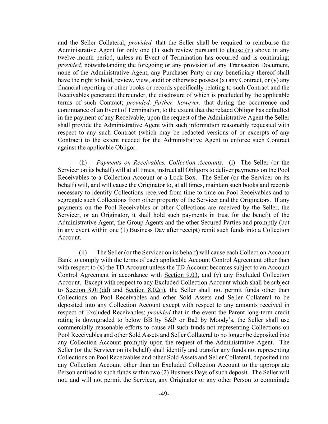 -49- and the Seller Collateral; provided, that the Seller shall be required to reimburse the Administrative Agent for only one (1) such review pursuant to clause (ii) above in any twelve-month period, unless an Event of Termination has occurred and is continuing; provided, notwithstanding the foregoing or any provision of any Transaction Document, none of the Administrative Agent, any Purchaser Party or any beneficiary thereof shall have the right to hold, review, view, audit or otherwise possess (x) any Contract, or (y) any financial reporting or other books or records specifically relating to such Contract and the Receivables generated thereunder, the disclosure of which is precluded by the applicable terms of such Contract; provided, further, however, that during the occurrence and continuance of an Event of Termination, to the extent that the related Obligor has defaulted in the payment of any Receivable, upon the request of the Administrative Agent the Seller shall provide the Administrative Agent with such information reasonably requested with respect to any such Contract (which may be redacted versions of or excerpts of any Contract) to the extent needed for the Administrative Agent to enforce such Contract against the applicable Obligor. (h) Payments on Receivables, Collection Accounts. (i) The Seller (or the Servicer on its behalf) will at all times, instruct all Obligors to deliver payments on the Pool Receivables to a Collection Account or a Lock-Box. The Seller (or the Servicer on its behalf) will, and will cause the Originator to, at all times, maintain such books and records necessary to identify Collections received from time to time on Pool Receivables and to segregate such Collections from other property of the Servicer and the Originators. If any payments on the Pool Receivables or other Collections are received by the Seller, the Servicer, or an Originator, it shall hold such payments in trust for the benefit of the Administrative Agent, the Group Agents and the other Secured Parties and promptly (but in any event within one (1) Business Day after receipt) remit such funds into a Collection Account. (ii) The Seller (or the Servicer on its behalf) will cause each Collection Account Bank to comply with the terms of each applicable Account Control Agreement other than with respect to (x) the TD Account unless the TD Account becomes subject to an Account Control Agreement in accordance with Section 9.03, and (y) any Excluded Collection Account. Except with respect to any Excluded Collection Account which shall be subject to Section 8.01(dd) and Section 8.02(j), the Seller shall not permit funds other than Collections on Pool Receivables and other Sold Assets and Seller Collateral to be deposited into any Collection Account except with respect to any amounts received in respect of Excluded Receivables; provided that in the event the Parent long-term credit rating is downgraded to below BB by S&P or Ba2 by Moody’s, the Seller shall use commercially reasonable efforts to cause all such funds not representing Collections on Pool Receivables and other Sold Assets and Seller Collateral to no longer be deposited into any Collection Account promptly upon the request of the Administrative Agent. The Seller (or the Servicer on its behalf) shall identify and transfer any funds not representing Collections on Pool Receivables and other Sold Assets and Seller Collateral, deposited into any Collection Account other than an Excluded Collection Account to the appropriate Person entitled to such funds within two (2) Business Days of such deposit. The Seller will not, and will not permit the Servicer, any Originator or any other Person to commingle