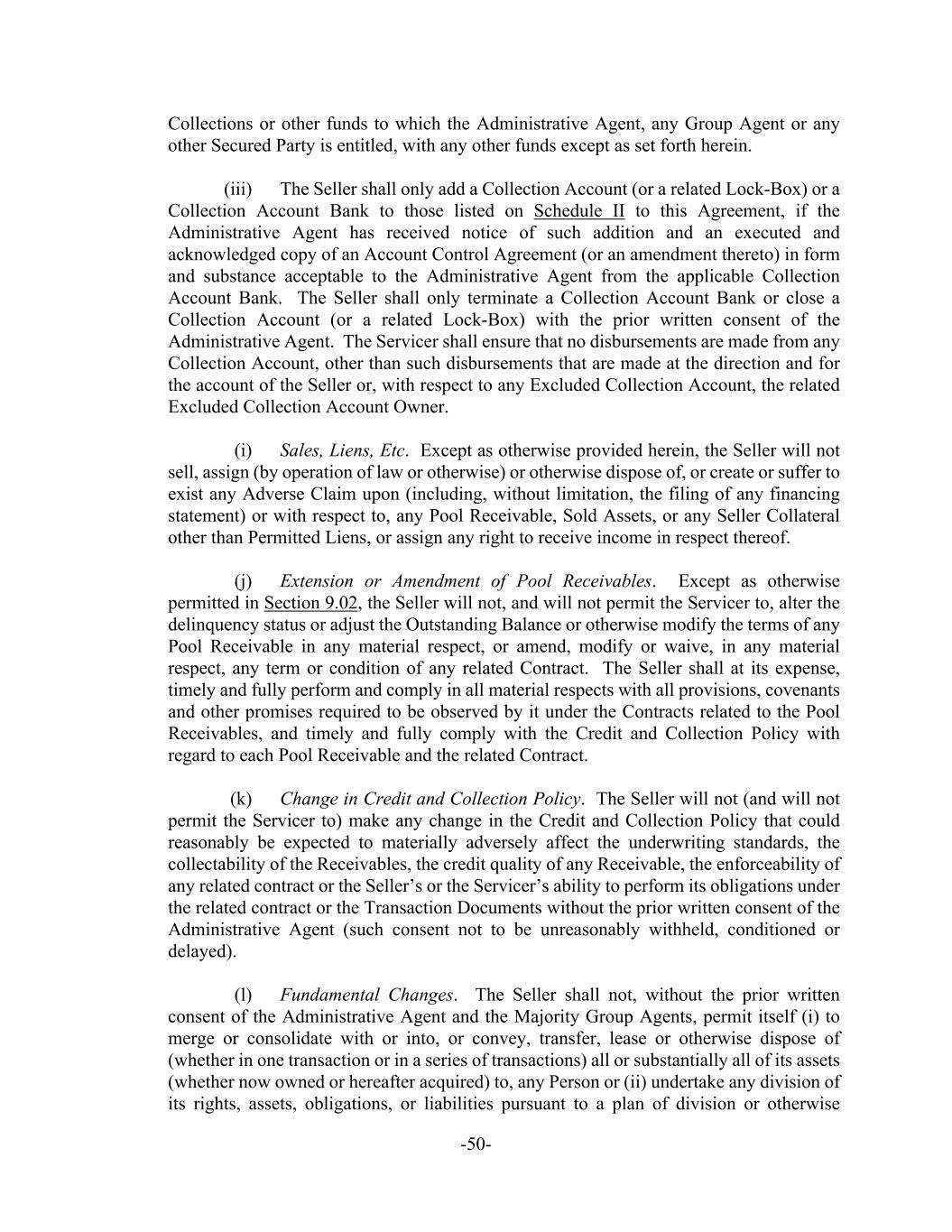 -50- Collections or other funds to which the Administrative Agent, any Group Agent or any other Secured Party is entitled, with any other funds except as set forth herein. (iii) The Seller shall only add a Collection Account (or a related Lock-Box) or a Collection Account Bank to those listed on Schedule II to this Agreement, if the Administrative Agent has received notice of such addition and an executed and acknowledged copy of an Account Control Agreement (or an amendment thereto) in form and substance acceptable to the Administrative Agent from the applicable Collection Account Bank. The Seller shall only terminate a Collection Account Bank or close a Collection Account (or a related Lock-Box) with the prior written consent of the Administrative Agent. The Servicer shall ensure that no disbursements are made from any Collection Account, other than such disbursements that are made at the direction and for the account of the Seller or, with respect to any Excluded Collection Account, the related Excluded Collection Account Owner. (i) Sales, Liens, Etc. Except as otherwise provided herein, the Seller will not sell, assign (by operation of law or otherwise) or otherwise dispose of, or create or suffer to exist any Adverse Claim upon (including, without limitation, the filing of any financing statement) or with respect to, any Pool Receivable, Sold Assets, or any Seller Collateral other than Permitted Liens, or assign any right to receive income in respect thereof. (j) Extension or Amendment of Pool Receivables. Except as otherwise permitted in Section 9.02, the Seller will not, and will not permit the Servicer to, alter the delinquency status or adjust the Outstanding Balance or otherwise modify the terms of any Pool Receivable in any material respect, or amend, modify or waive, in any material respect, any term or condition of any related Contract. The Seller shall at its expense, timely and fully perform and comply in all material respects with all provisions, covenants and other promises required to be observed by it under the Contracts related to the Pool Receivables, and timely and fully comply with the Credit and Collection Policy with regard to each Pool Receivable and the related Contract. (k) Change in Credit and Collection Policy. The Seller will not (and will not permit the Servicer to) make any change in the Credit and Collection Policy that could reasonably be expected to materially adversely affect the underwriting standards, the collectability of the Receivables, the credit quality of any Receivable, the enforceability of any related contract or the Seller’s or the Servicer’s ability to perform its obligations under the related contract or the Transaction Documents without the prior written consent of the Administrative Agent (such consent not to be unreasonably withheld, conditioned or delayed). (l) Fundamental Changes. The Seller shall not, without the prior written consent of the Administrative Agent and the Majority Group Agents, permit itself (i) to merge or consolidate with or into, or convey, transfer, lease or otherwise dispose of (whether in one transaction or in a series of transactions) all or substantially all of its assets (whether now owned or hereafter acquired) to, any Person or (ii) undertake any division of its rights, assets, obligations, or liabilities pursuant to a plan of division or otherwise