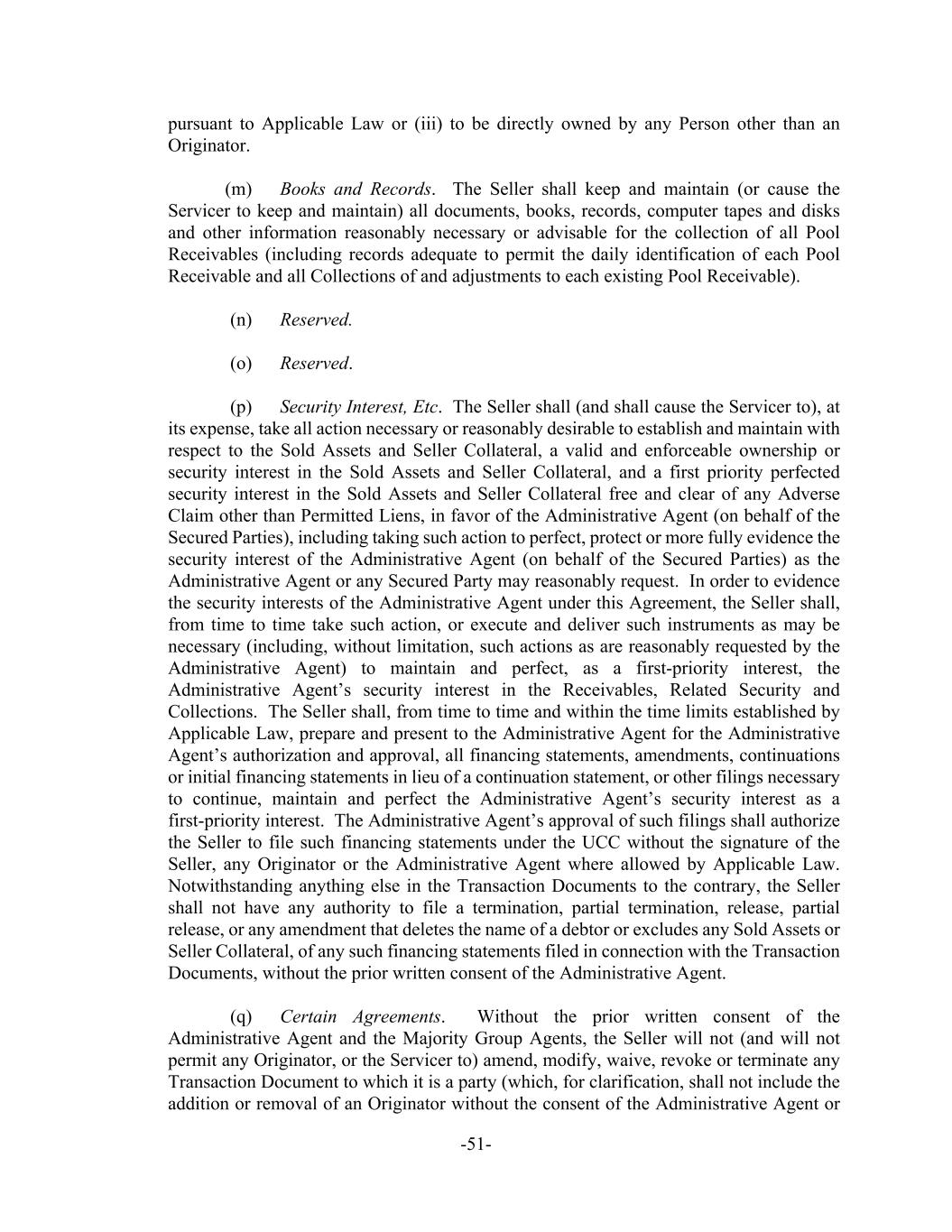 -51- pursuant to Applicable Law or (iii) to be directly owned by any Person other than an Originator. (m) Books and Records. The Seller shall keep and maintain (or cause the Servicer to keep and maintain) all documents, books, records, computer tapes and disks and other information reasonably necessary or advisable for the collection of all Pool Receivables (including records adequate to permit the daily identification of each Pool Receivable and all Collections of and adjustments to each existing Pool Receivable). (n) Reserved. (o) Reserved. (p) Security Interest, Etc. The Seller shall (and shall cause the Servicer to), at its expense, take all action necessary or reasonably desirable to establish and maintain with respect to the Sold Assets and Seller Collateral, a valid and enforceable ownership or security interest in the Sold Assets and Seller Collateral, and a first priority perfected security interest in the Sold Assets and Seller Collateral free and clear of any Adverse Claim other than Permitted Liens, in favor of the Administrative Agent (on behalf of the Secured Parties), including taking such action to perfect, protect or more fully evidence the security interest of the Administrative Agent (on behalf of the Secured Parties) as the Administrative Agent or any Secured Party may reasonably request. In order to evidence the security interests of the Administrative Agent under this Agreement, the Seller shall, from time to time take such action, or execute and deliver such instruments as may be necessary (including, without limitation, such actions as are reasonably requested by the Administrative Agent) to maintain and perfect, as a first-priority interest, the Administrative Agent’s security interest in the Receivables, Related Security and Collections. The Seller shall, from time to time and within the time limits established by Applicable Law, prepare and present to the Administrative Agent for the Administrative Agent’s authorization and approval, all financing statements, amendments, continuations or initial financing statements in lieu of a continuation statement, or other filings necessary to continue, maintain and perfect the Administrative Agent’s security interest as a first-priority interest. The Administrative Agent’s approval of such filings shall authorize the Seller to file such financing statements under the UCC without the signature of the Seller, any Originator or the Administrative Agent where allowed by Applicable Law. Notwithstanding anything else in the Transaction Documents to the contrary, the Seller shall not have any authority to file a termination, partial termination, release, partial release, or any amendment that deletes the name of a debtor or excludes any Sold Assets or Seller Collateral, of any such financing statements filed in connection with the Transaction Documents, without the prior written consent of the Administrative Agent. (q) Certain Agreements. Without the prior written consent of the Administrative Agent and the Majority Group Agents, the Seller will not (and will not permit any Originator, or the Servicer to) amend, modify, waive, revoke or terminate any Transaction Document to which it is a party (which, for clarification, shall not include the addition or removal of an Originator without the consent of the Administrative Agent or