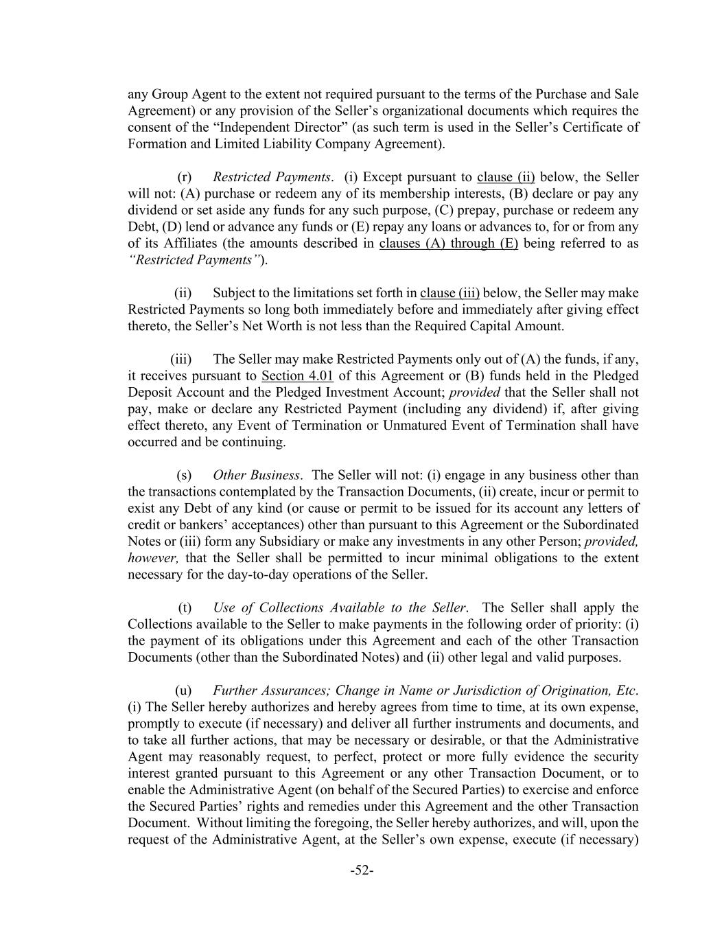 -52- any Group Agent to the extent not required pursuant to the terms of the Purchase and Sale Agreement) or any provision of the Seller’s organizational documents which requires the consent of the “Independent Director” (as such term is used in the Seller’s Certificate of Formation and Limited Liability Company Agreement). (r) Restricted Payments. (i) Except pursuant to clause (ii) below, the Seller will not: (A) purchase or redeem any of its membership interests, (B) declare or pay any dividend or set aside any funds for any such purpose, (C) prepay, purchase or redeem any Debt, (D) lend or advance any funds or (E) repay any loans or advances to, for or from any of its Affiliates (the amounts described in clauses (A) through (E) being referred to as “Restricted Payments”). (ii) Subject to the limitations set forth in clause (iii) below, the Seller may make Restricted Payments so long both immediately before and immediately after giving effect thereto, the Seller’s Net Worth is not less than the Required Capital Amount. (iii) The Seller may make Restricted Payments only out of (A) the funds, if any, it receives pursuant to Section 4.01 of this Agreement or (B) funds held in the Pledged Deposit Account and the Pledged Investment Account; provided that the Seller shall not pay, make or declare any Restricted Payment (including any dividend) if, after giving effect thereto, any Event of Termination or Unmatured Event of Termination shall have occurred and be continuing. (s) Other Business. The Seller will not: (i) engage in any business other than the transactions contemplated by the Transaction Documents, (ii) create, incur or permit to exist any Debt of any kind (or cause or permit to be issued for its account any letters of credit or bankers’ acceptances) other than pursuant to this Agreement or the Subordinated Notes or (iii) form any Subsidiary or make any investments in any other Person; provided, however, that the Seller shall be permitted to incur minimal obligations to the extent necessary for the day-to-day operations of the Seller. (t) Use of Collections Available to the Seller. The Seller shall apply the Collections available to the Seller to make payments in the following order of priority: (i) the payment of its obligations under this Agreement and each of the other Transaction Documents (other than the Subordinated Notes) and (ii) other legal and valid purposes. (u) Further Assurances; Change in Name or Jurisdiction of Origination, Etc. (i) The Seller hereby authorizes and hereby agrees from time to time, at its own expense, promptly to execute (if necessary) and deliver all further instruments and documents, and to take all further actions, that may be necessary or desirable, or that the Administrative Agent may reasonably request, to perfect, protect or more fully evidence the security interest granted pursuant to this Agreement or any other Transaction Document, or to enable the Administrative Agent (on behalf of the Secured Parties) to exercise and enforce the Secured Parties’ rights and remedies under this Agreement and the other Transaction Document. Without limiting the foregoing, the Seller hereby authorizes, and will, upon the request of the Administrative Agent, at the Seller’s own expense, execute (if necessary)