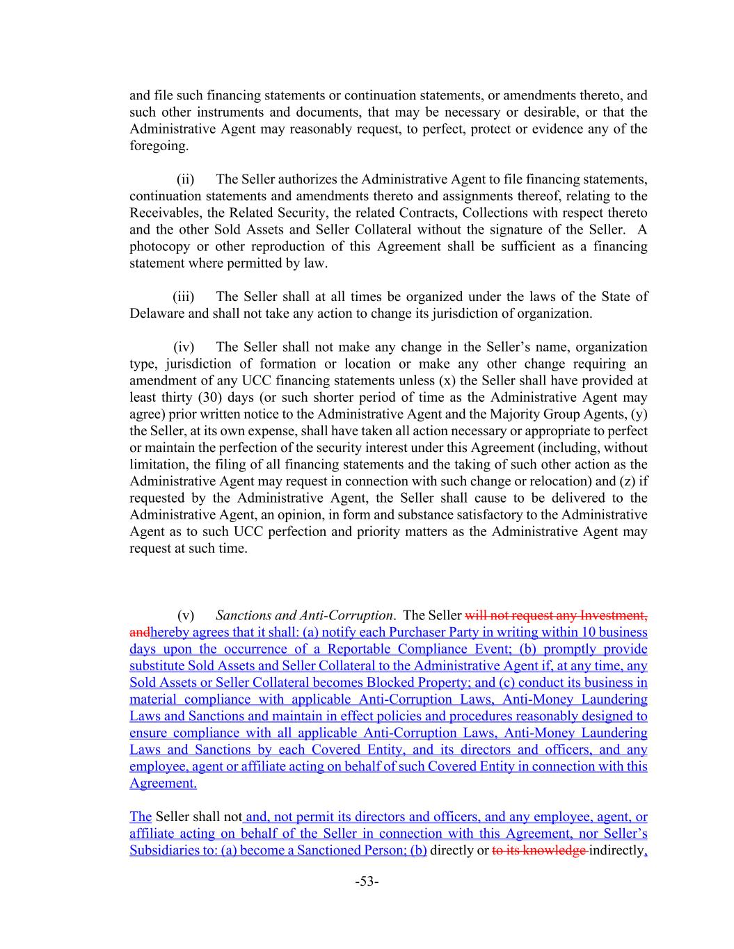 -53- and file such financing statements or continuation statements, or amendments thereto, and such other instruments and documents, that may be necessary or desirable, or that the Administrative Agent may reasonably request, to perfect, protect or evidence any of the foregoing. (ii) The Seller authorizes the Administrative Agent to file financing statements, continuation statements and amendments thereto and assignments thereof, relating to the Receivables, the Related Security, the related Contracts, Collections with respect thereto and the other Sold Assets and Seller Collateral without the signature of the Seller. A photocopy or other reproduction of this Agreement shall be sufficient as a financing statement where permitted by law. (iii) The Seller shall at all times be organized under the laws of the State of Delaware and shall not take any action to change its jurisdiction of organization. (iv) The Seller shall not make any change in the Seller’s name, organization type, jurisdiction of formation or location or make any other change requiring an amendment of any UCC financing statements unless (x) the Seller shall have provided at least thirty (30) days (or such shorter period of time as the Administrative Agent may agree) prior written notice to the Administrative Agent and the Majority Group Agents, (y) the Seller, at its own expense, shall have taken all action necessary or appropriate to perfect or maintain the perfection of the security interest under this Agreement (including, without limitation, the filing of all financing statements and the taking of such other action as the Administrative Agent may request in connection with such change or relocation) and (z) if requested by the Administrative Agent, the Seller shall cause to be delivered to the Administrative Agent, an opinion, in form and substance satisfactory to the Administrative Agent as to such UCC perfection and priority matters as the Administrative Agent may request at such time. (v) Sanctions and Anti-Corruption. The Seller will not request any Investment, andhereby agrees that it shall: (a) notify each Purchaser Party in writing within 10 business days upon the occurrence of a Reportable Compliance Event; (b) promptly provide substitute Sold Assets and Seller Collateral to the Administrative Agent if, at any time, any Sold Assets or Seller Collateral becomes Blocked Property; and (c) conduct its business in material compliance with applicable Anti-Corruption Laws, Anti-Money Laundering Laws and Sanctions and maintain in effect policies and procedures reasonably designed to ensure compliance with all applicable Anti-Corruption Laws, Anti-Money Laundering Laws and Sanctions by each Covered Entity, and its directors and officers, and any employee, agent or affiliate acting on behalf of such Covered Entity in connection with this Agreement. The Seller shall not and, not permit its directors and officers, and any employee, agent, or affiliate acting on behalf of the Seller in connection with this Agreement, nor Seller’s Subsidiaries to: (a) become a Sanctioned Person; (b) directly or to its knowledge indirectly,