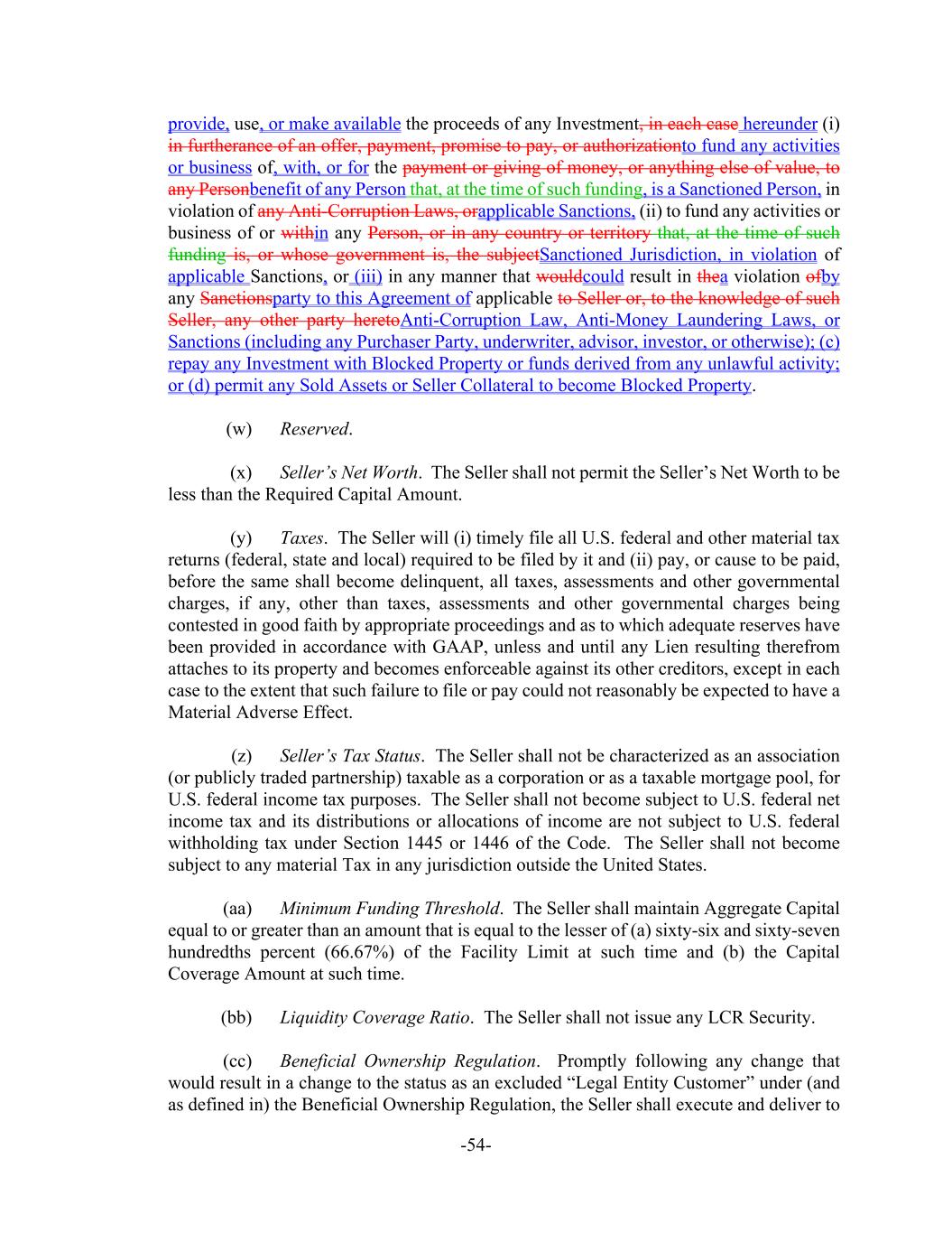 -54- provide, use, or make available the proceeds of any Investment, in each case hereunder (i) in furtherance of an offer, payment, promise to pay, or authorizationto fund any activities or business of, with, or for the payment or giving of money, or anything else of value, to any Personbenefit of any Person that, at the time of such funding, is a Sanctioned Person, in violation of any Anti-Corruption Laws, orapplicable Sanctions, (ii) to fund any activities or business of or within any Person, or in any country or territory that, at the time of such funding is, or whose government is, the subjectSanctioned Jurisdiction, in violation of applicable Sanctions, or (iii) in any manner that wouldcould result in thea violation ofby any Sanctionsparty to this Agreement of applicable to Seller or, to the knowledge of such Seller, any other party heretoAnti-Corruption Law, Anti-Money Laundering Laws, or Sanctions (including any Purchaser Party, underwriter, advisor, investor, or otherwise); (c) repay any Investment with Blocked Property or funds derived from any unlawful activity; or (d) permit any Sold Assets or Seller Collateral to become Blocked Property. (w) Reserved. (x) Seller’s Net Worth. The Seller shall not permit the Seller’s Net Worth to be less than the Required Capital Amount. (y) Taxes. The Seller will (i) timely file all U.S. federal and other material tax returns (federal, state and local) required to be filed by it and (ii) pay, or cause to be paid, before the same shall become delinquent, all taxes, assessments and other governmental charges, if any, other than taxes, assessments and other governmental charges being contested in good faith by appropriate proceedings and as to which adequate reserves have been provided in accordance with GAAP, unless and until any Lien resulting therefrom attaches to its property and becomes enforceable against its other creditors, except in each case to the extent that such failure to file or pay could not reasonably be expected to have a Material Adverse Effect. (z) Seller’s Tax Status. The Seller shall not be characterized as an association (or publicly traded partnership) taxable as a corporation or as a taxable mortgage pool, for U.S. federal income tax purposes. The Seller shall not become subject to U.S. federal net income tax and its distributions or allocations of income are not subject to U.S. federal withholding tax under Section 1445 or 1446 of the Code. The Seller shall not become subject to any material Tax in any jurisdiction outside the United States. (aa) Minimum Funding Threshold. The Seller shall maintain Aggregate Capital equal to or greater than an amount that is equal to the lesser of (a) sixty-six and sixty-seven hundredths percent (66.67%) of the Facility Limit at such time and (b) the Capital Coverage Amount at such time. (bb) Liquidity Coverage Ratio. The Seller shall not issue any LCR Security. (cc) Beneficial Ownership Regulation. Promptly following any change that would result in a change to the status as an excluded “Legal Entity Customer” under (and as defined in) the Beneficial Ownership Regulation, the Seller shall execute and deliver to