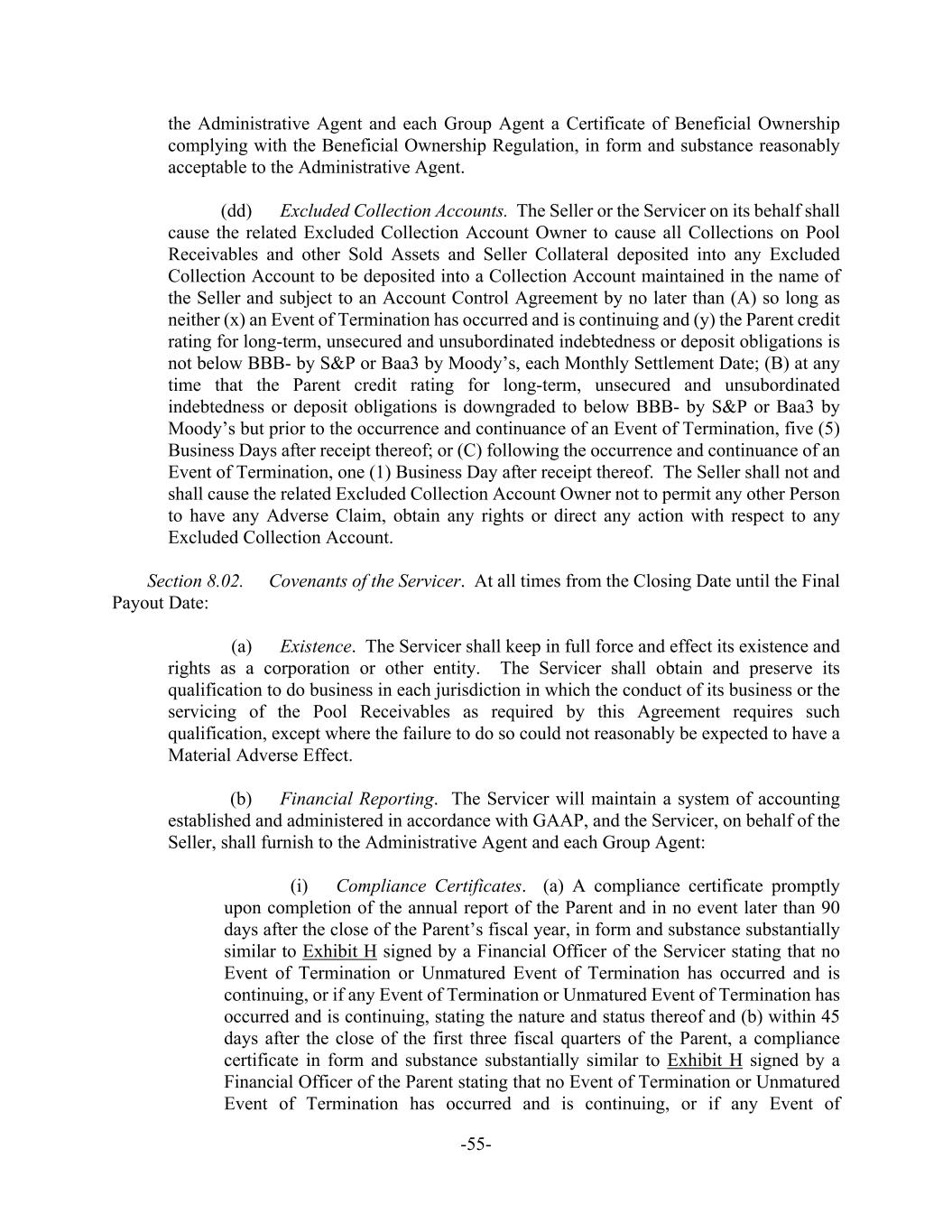 -55- the Administrative Agent and each Group Agent a Certificate of Beneficial Ownership complying with the Beneficial Ownership Regulation, in form and substance reasonably acceptable to the Administrative Agent. (dd) Excluded Collection Accounts. The Seller or the Servicer on its behalf shall cause the related Excluded Collection Account Owner to cause all Collections on Pool Receivables and other Sold Assets and Seller Collateral deposited into any Excluded Collection Account to be deposited into a Collection Account maintained in the name of the Seller and subject to an Account Control Agreement by no later than (A) so long as neither (x) an Event of Termination has occurred and is continuing and (y) the Parent credit rating for long-term, unsecured and unsubordinated indebtedness or deposit obligations is not below BBB- by S&P or Baa3 by Moody’s, each Monthly Settlement Date; (B) at any time that the Parent credit rating for long-term, unsecured and unsubordinated indebtedness or deposit obligations is downgraded to below BBB- by S&P or Baa3 by Moody’s but prior to the occurrence and continuance of an Event of Termination, five (5) Business Days after receipt thereof; or (C) following the occurrence and continuance of an Event of Termination, one (1) Business Day after receipt thereof. The Seller shall not and shall cause the related Excluded Collection Account Owner not to permit any other Person to have any Adverse Claim, obtain any rights or direct any action with respect to any Excluded Collection Account. Section 8.02. Covenants of the Servicer. At all times from the Closing Date until the Final Payout Date: (a) Existence. The Servicer shall keep in full force and effect its existence and rights as a corporation or other entity. The Servicer shall obtain and preserve its qualification to do business in each jurisdiction in which the conduct of its business or the servicing of the Pool Receivables as required by this Agreement requires such qualification, except where the failure to do so could not reasonably be expected to have a Material Adverse Effect. (b) Financial Reporting. The Servicer will maintain a system of accounting established and administered in accordance with GAAP, and the Servicer, on behalf of the Seller, shall furnish to the Administrative Agent and each Group Agent: (i) Compliance Certificates. (a) A compliance certificate promptly upon completion of the annual report of the Parent and in no event later than 90 days after the close of the Parent’s fiscal year, in form and substance substantially similar to Exhibit H signed by a Financial Officer of the Servicer stating that no Event of Termination or Unmatured Event of Termination has occurred and is continuing, or if any Event of Termination or Unmatured Event of Termination has occurred and is continuing, stating the nature and status thereof and (b) within 45 days after the close of the first three fiscal quarters of the Parent, a compliance certificate in form and substance substantially similar to Exhibit H signed by a Financial Officer of the Parent stating that no Event of Termination or Unmatured Event of Termination has occurred and is continuing, or if any Event of