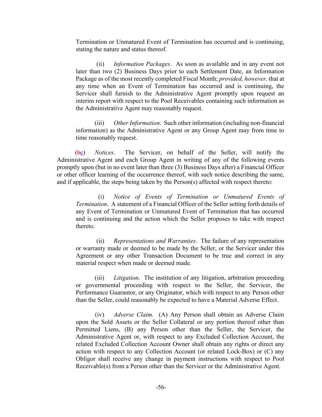 -56- Termination or Unmatured Event of Termination has occurred and is continuing, stating the nature and status thereof. (ii) Information Packages. As soon as available and in any event not later than two (2) Business Days prior to each Settlement Date, an Information Package as of the most recently completed Fiscal Month; provided, however, that at any time when an Event of Termination has occurred and is continuing, the Servicer shall furnish to the Administrative Agent promptly upon request an interim report with respect to the Pool Receivables containing such information as the Administrative Agent may reasonably request. (iii) Other Information. Such other information (including non-financial information) as the Administrative Agent or any Group Agent may from time to time reasonably request. (bc) Notices. The Servicer, on behalf of the Seller, will notify the Administrative Agent and each Group Agent in writing of any of the following events promptly upon (but in no event later than three (3) Business Days after) a Financial Officer or other officer learning of the occurrence thereof, with such notice describing the same, and if applicable, the steps being taken by the Person(s) affected with respect thereto: (i) Notice of Events of Termination or Unmatured Events of Termination. A statement of a Financial Officer of the Seller setting forth details of any Event of Termination or Unmatured Event of Termination that has occurred and is continuing and the action which the Seller proposes to take with respect thereto. (ii) Representations and Warranties. The failure of any representation or warranty made or deemed to be made by the Seller, or the Servicer under this Agreement or any other Transaction Document to be true and correct in any material respect when made or deemed made. (iii) Litigation. The institution of any litigation, arbitration proceeding or governmental proceeding with respect to the Seller, the Servicer, the Performance Guarantor, or any Originator, which with respect to any Person other than the Seller, could reasonably be expected to have a Material Adverse Effect. (iv) Adverse Claim. (A) Any Person shall obtain an Adverse Claim upon the Sold Assets or the Seller Collateral or any portion thereof other than Permitted Liens, (B) any Person other than the Seller, the Servicer, the Administrative Agent or, with respect to any Excluded Collection Account, the related Excluded Collection Account Owner shall obtain any rights or direct any action with respect to any Collection Account (or related Lock-Box) or (C) any Obligor shall receive any change in payment instructions with respect to Pool Receivable(s) from a Person other than the Servicer or the Administrative Agent.